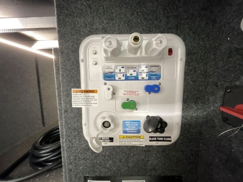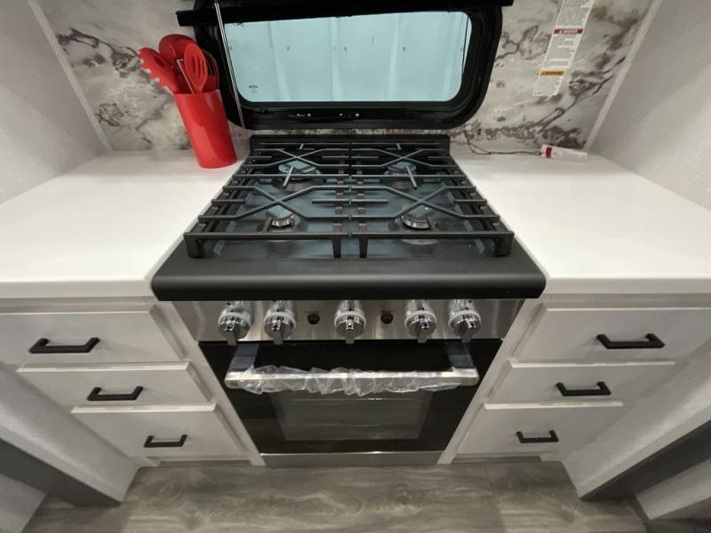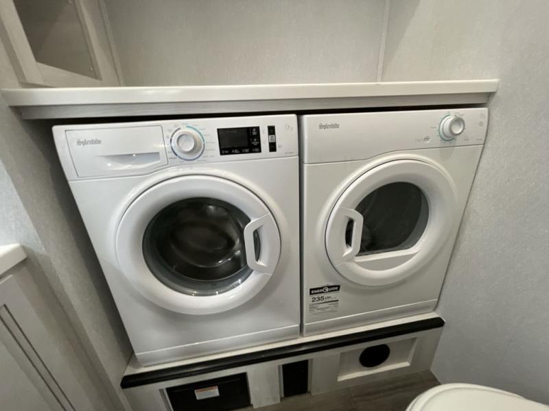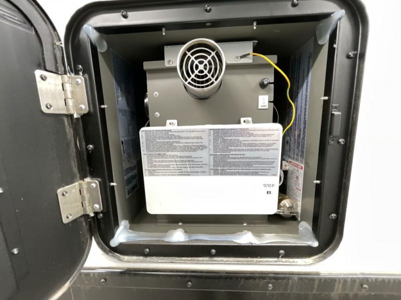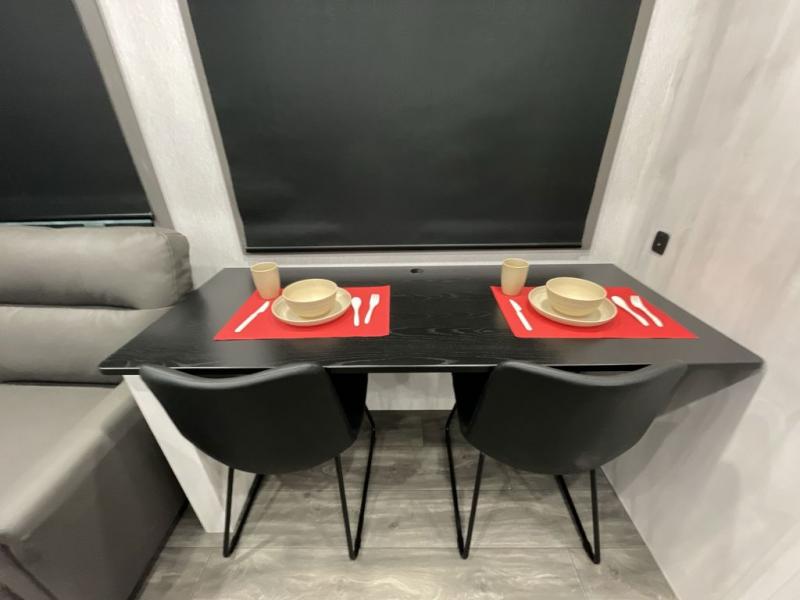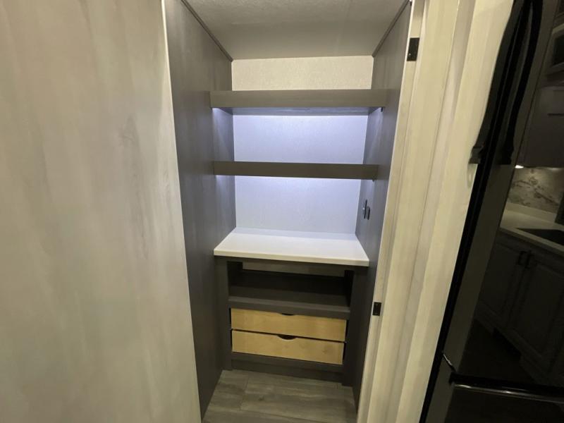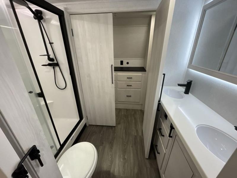 The spacious rear kitchen is equipped with a 30” microwave, 24” residential oven, overhead cabinets, breakfast bar with bar stools, walk-in pantry, and 16 cu. ft. refrigerator, perfect for cooking all your favorite dishes with the greatest convenience The living room is the heart of the home, featuring a desk with chairs, theater seating, two 60” trifold sofas, a TV with fireplace, and more. And when nature calls, you'll appreciate the convenient half bath with overhead cabinets and washer and dryer prep. The main bedroom is a serene retreat, featuring a king bed, drawers under the bed, a bedroom fireplace, and more. This is the perfect place to relax and recharge after a long day of adventure, and with a front full bathroom featuring a 30” x 40” shower, dual sink vanity, walk-in closet, dresser/drawers, you'll have everything you need to stay clean and comfortable on the go. Outside, you'll find not one, but two awnings to providing plenty of shade and protection from the elements.