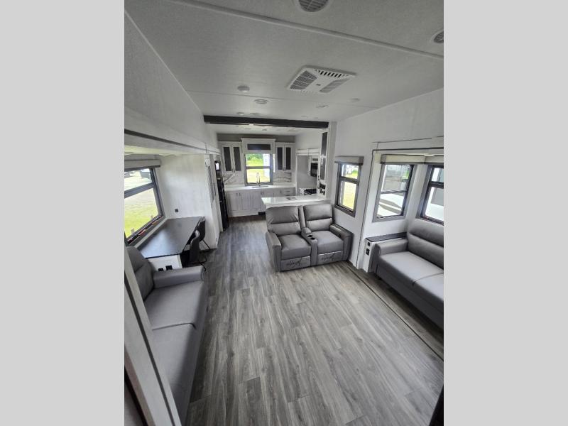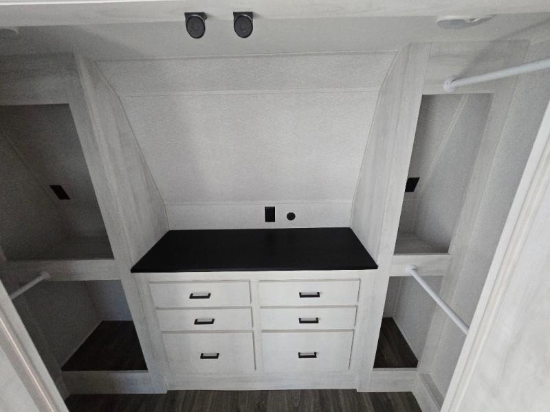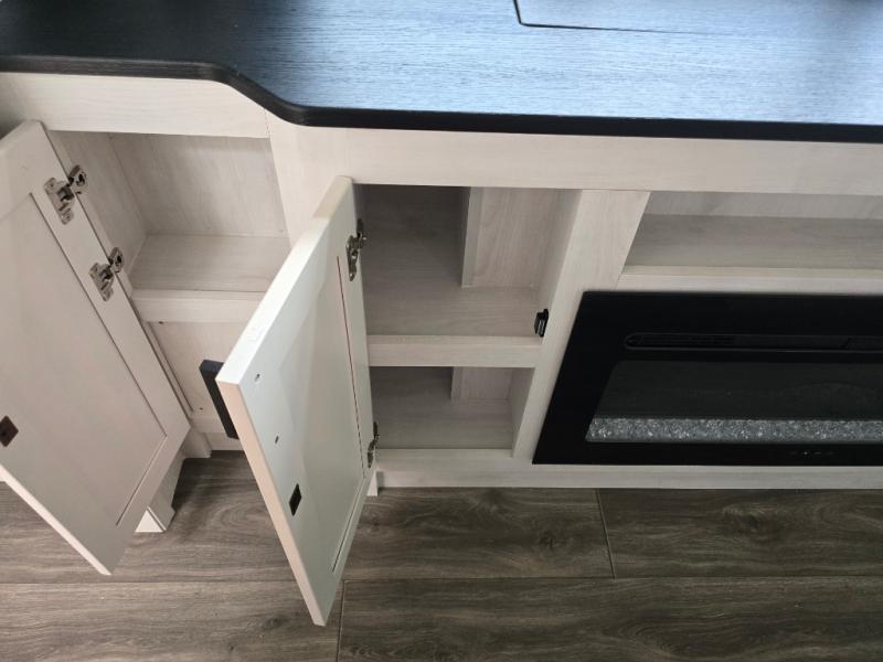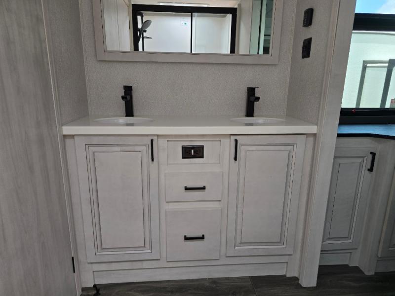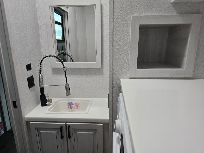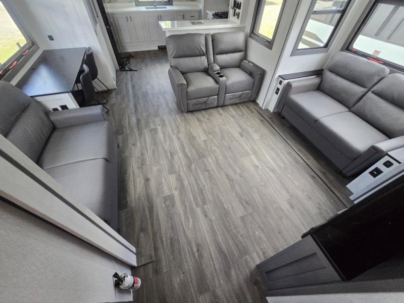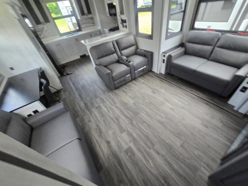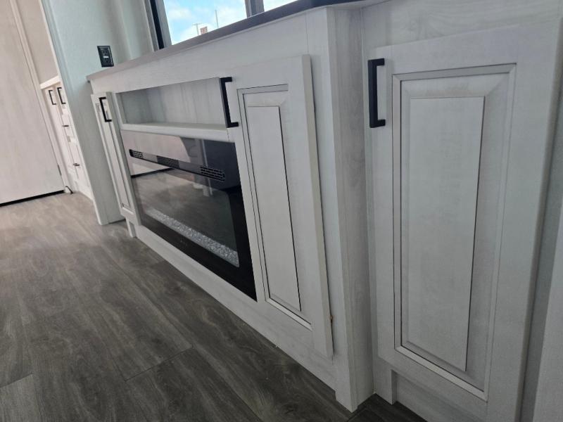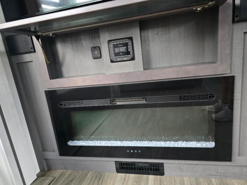 The spacious rear kitchen is, equipped with a 30” microwave, 24” residential oven, overhead cabinets, breakfast bar with bar stools, walk-in pantry, and 16 cu refrigerator, perfect for cooking all your favorite dishes with the greatest convenience The living room is the heart of the home, featuring a desk with chairs, theater seating, two 60” trifold sofas, a TV with fireplace, and more—the perfect place to relax and unwind after a long day of adventure. And when nature calls, you'll appreciate the convenient half bath with overhead cabinets. Plus, with the pull-out closet and ample storage space throughout, you'll have everything you need to stay organized and comfortable on the go. The main bedroom is a serene retreat, featuring a king bed, drawers under the bed, a TV with fireplace, and more. The perfect place to relax and recharge after a long day of adventure, and with a front full bathroom featuring a 30” x 40” shower, dual sink, walk-in closet, dresser/drawer, and more, you'll have everything you need to stay clean and comfortable on the go. Outside, you'll find not one, but two awnings - 16’ and 18’ - providing plenty of shade and protection from the elements.
