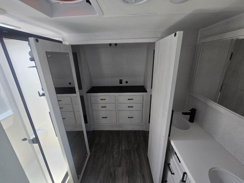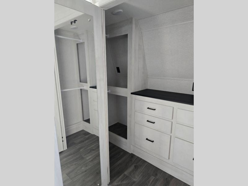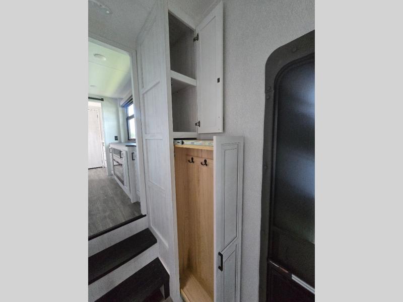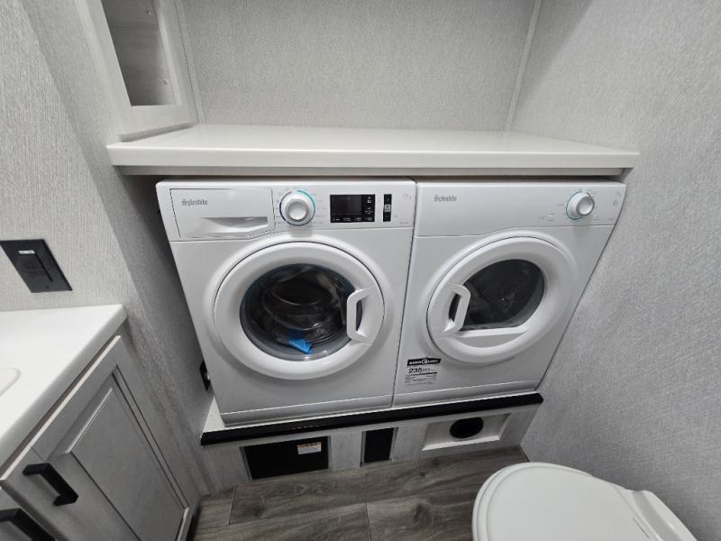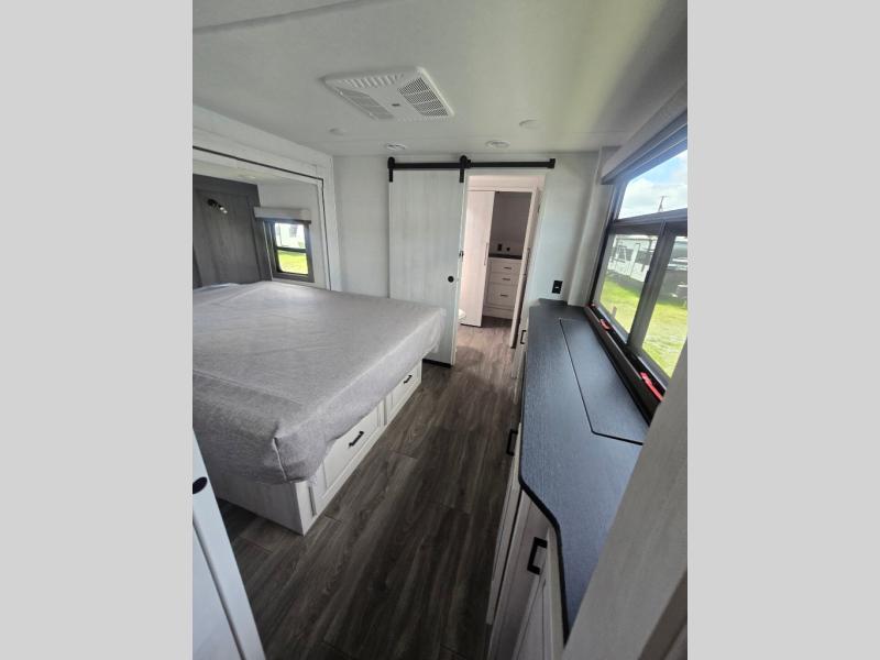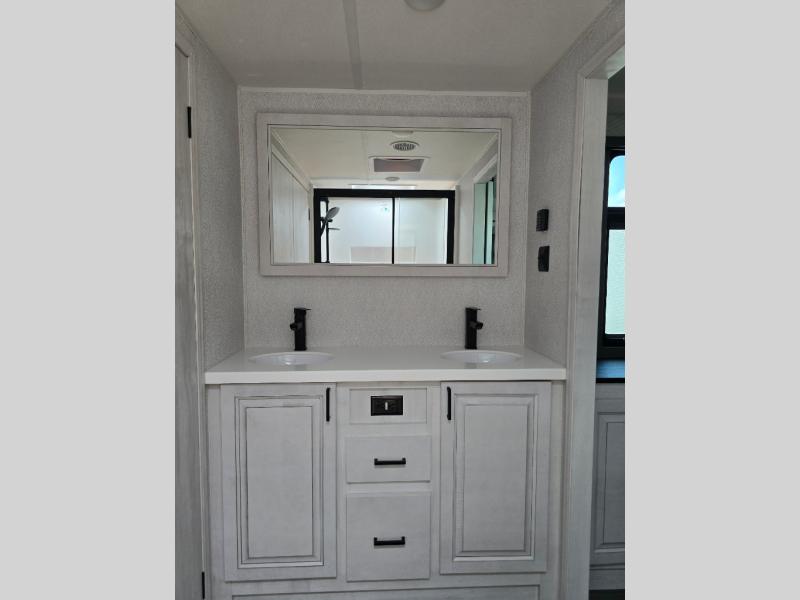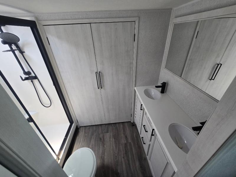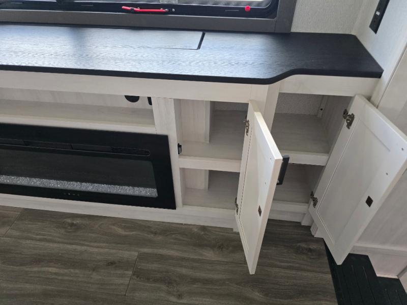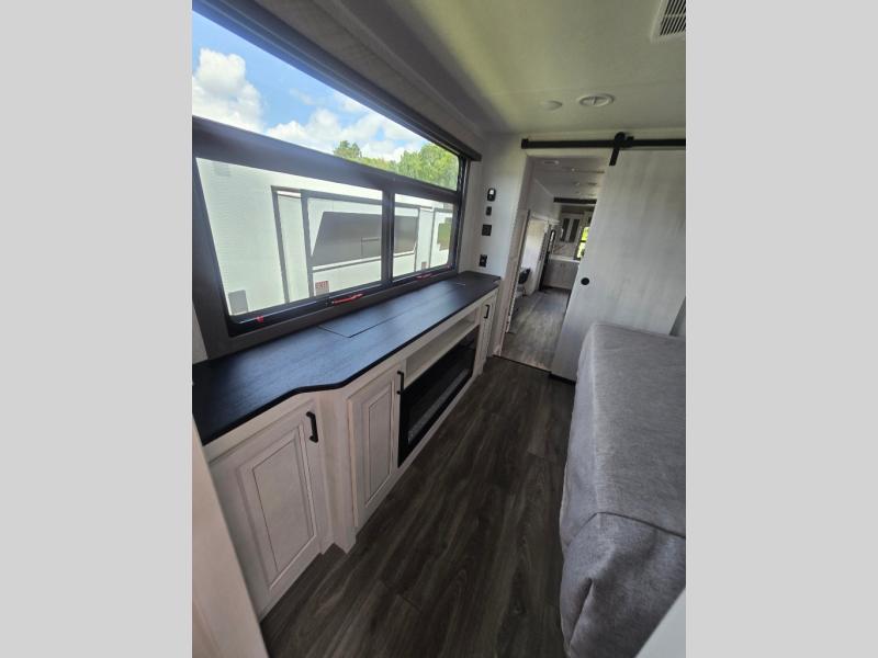 The spacious rear kitchen is, equipped with a 30” microwave, 24” residential oven, overhead cabinets, breakfast bar with bar stools, walk-in pantry, and 16 cu refrigerator, perfect for cooking all your favorite dishes with the greatest convenience The living room is the heart of the home, featuring a desk with chairs, theater seating, two 60” trifold sofas, a TV with fireplace, and more—the perfect place to relax and unwind after a long day of adventure. And when nature calls, you'll appreciate the convenient half bath with overhead cabinets. Plus, with the pull-out closet and ample storage space throughout, you'll have everything you need to stay organized and comfortable on the go. The main bedroom is a serene retreat, featuring a king bed, drawers under the bed, a TV with fireplace, and more. The perfect place to relax and recharge after a long day of adventure, and with a front full bathroom featuring a 30” x 40” shower, dual sink, walk-in closet, dresser/drawer, and more, you'll have everything you need to stay clean and comfortable on the go. Outside, you'll find not one, but two awnings - 16’ and 18’ - providing plenty of shade and protection from the elements.
