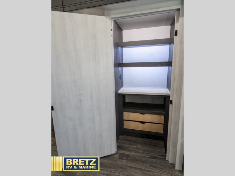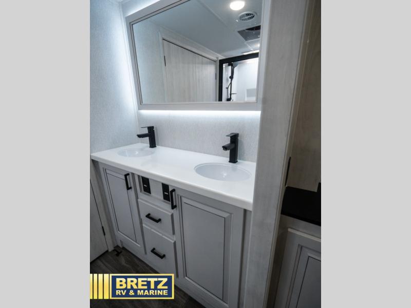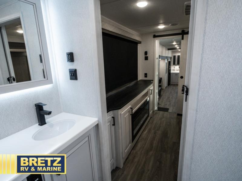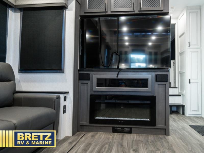 The spacious rear kitchen is, equipped with a 30” microwave, 24” residential oven, overhead cabinets, breakfast bar with bar stools, walk-in pantry, and 16 cu refrigerator, perfect for cooking all your favorite dishes with the greatest convenience The living room is the heart of the home, featuring a desk with chairs, theater seating, two 60” trifold sofas, a TV with fireplace, and more—the perfect place to relax and unwind after a long day of adventure. And when nature calls, you'll appreciate the convenient half bath with overhead cabinets. Plus, with the pull-out closet and ample storage space throughout, you'll have everything you need to stay organized and comfortable on the go. The main bedroom is a serene retreat, featuring a king bed, drawers under the bed, a TV with fireplace, and more. The perfect place to relax and recharge after a long day of adventure, and with a front full bathroom featuring a 30” x 40” shower, dual sink, walk-in closet, dresser/drawer, and more, you'll have everything you need to stay clean and comfortable on the go. Outside, you'll find not one, but two awnings - 16’ and 18’ - providing plenty of shade and protection from the elements.