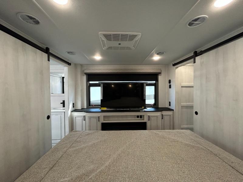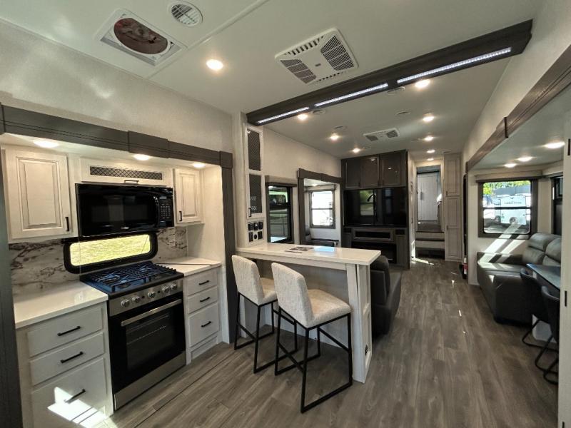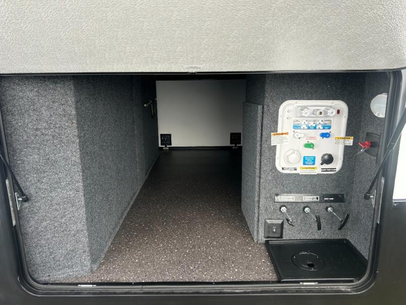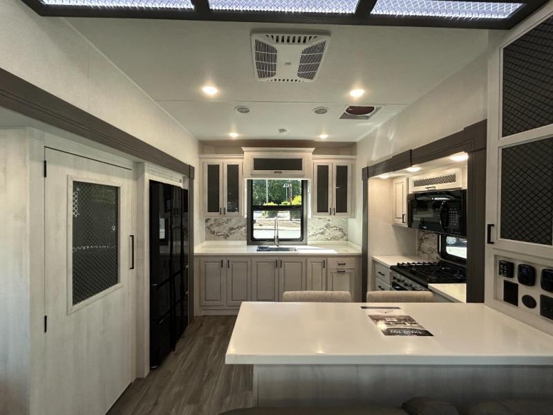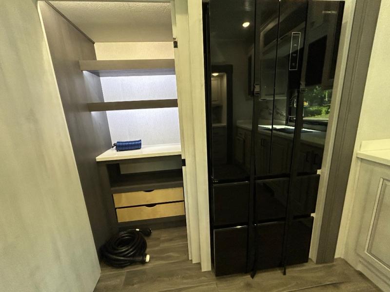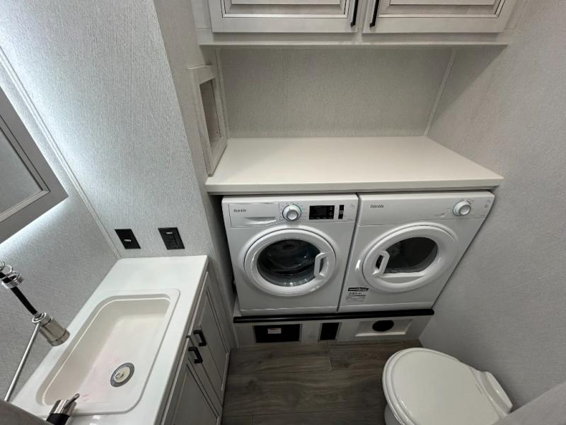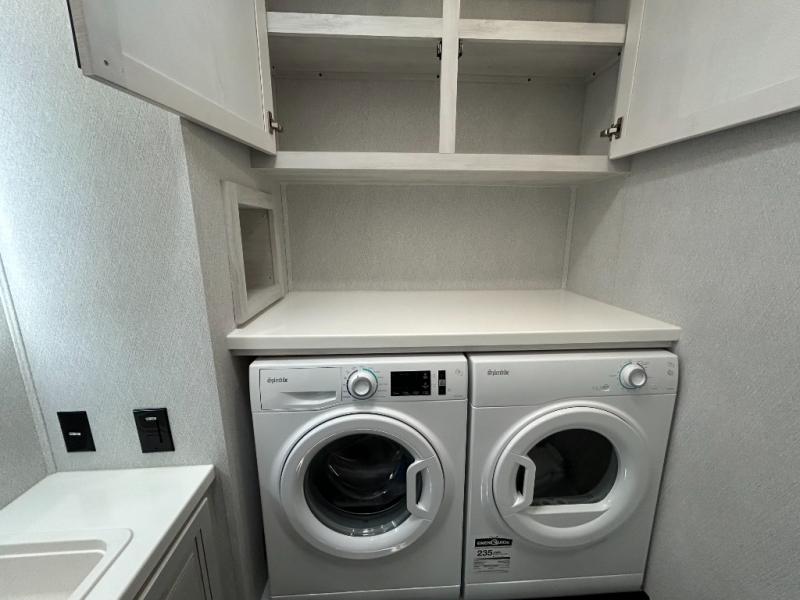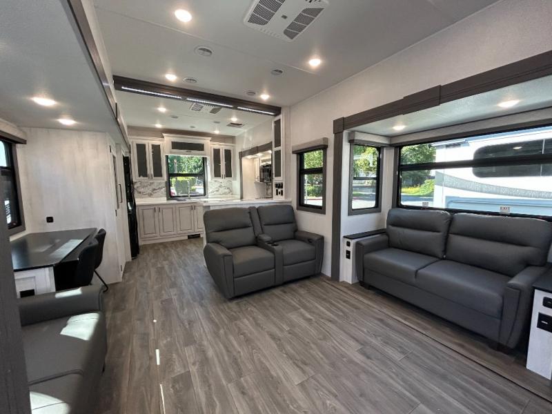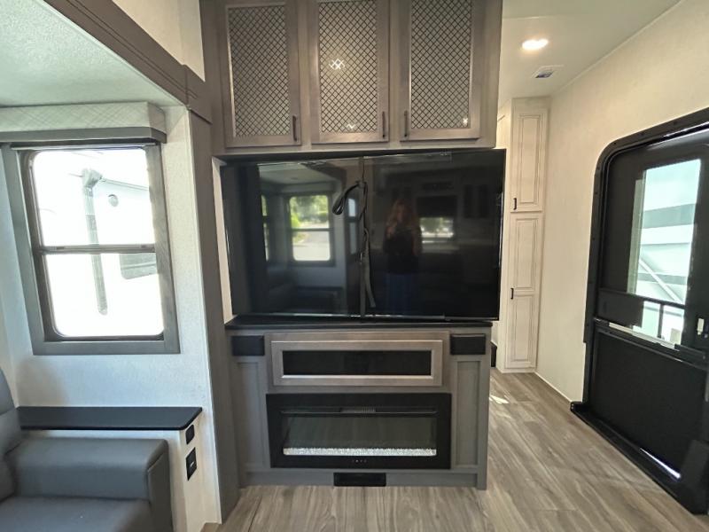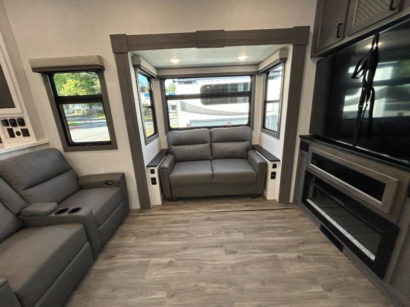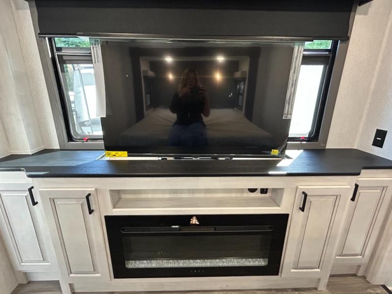 The spacious rear kitchen is equipped with a 30” microwave, 24” residential oven, overhead cabinets, breakfast bar with bar stools, walk-in pantry, and 16 cu. ft. refrigerator, perfect for cooking all your favorite dishes with the greatest convenience The living room is the heart of the home, featuring a desk with chairs, theater seating, two 60” trifold sofas, a TV with fireplace, and more. And when nature calls, you'll appreciate the convenient half bath with overhead cabinets and washer and dryer prep. The main bedroom is a serene retreat, featuring a king bed, drawers under the bed, a bedroom fireplace, and more. This is the perfect place to relax and recharge after a long day of adventure, and with a front full bathroom featuring a 30” x 40” shower, dual sink vanity, walk-in closet, dresser/drawers, you'll have everything you need to stay clean and comfortable on the go. Outside, you'll find not one, but two awnings to providing plenty of shade and protection from the elements.