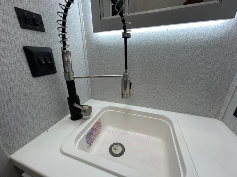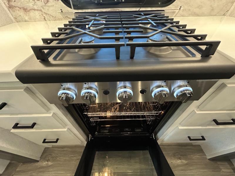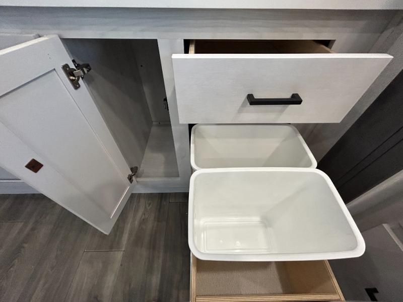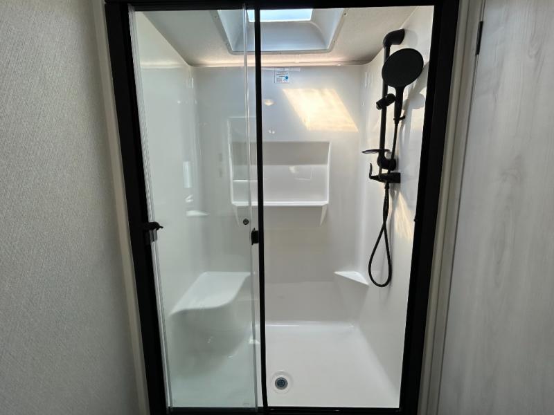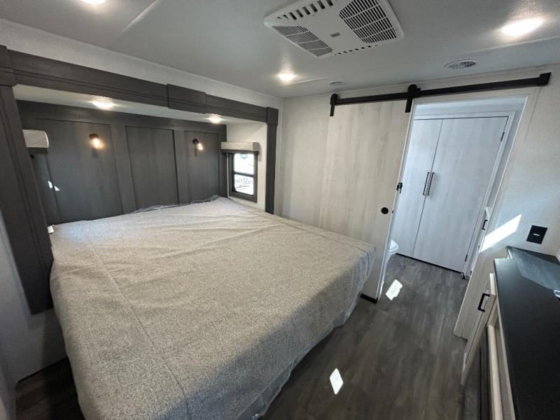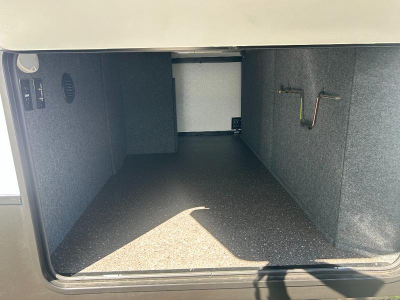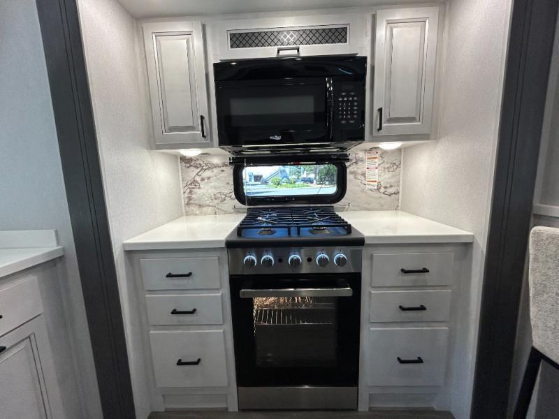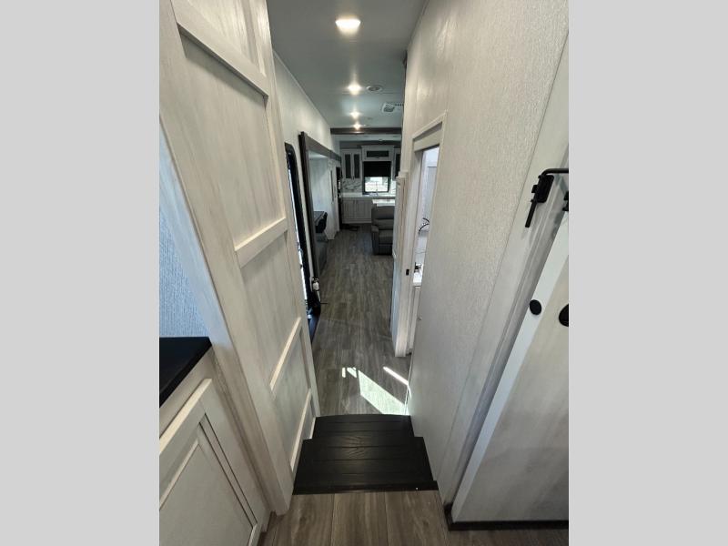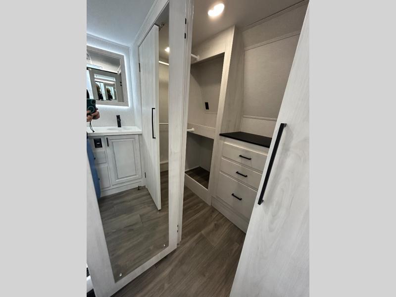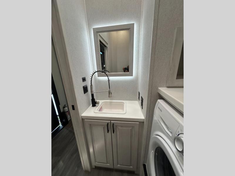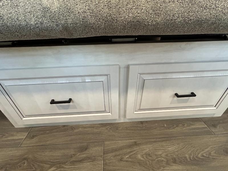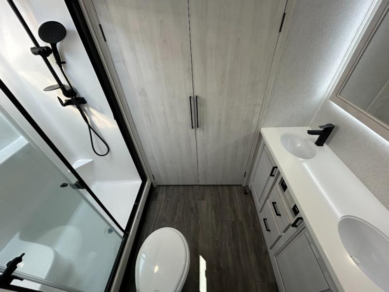 The spacious rear kitchen is equipped with a 30” microwave, 24” residential oven, overhead cabinets, breakfast bar with bar stools, walk-in pantry, and 16 cu. ft. refrigerator, perfect for cooking all your favorite dishes with the greatest convenience The living room is the heart of the home, featuring a desk with chairs, theater seating, two 60” trifold sofas, a TV with fireplace, and more. And when nature calls, you'll appreciate the convenient half bath with overhead cabinets and washer and dryer prep. The main bedroom is a serene retreat, featuring a king bed, drawers under the bed, a bedroom fireplace, and more. This is the perfect place to relax and recharge after a long day of adventure, and with a front full bathroom featuring a 30” x 40” shower, dual sink vanity, walk-in closet, dresser/drawers, you'll have everything you need to stay clean and comfortable on the go. Outside, you'll find not one, but two awnings to providing plenty of shade and protection from the elements.