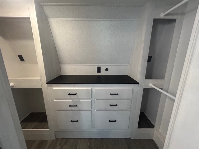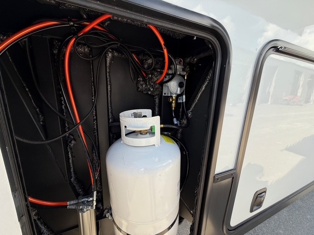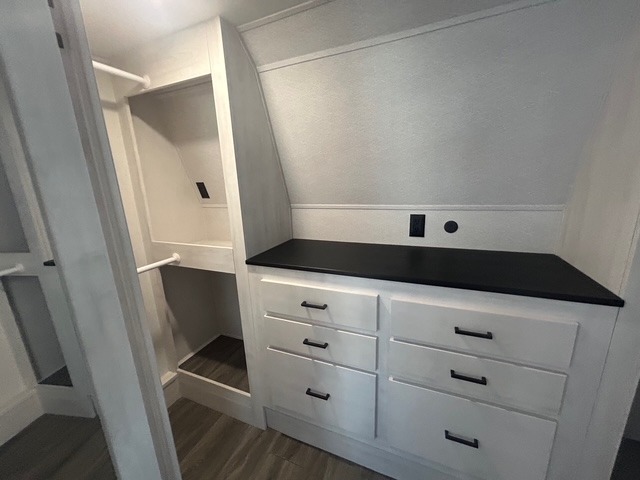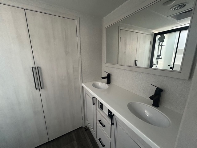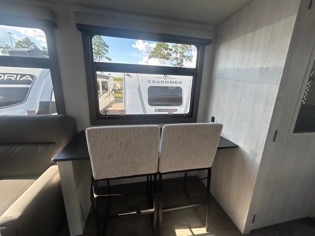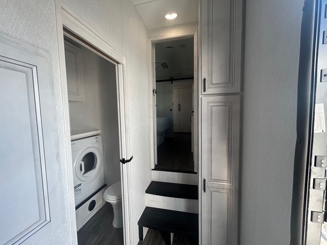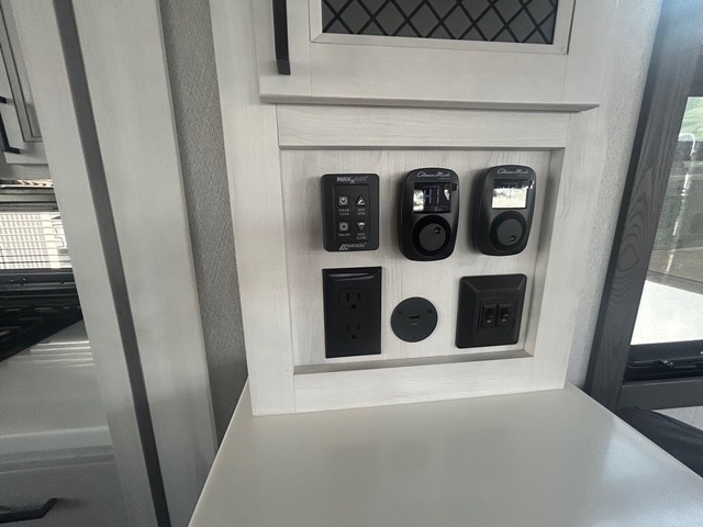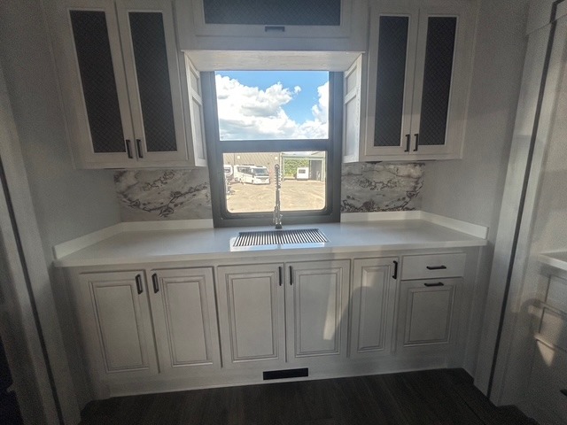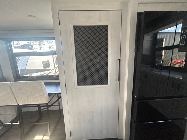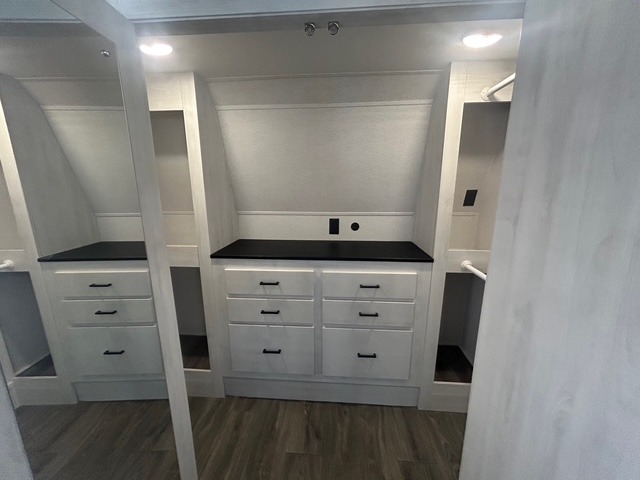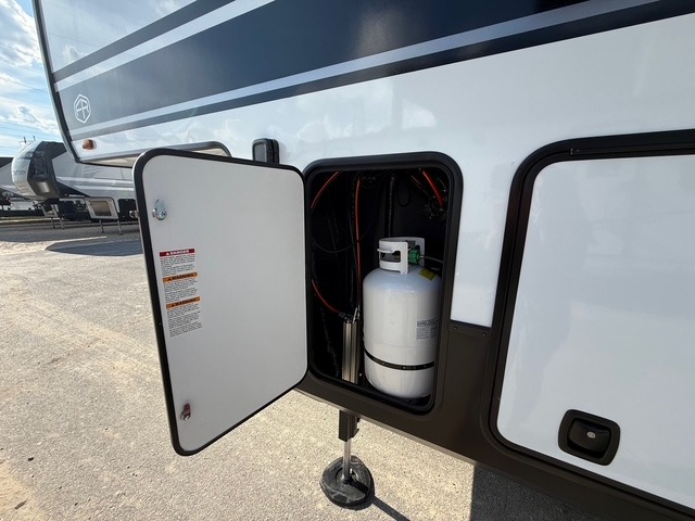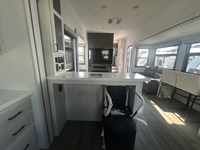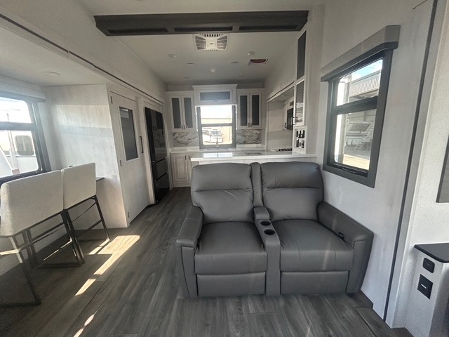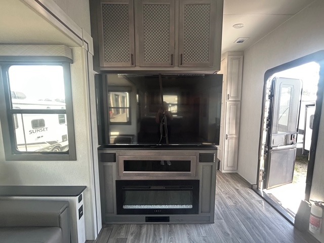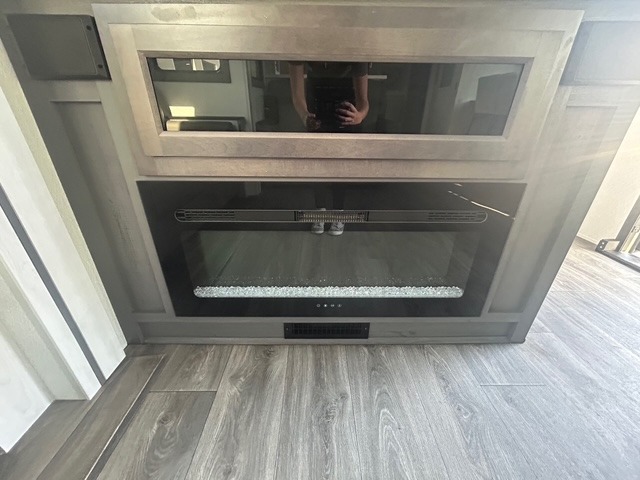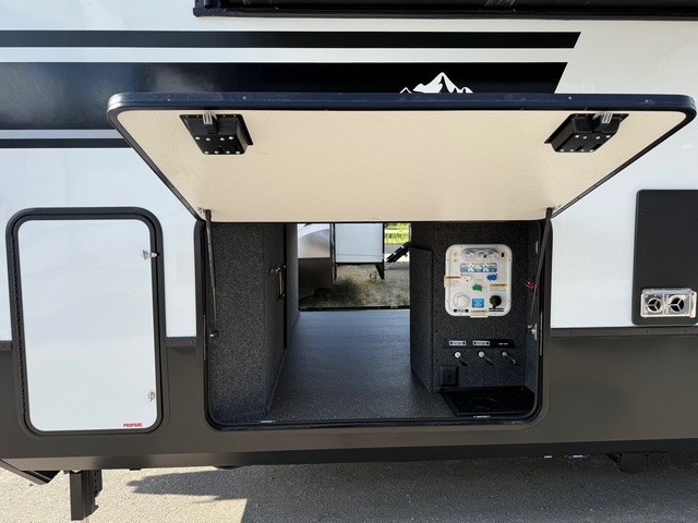 The spacious rear kitchen is, equipped with a 30” microwave, 24” residential oven, overhead cabinets, breakfast bar with bar stools, walk-in pantry, and 16 cu refrigerator, perfect for cooking all your favorite dishes with the greatest convenience The living room is the heart of the home, featuring a desk with chairs, theater seating, two 60” trifold sofas, a TV with fireplace, and more—the perfect place to relax and unwind after a long day of adventure. And when nature calls, you'll appreciate the convenient half bath with overhead cabinets. Plus, with the pull-out closet and ample storage space throughout, you'll have everything you need to stay organized and comfortable on the go. The main bedroom is a serene retreat, featuring a king bed, drawers under the bed, a TV with fireplace, and more. The perfect place to relax and recharge after a long day of adventure, and with a front full bathroom featuring a 30” x 40” shower, dual sink, walk-in closet, dresser/drawer, and more, you'll have everything you need to stay clean and comfortable on the go. Outside, you'll find not one, but two awnings - 16’ and 18’ - providing plenty of shade and protection from the elements.