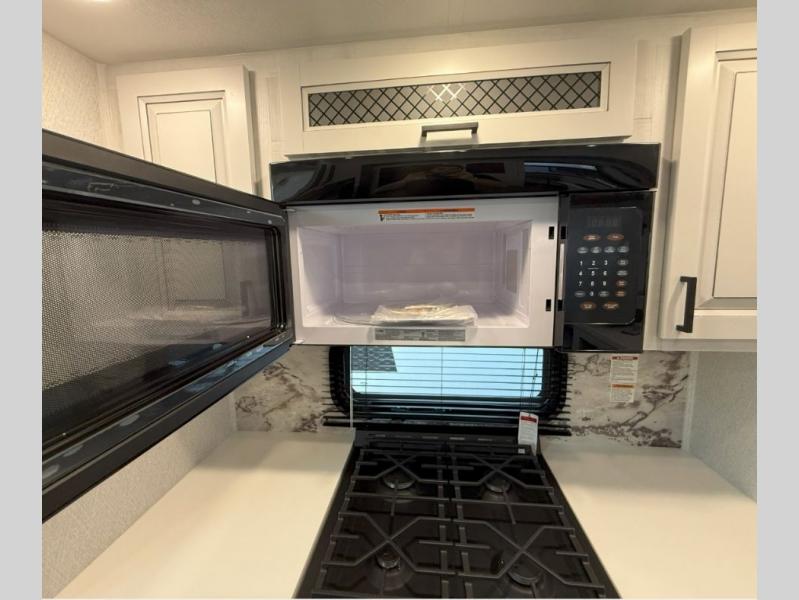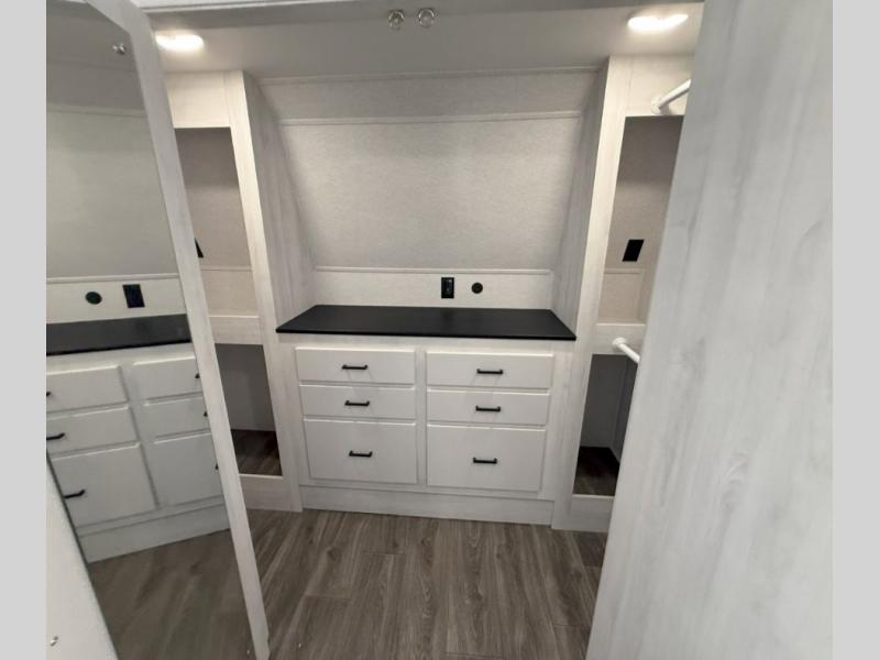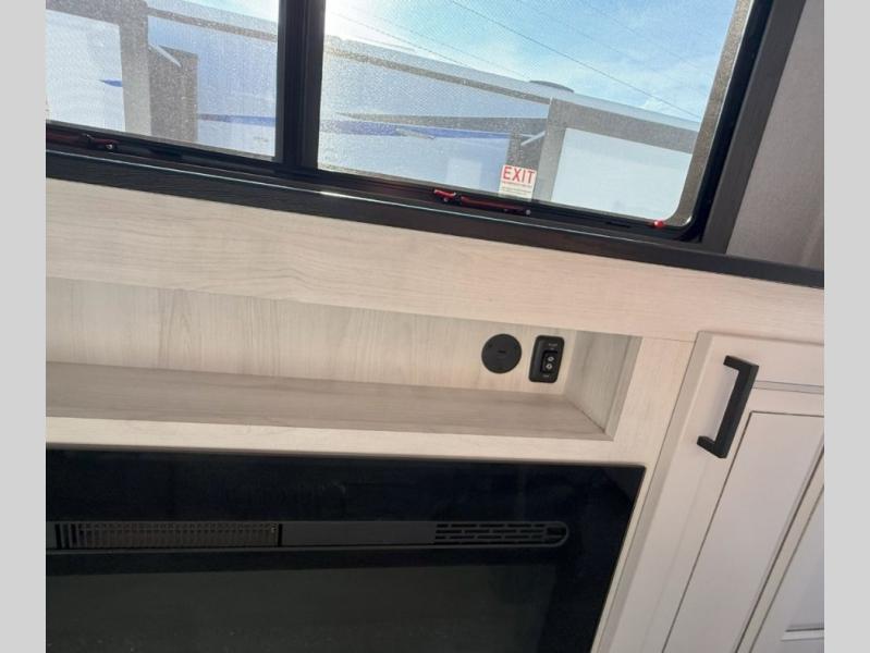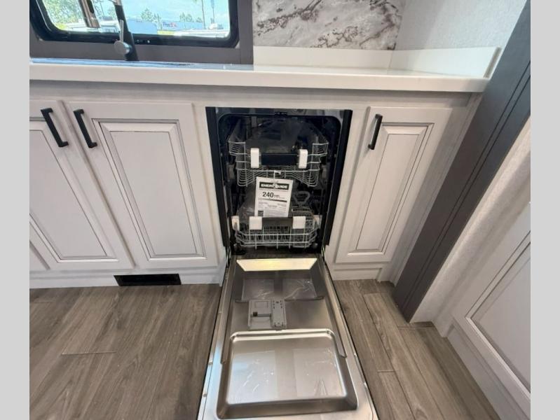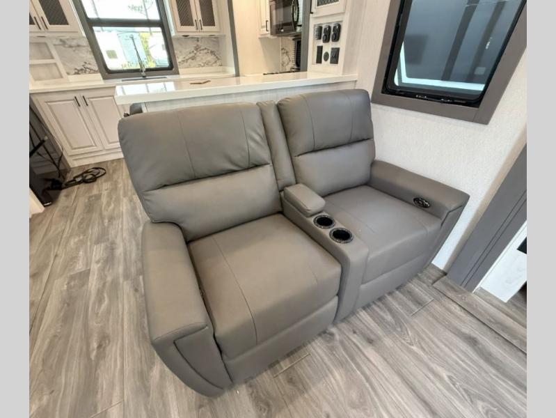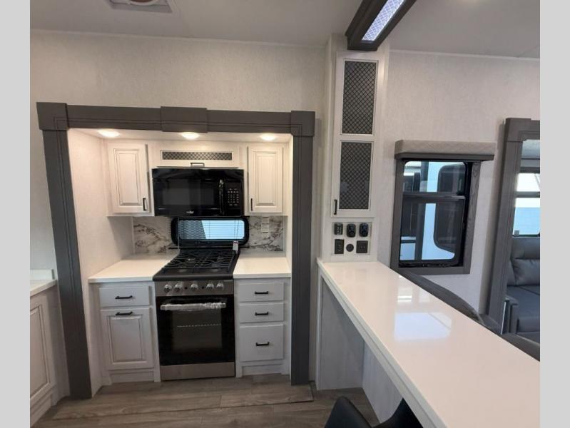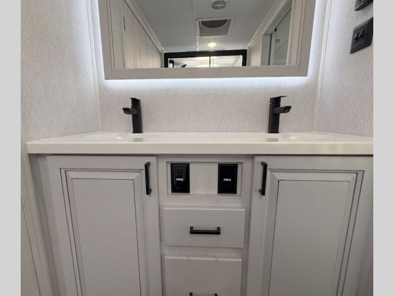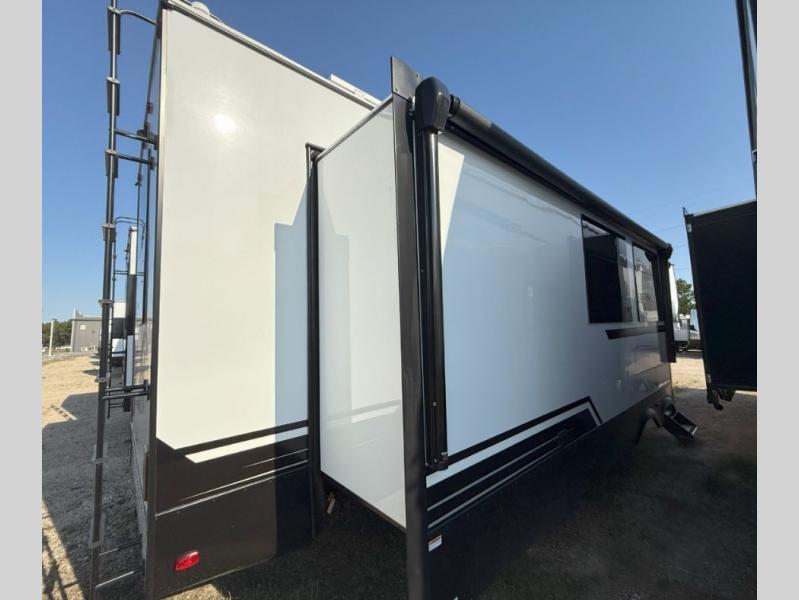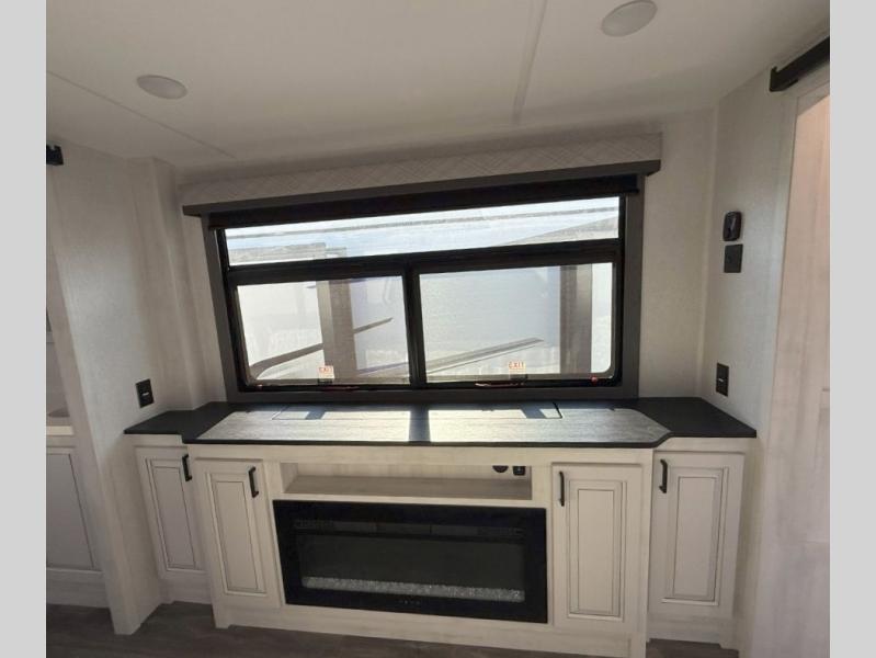 The spacious rear kitchen is equipped with a 30” microwave, 24” residential oven, overhead cabinets, breakfast bar with bar stools, walk-in pantry, and 16 cu. ft. refrigerator, perfect for cooking all your favorite dishes with the greatest convenience The living room is the heart of the home, featuring a desk with chairs, theater seating, two 60” trifold sofas, a TV with fireplace, and more. And when nature calls, you'll appreciate the convenient half bath with overhead cabinets and washer and dryer prep. The main bedroom is a serene retreat, featuring a king bed, drawers under the bed, a bedroom fireplace, and more. This is the perfect place to relax and recharge after a long day of adventure, and with a front full bathroom featuring a 30” x 40” shower, dual sink vanity, walk-in closet, dresser/drawers, you'll have everything you need to stay clean and comfortable on the go. Outside, you'll find not one, but two awnings to providing plenty of shade and protection from the elements.