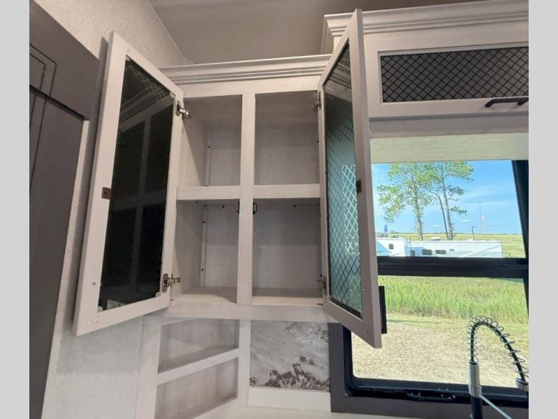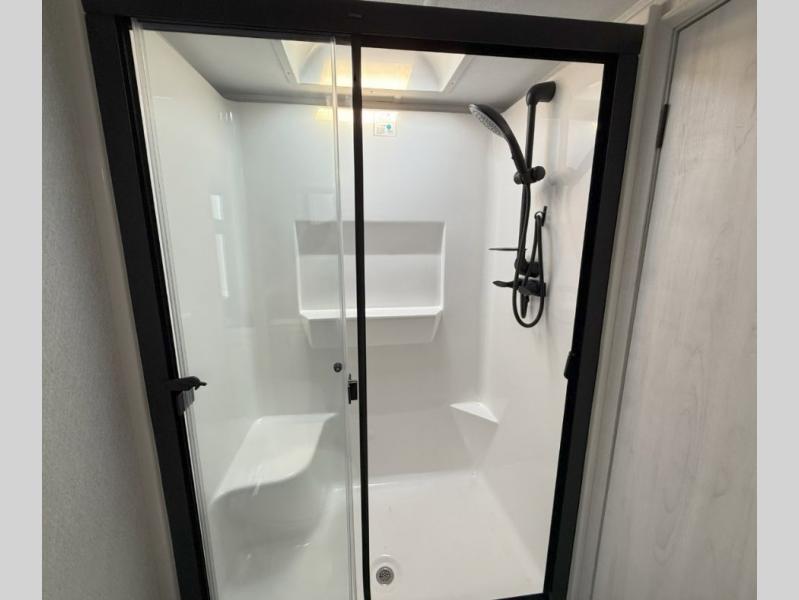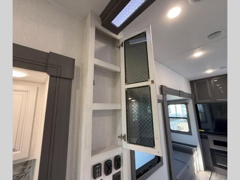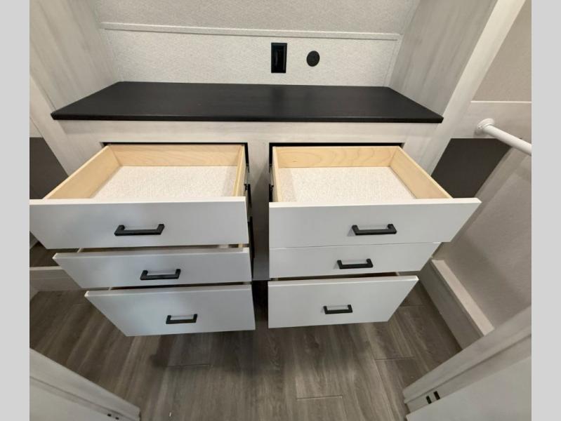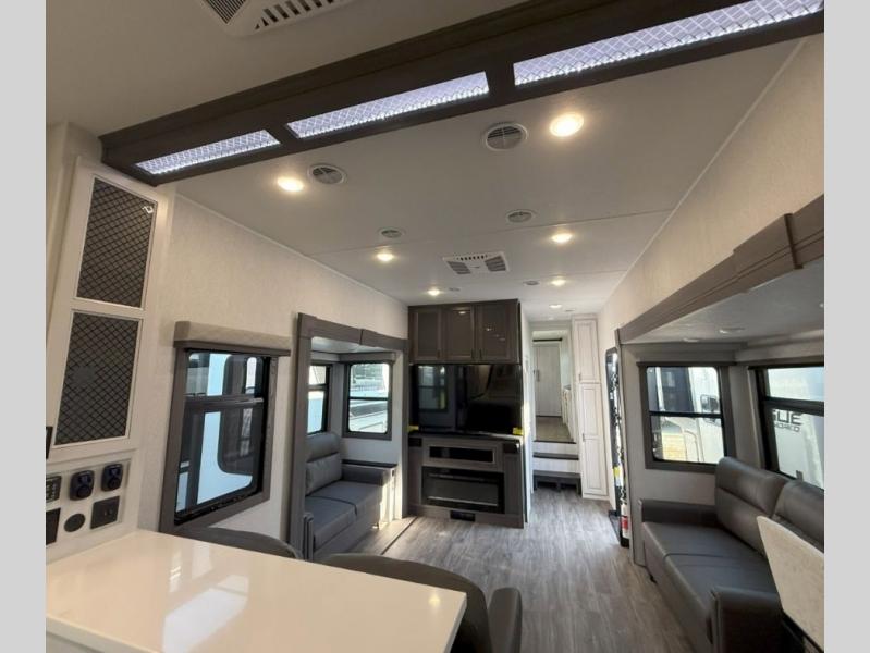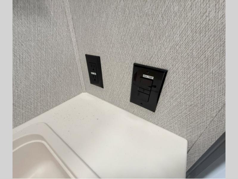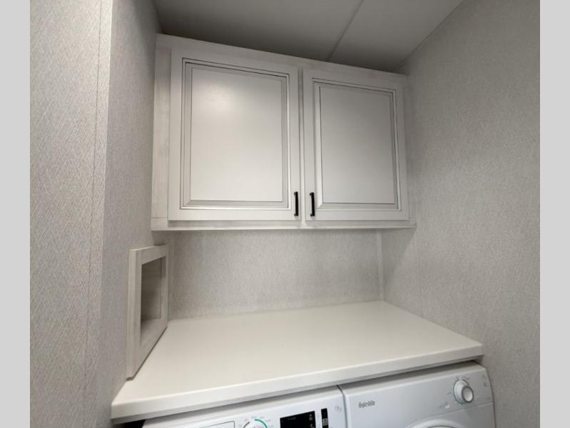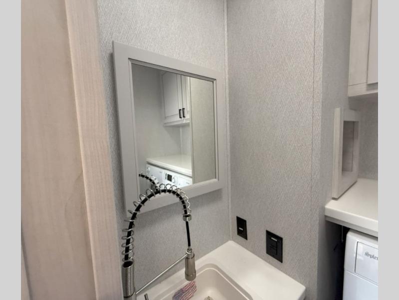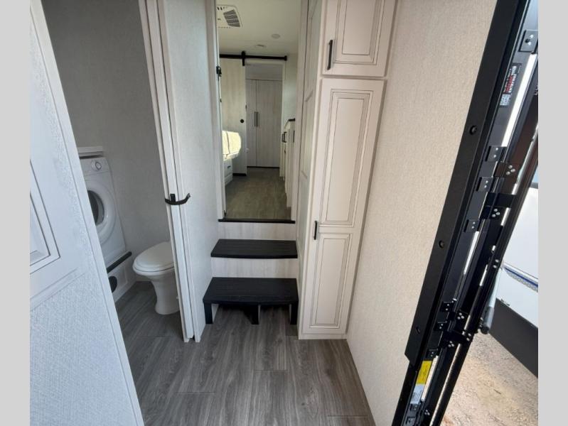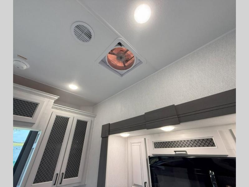 The spacious rear kitchen is equipped with a 30” microwave, 24” residential oven, overhead cabinets, breakfast bar with bar stools, walk-in pantry, and 16 cu. ft. refrigerator, perfect for cooking all your favorite dishes with the greatest convenience The living room is the heart of the home, featuring a desk with chairs, theater seating, two 60” trifold sofas, a TV with fireplace, and more. And when nature calls, you'll appreciate the convenient half bath with overhead cabinets and washer and dryer prep. The main bedroom is a serene retreat, featuring a king bed, drawers under the bed, a bedroom fireplace, and more. This is the perfect place to relax and recharge after a long day of adventure, and with a front full bathroom featuring a 30” x 40” shower, dual sink vanity, walk-in closet, dresser/drawers, you'll have everything you need to stay clean and comfortable on the go. Outside, you'll find not one, but two awnings to providing plenty of shade and protection from the elements.