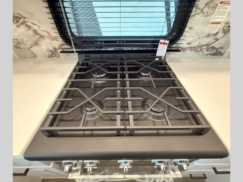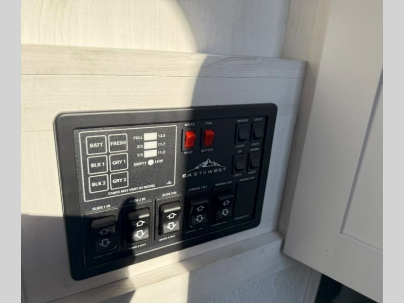 There is just too much luxury to name on the EAST TO WEST Ahara fifth wheel! These units are quite impressive, and once you see them, you'll know what we mean. The Ahara first grabs your attention with its fully painted aerodynamic fiberglass front cap, 102" wide-body chassis, and deep tint square frameless windows. For towing, you'll find a MORryde CRE 3000 suspension, LED marker lights, LED taillights with back-up lights, and rear view camera prep. Traveling in different climates is also made easy with the high-efficiency triple A/C system, 40,000 BTU high-capacity furnace, plus heated, insulated, and enclosed underbelly found within the Climate Package. Head inside to enjoy Slow Rise roller shades, a flush floor kitchen slide to help prevent trips, and solid surface countertops in the kitchen and bath to name a few luxuries!