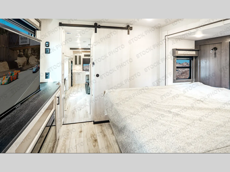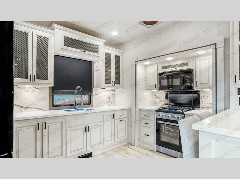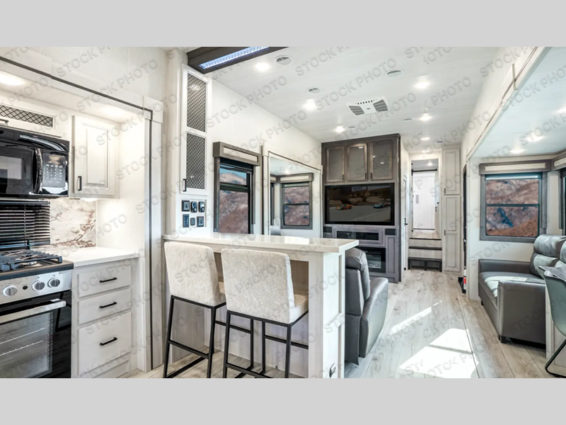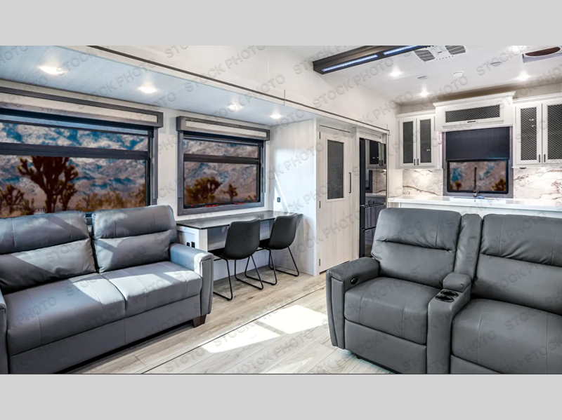 The spacious rear kitchen is equipped with a 30” microwave, 24” residential oven, overhead cabinets, breakfast bar with bar stools, walk-in pantry, and 16 cu. ft. refrigerator, perfect for cooking all your favorite dishes with the greatest convenience The living room is the heart of the home, featuring a desk with chairs, theater seating, two 60” trifold sofas, a TV with fireplace, and more. And when nature calls, you'll appreciate the convenient half bath with overhead cabinets and washer and dryer prep. The main bedroom is a serene retreat, featuring a king bed, drawers under the bed, a bedroom fireplace, and more. This is the perfect place to relax and recharge after a long day of adventure, and with a front full bathroom featuring a 30” x 40” shower, dual sink vanity, walk-in closet, dresser/drawers, you'll have everything you need to stay clean and comfortable on the go. Outside, you'll find not one, but two awnings to providing plenty of shade and protection from the elements.