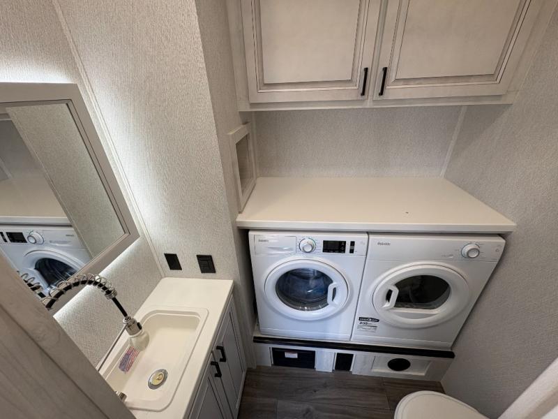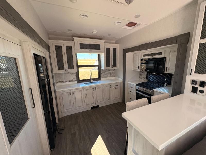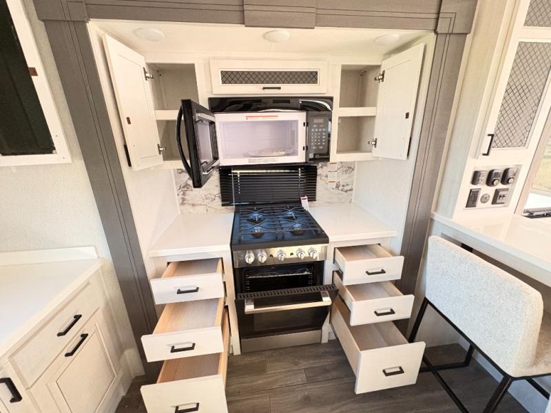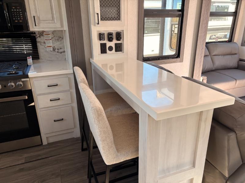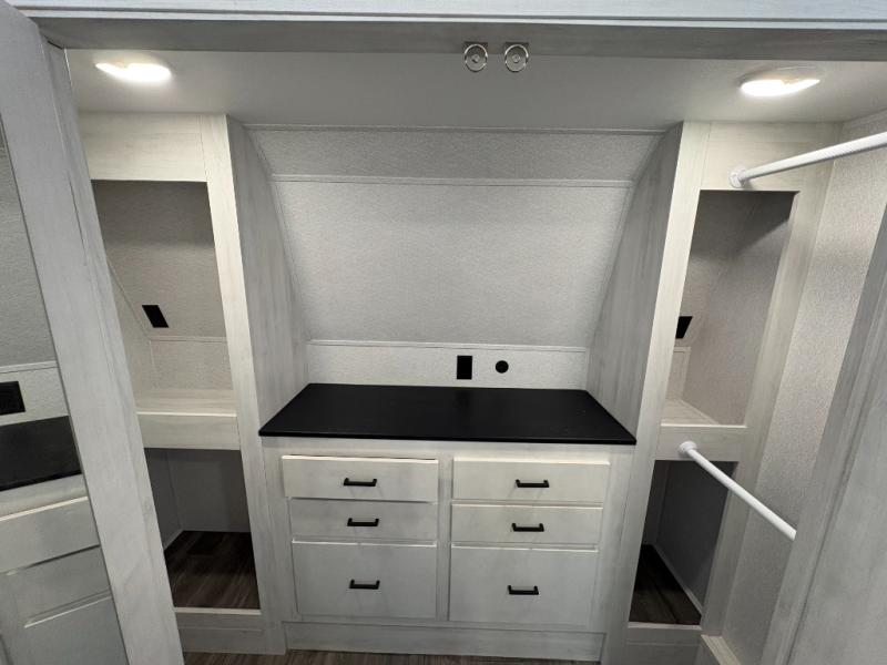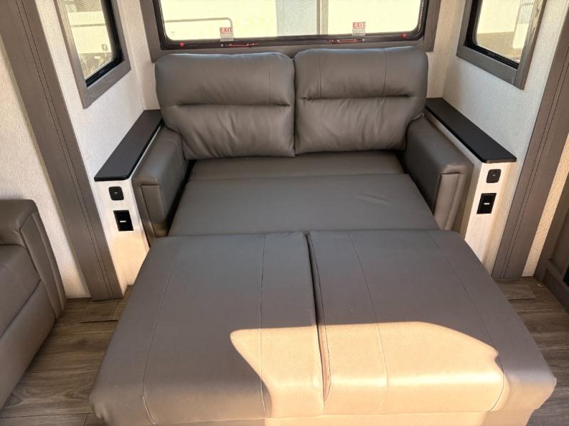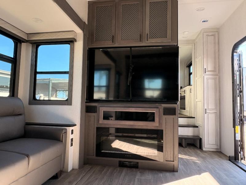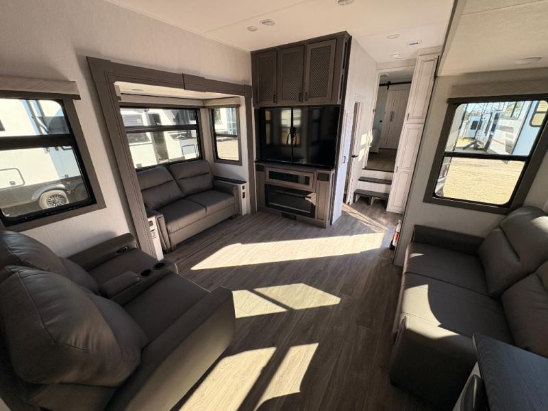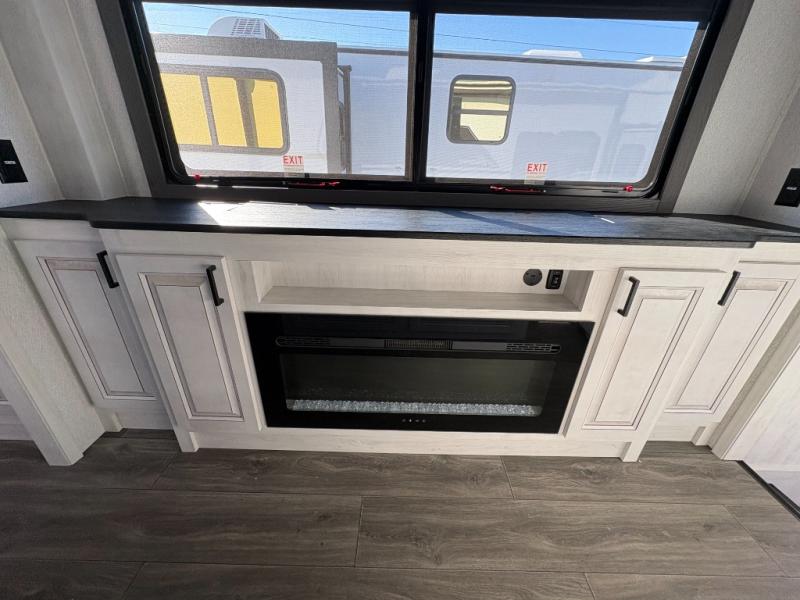 The spacious rear kitchen is equipped with a 30” microwave, 24” residential oven, overhead cabinets, breakfast bar with bar stools, walk-in pantry, and 16 cu. ft. refrigerator, perfect for cooking all your favorite dishes with the greatest convenience The living room is the heart of the home, featuring a desk with chairs, theater seating, two 60” trifold sofas, a TV with fireplace, and more. And when nature calls, you'll appreciate the convenient half bath with overhead cabinets and washer and dryer prep. The main bedroom is a serene retreat, featuring a king bed, drawers under the bed, a bedroom fireplace, and more. This is the perfect place to relax and recharge after a long day of adventure, and with a front full bathroom featuring a 30” x 40” shower, dual sink vanity, walk-in closet, dresser/drawers, you'll have everything you need to stay clean and comfortable on the go. Outside, you'll find not one, but two awnings to providing plenty of shade and protection from the elements.