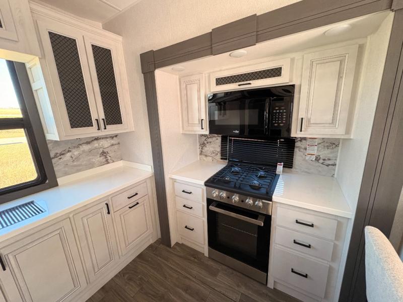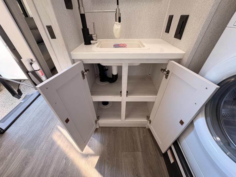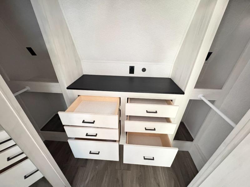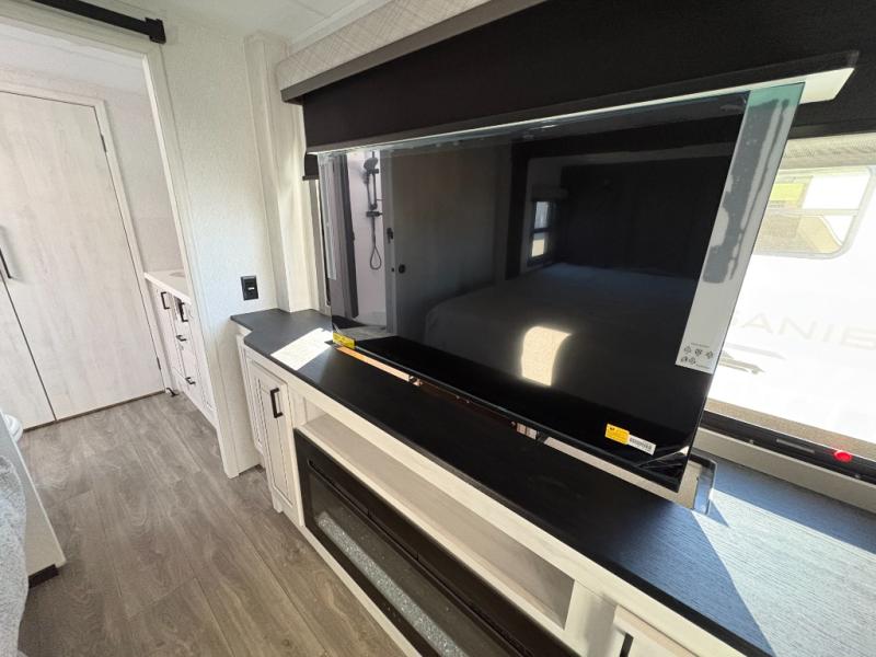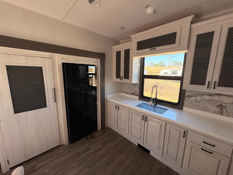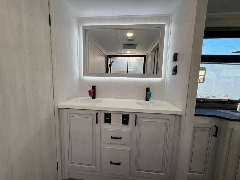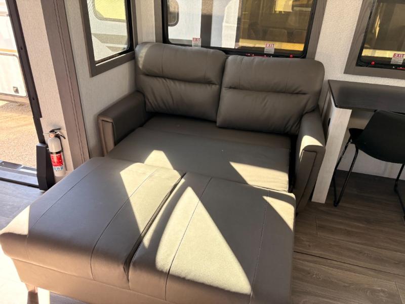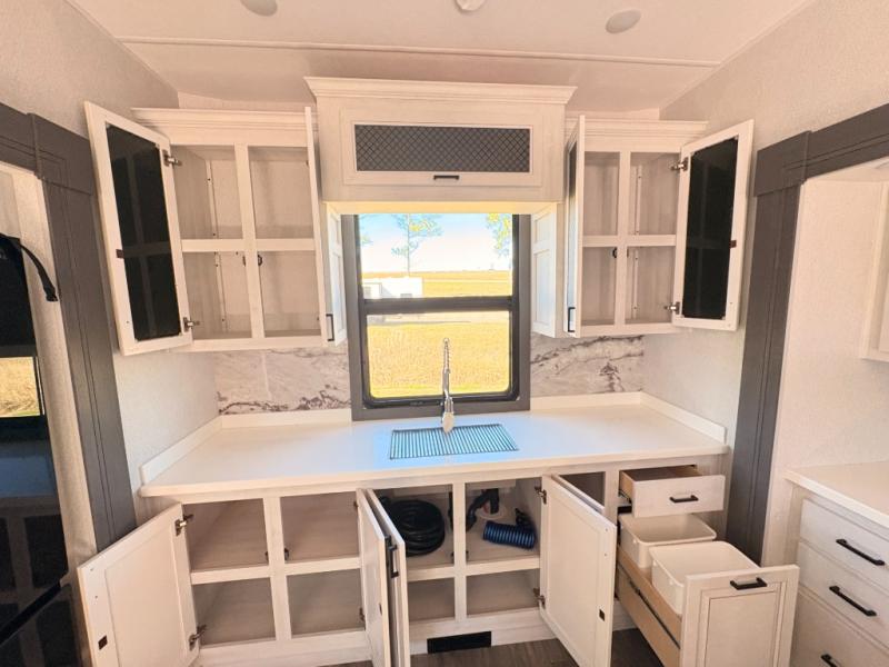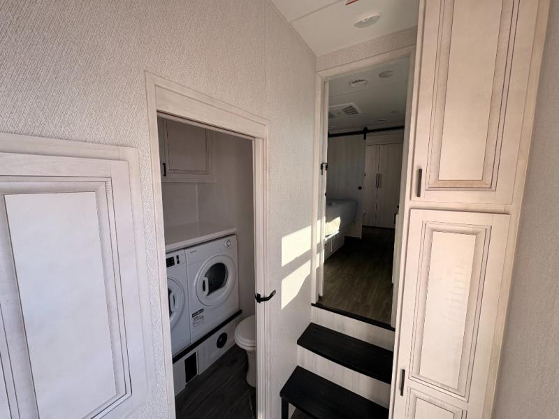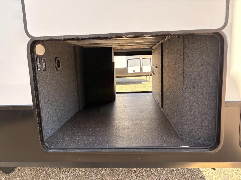 The spacious rear kitchen is equipped with a 30” microwave, 24” residential oven, overhead cabinets, breakfast bar with bar stools, walk-in pantry, and 16 cu. ft. refrigerator, perfect for cooking all your favorite dishes with the greatest convenience The living room is the heart of the home, featuring a desk with chairs, theater seating, two 60” trifold sofas, a TV with fireplace, and more. And when nature calls, you'll appreciate the convenient half bath with overhead cabinets and washer and dryer prep. The main bedroom is a serene retreat, featuring a king bed, drawers under the bed, a bedroom fireplace, and more. This is the perfect place to relax and recharge after a long day of adventure, and with a front full bathroom featuring a 30” x 40” shower, dual sink vanity, walk-in closet, dresser/drawers, you'll have everything you need to stay clean and comfortable on the go. Outside, you'll find not one, but two awnings to providing plenty of shade and protection from the elements.