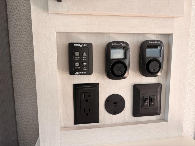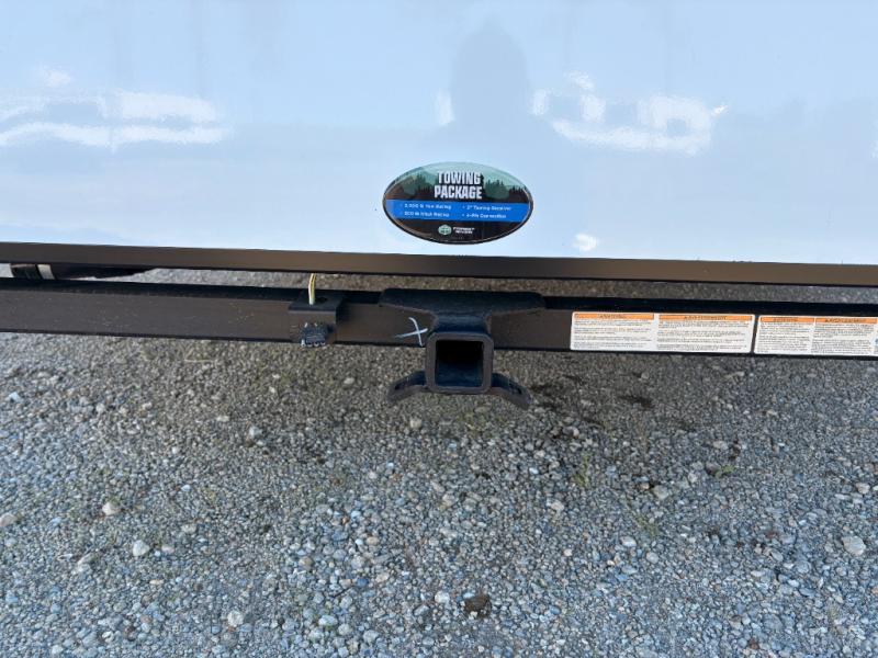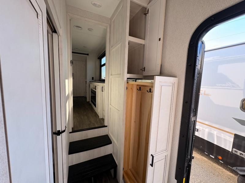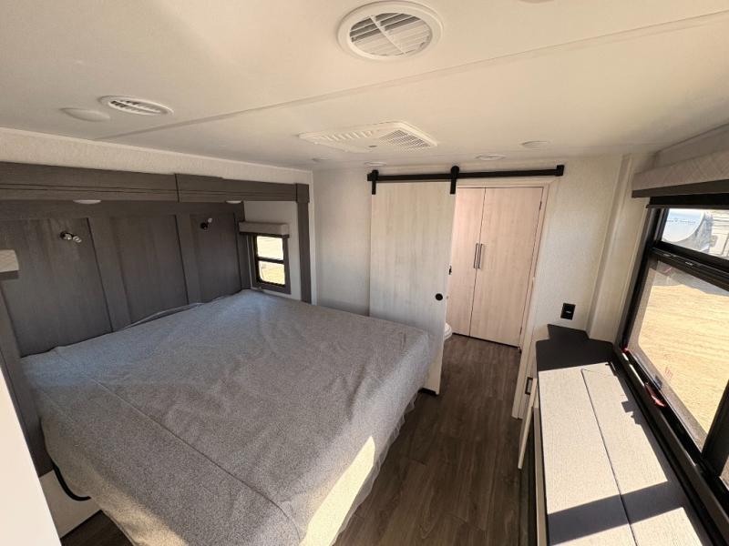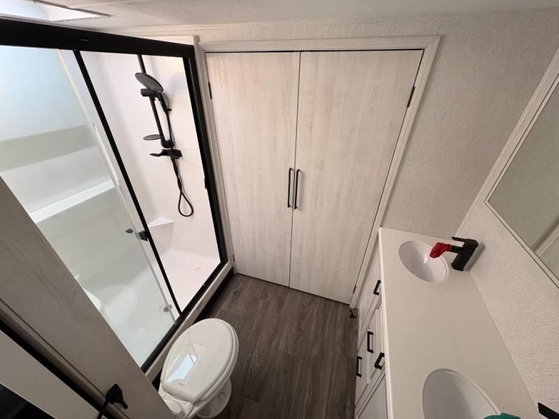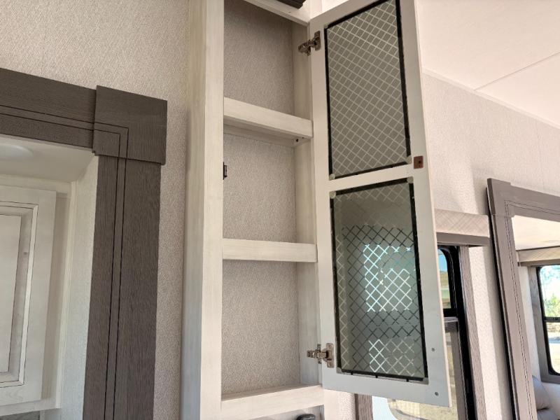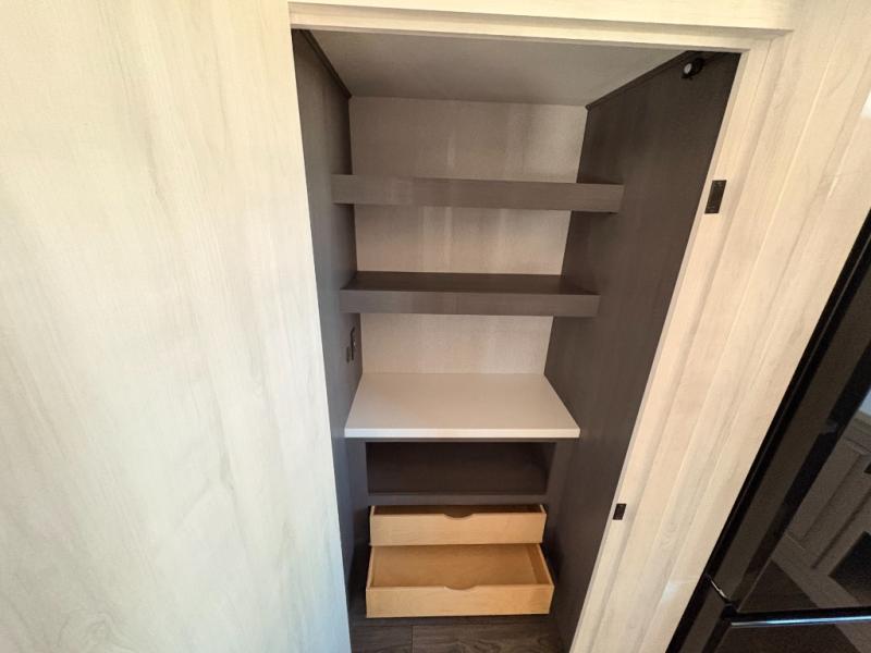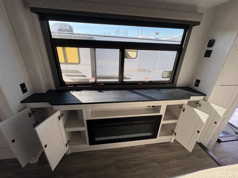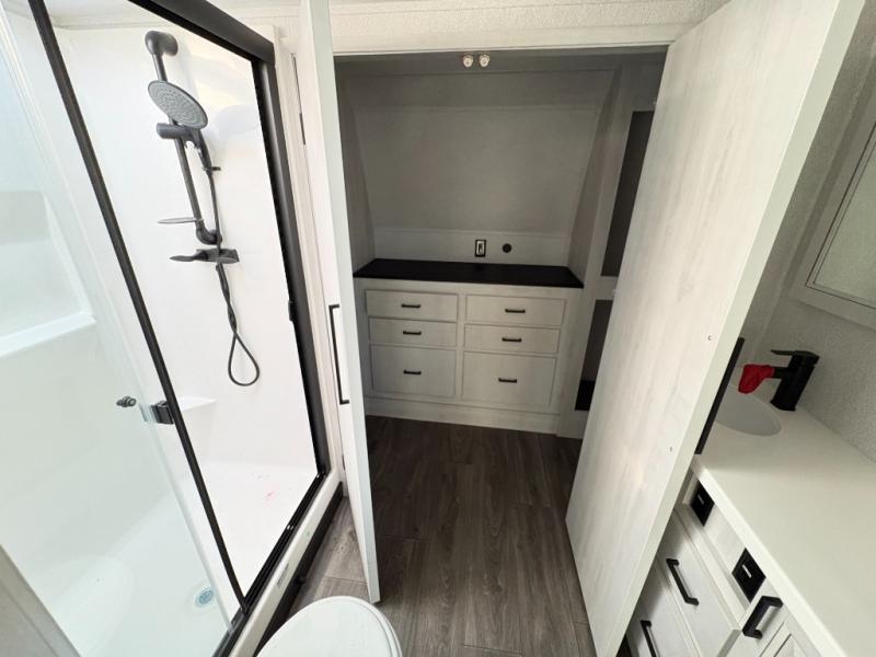 The spacious rear kitchen is equipped with a 30” microwave, 24” residential oven, overhead cabinets, breakfast bar with bar stools, walk-in pantry, and 16 cu. ft. refrigerator, perfect for cooking all your favorite dishes with the greatest convenience The living room is the heart of the home, featuring a desk with chairs, theater seating, two 60” trifold sofas, a TV with fireplace, and more. And when nature calls, you'll appreciate the convenient half bath with overhead cabinets and washer and dryer prep. The main bedroom is a serene retreat, featuring a king bed, drawers under the bed, a bedroom fireplace, and more. This is the perfect place to relax and recharge after a long day of adventure, and with a front full bathroom featuring a 30” x 40” shower, dual sink vanity, walk-in closet, dresser/drawers, you'll have everything you need to stay clean and comfortable on the go. Outside, you'll find not one, but two awnings to providing plenty of shade and protection from the elements.