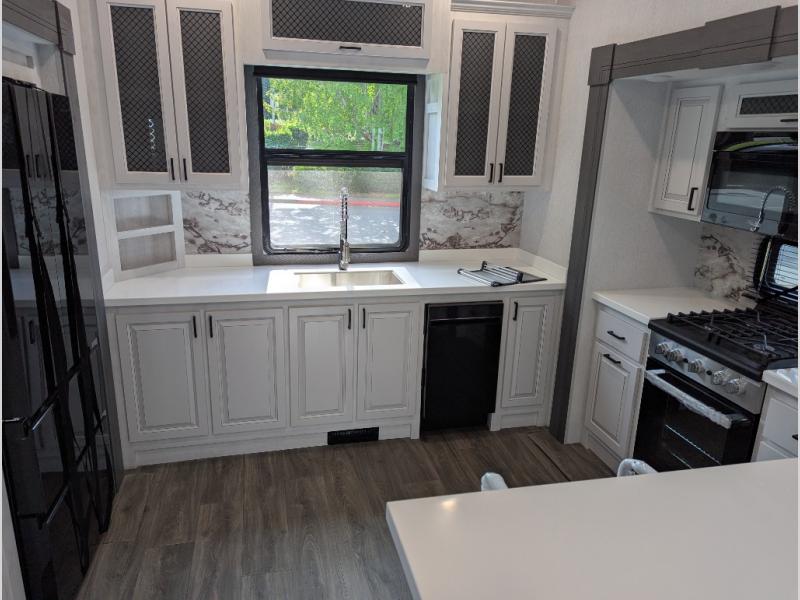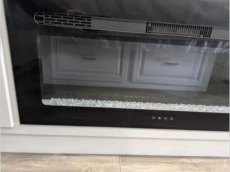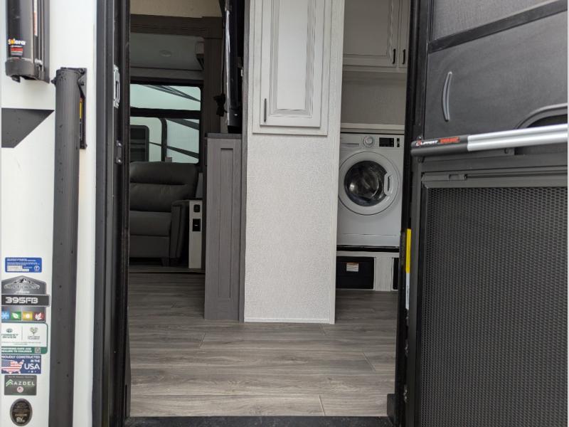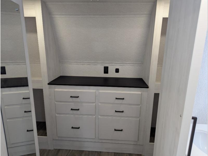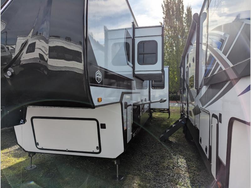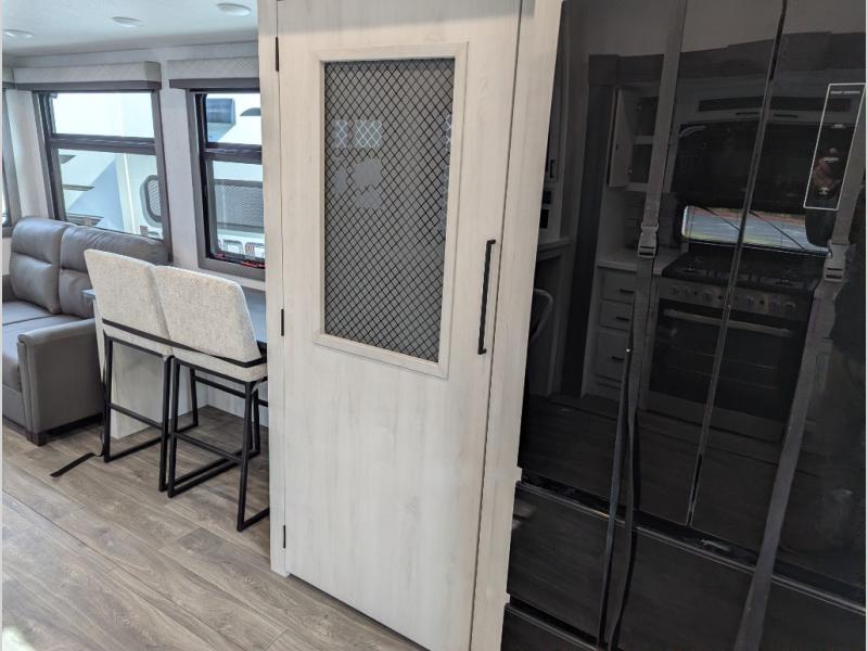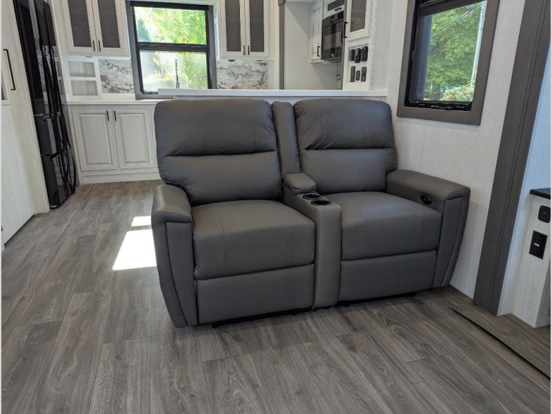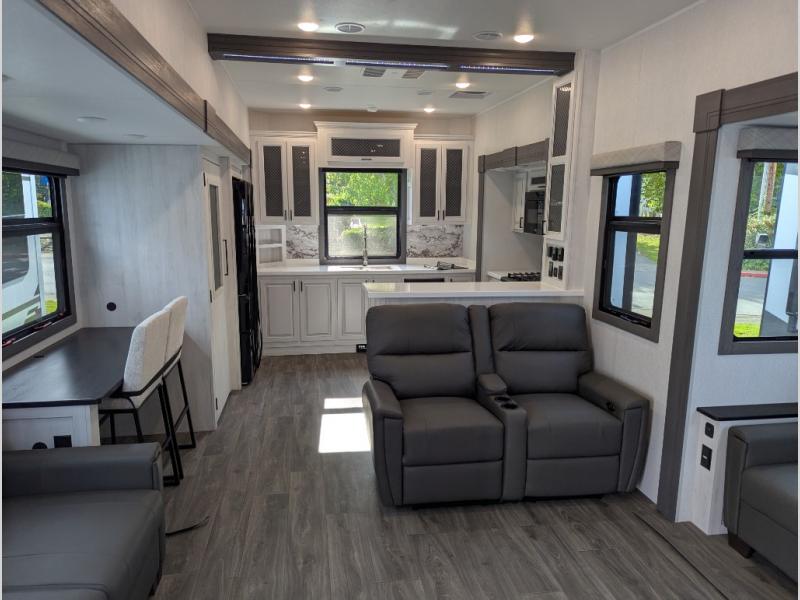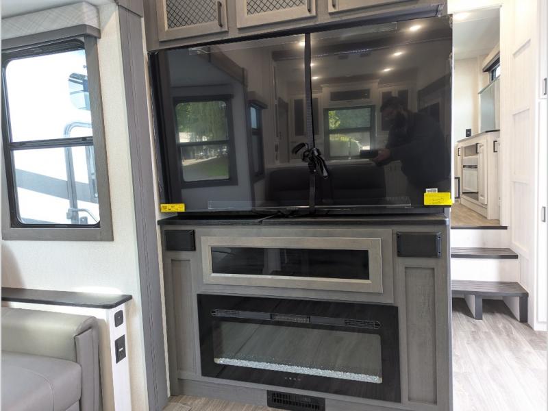 The spacious rear kitchen is equipped with a 30” microwave, 24” residential oven, overhead cabinets, breakfast bar with bar stools, walk-in pantry, and 16 cu. ft. refrigerator, perfect for cooking all your favorite dishes with the greatest convenience The living room is the heart of the home, featuring a desk with chairs, theater seating, two 60” trifold sofas, a TV with fireplace, and more. And when nature calls, you'll appreciate the convenient half bath with overhead cabinets and washer and dryer prep. The main bedroom is a serene retreat, featuring a king bed, drawers under the bed, a bedroom fireplace, and more. This is the perfect place to relax and recharge after a long day of adventure, and with a front full bathroom featuring a 30” x 40” shower, dual sink vanity, walk-in closet, dresser/drawers, you'll have everything you need to stay clean and comfortable on the go. Outside, you'll find not one, but two awnings to providing plenty of shade and protection from the elements.