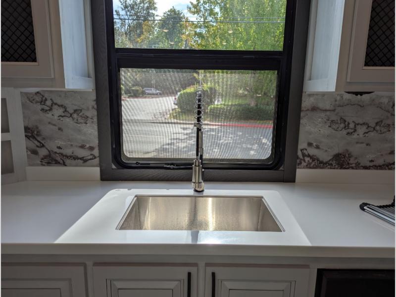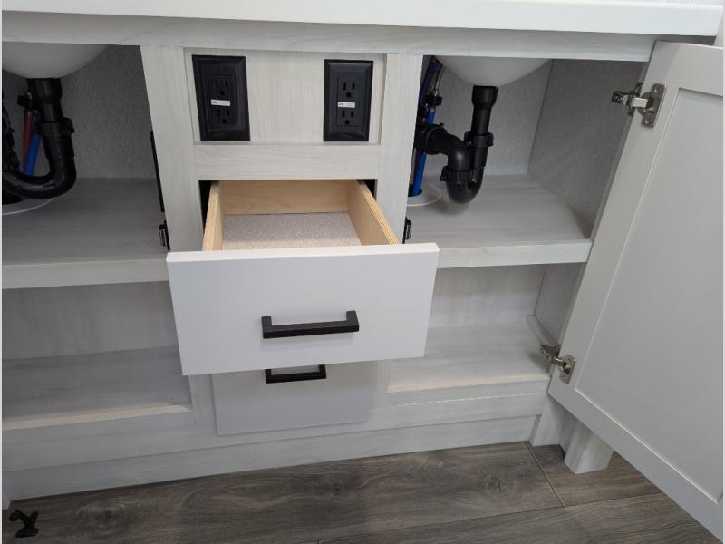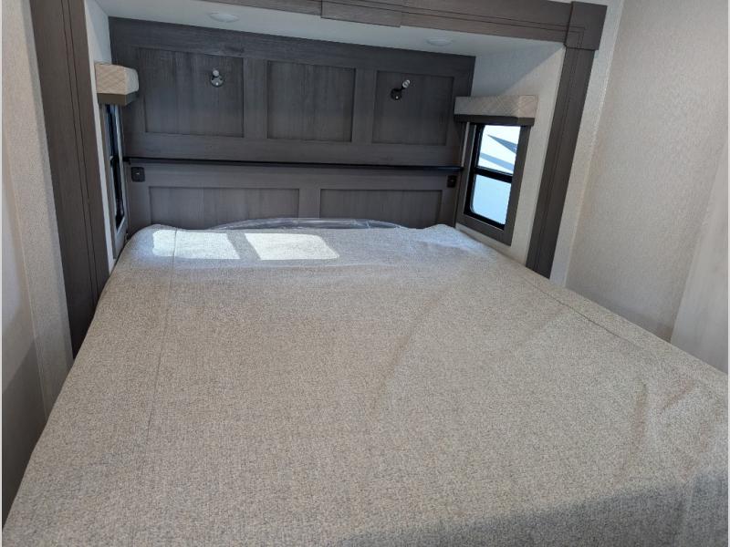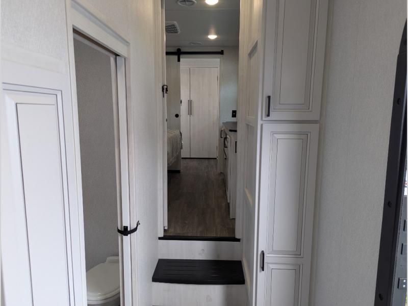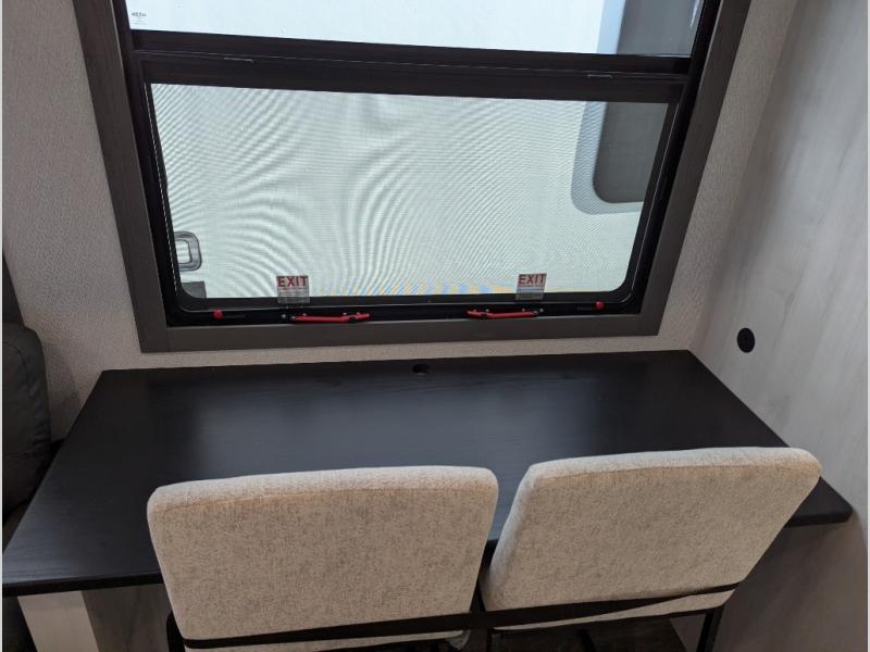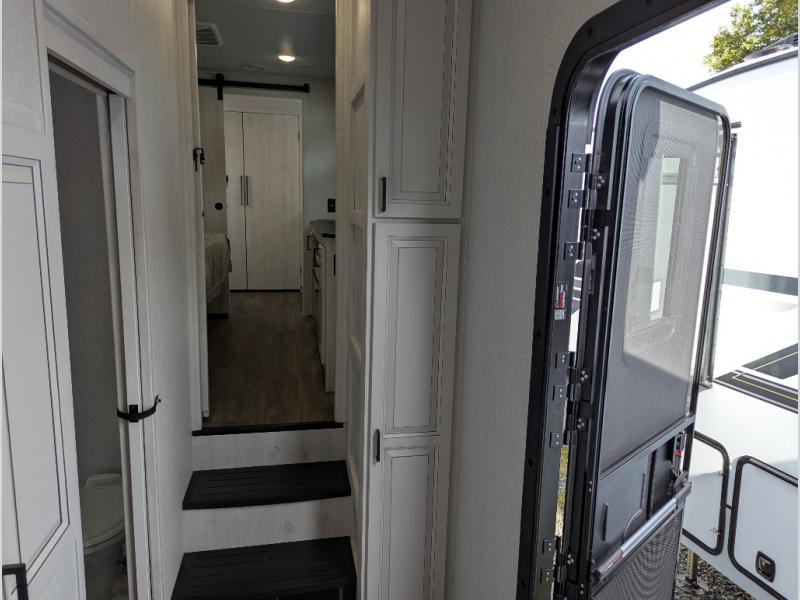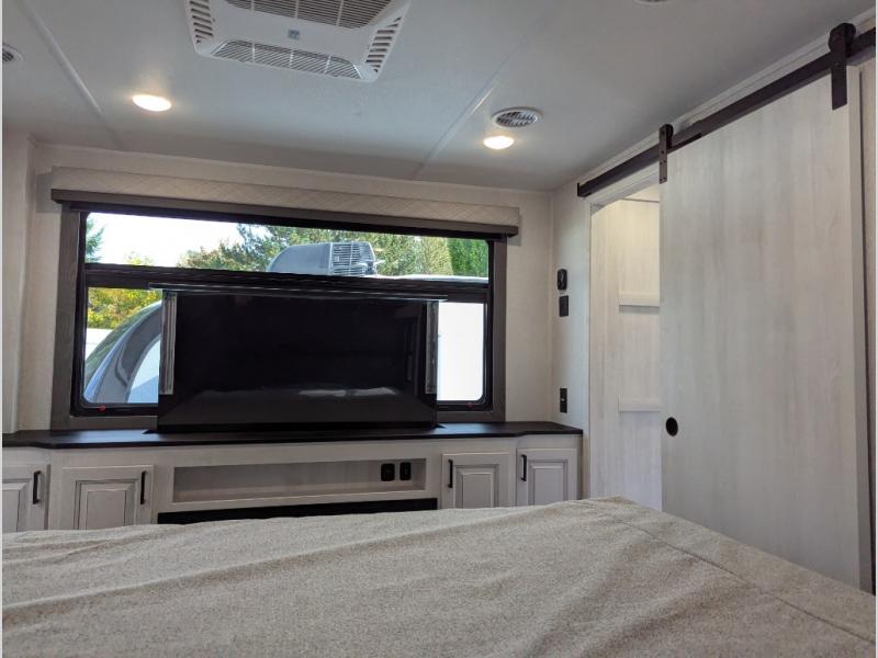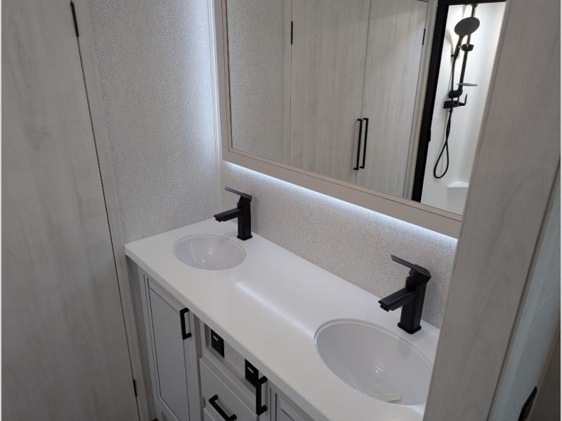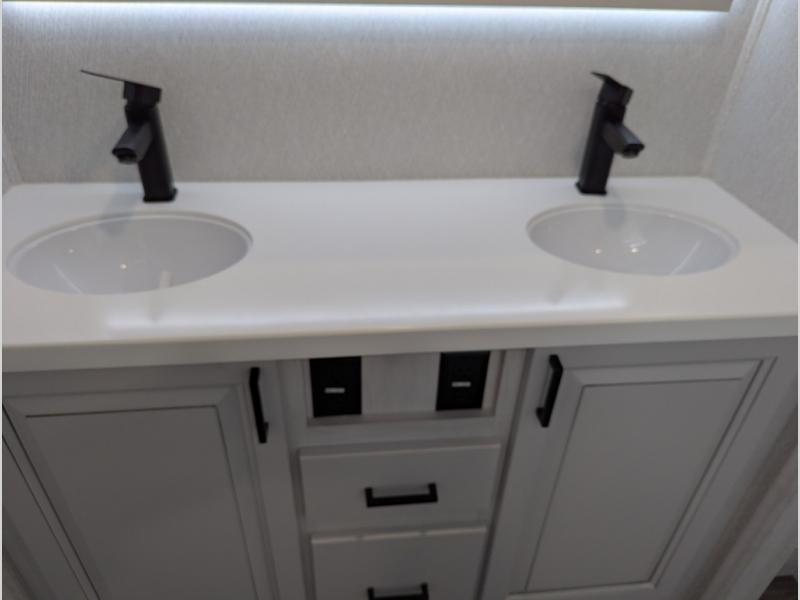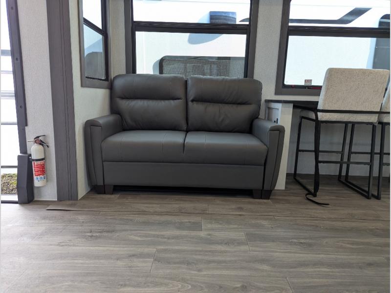 The spacious rear kitchen is equipped with a 30” microwave, 24” residential oven, overhead cabinets, breakfast bar with bar stools, walk-in pantry, and 16 cu. ft. refrigerator, perfect for cooking all your favorite dishes with the greatest convenience The living room is the heart of the home, featuring a desk with chairs, theater seating, two 60” trifold sofas, a TV with fireplace, and more. And when nature calls, you'll appreciate the convenient half bath with overhead cabinets and washer and dryer prep. The main bedroom is a serene retreat, featuring a king bed, drawers under the bed, a bedroom fireplace, and more. This is the perfect place to relax and recharge after a long day of adventure, and with a front full bathroom featuring a 30” x 40” shower, dual sink vanity, walk-in closet, dresser/drawers, you'll have everything you need to stay clean and comfortable on the go. Outside, you'll find not one, but two awnings to providing plenty of shade and protection from the elements.