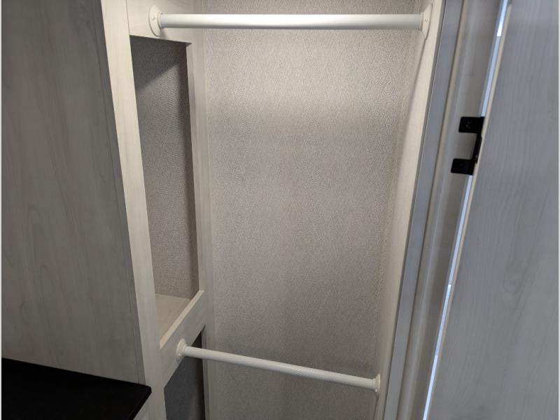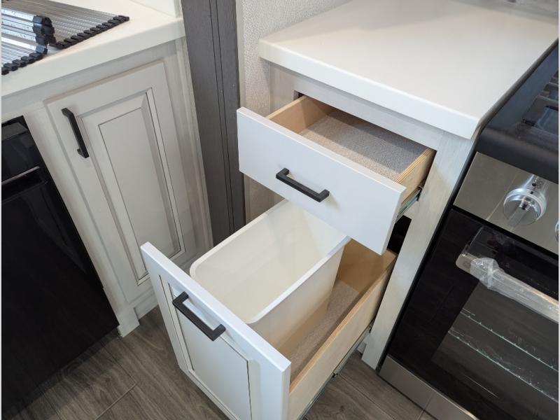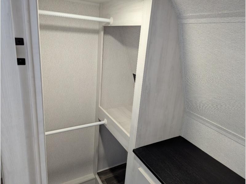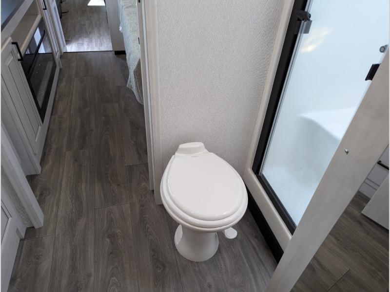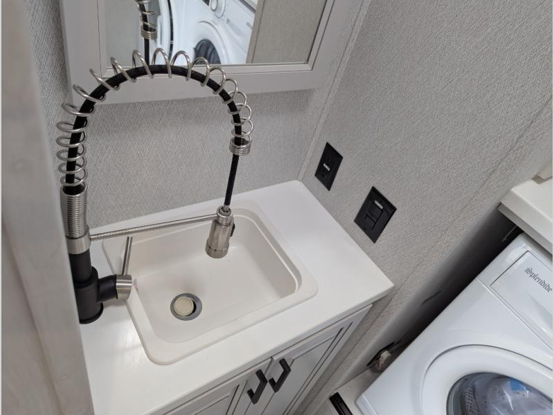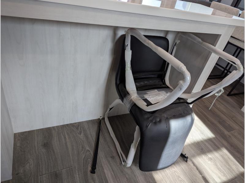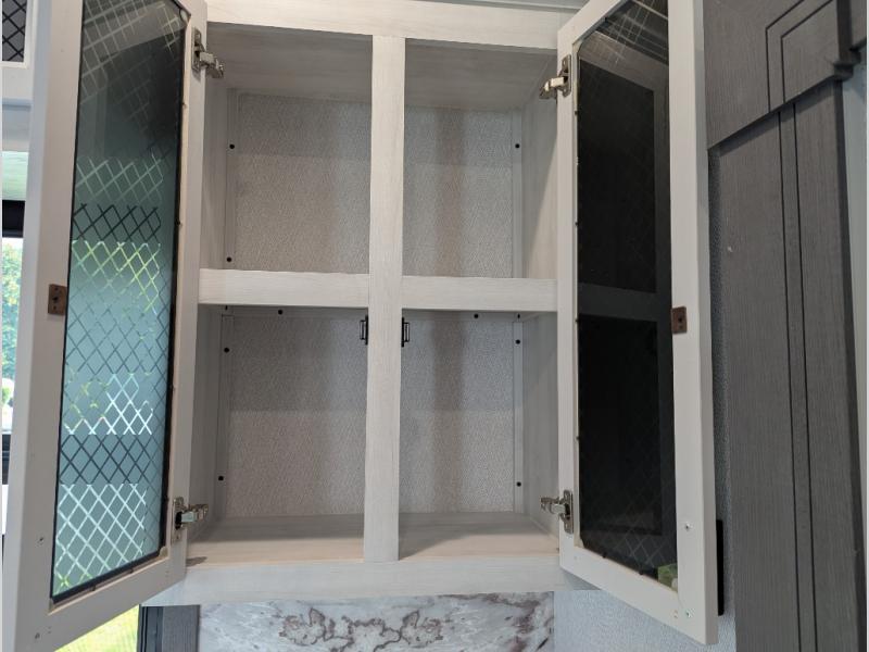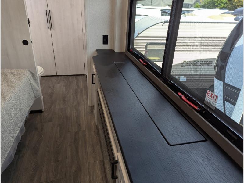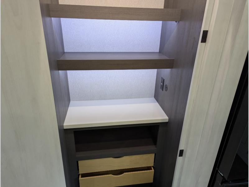 The spacious rear kitchen is equipped with a 30” microwave, 24” residential oven, overhead cabinets, breakfast bar with bar stools, walk-in pantry, and 16 cu. ft. refrigerator, perfect for cooking all your favorite dishes with the greatest convenience The living room is the heart of the home, featuring a desk with chairs, theater seating, two 60” trifold sofas, a TV with fireplace, and more. And when nature calls, you'll appreciate the convenient half bath with overhead cabinets and washer and dryer prep. The main bedroom is a serene retreat, featuring a king bed, drawers under the bed, a bedroom fireplace, and more. This is the perfect place to relax and recharge after a long day of adventure, and with a front full bathroom featuring a 30” x 40” shower, dual sink vanity, walk-in closet, dresser/drawers, you'll have everything you need to stay clean and comfortable on the go. Outside, you'll find not one, but two awnings to providing plenty of shade and protection from the elements.