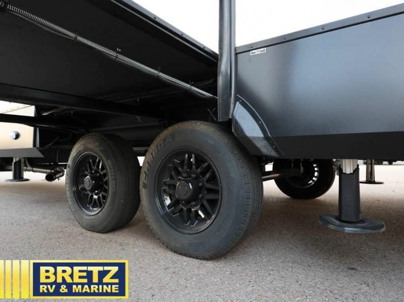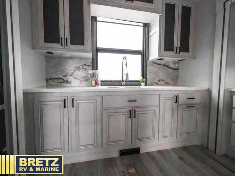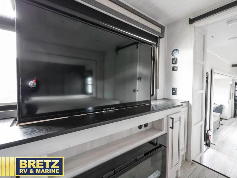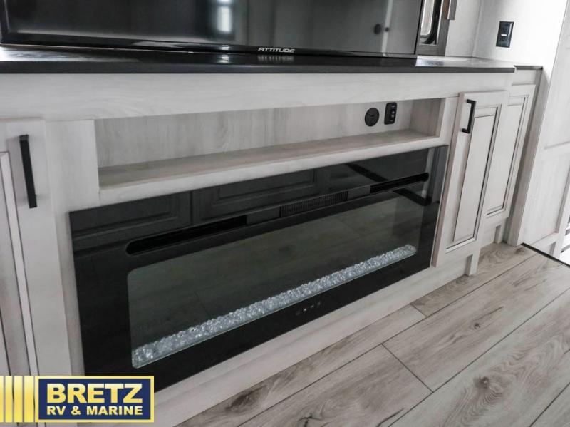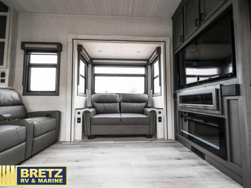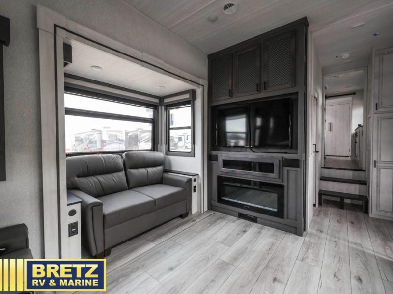 The spacious rear kitchen is equipped with a 30” microwave, 24” residential oven, overhead cabinets, breakfast bar with bar stools, walk-in pantry, and 16 cu. ft. refrigerator, perfect for cooking all your favorite dishes with the greatest convenience The living room is the heart of the home, featuring a desk with chairs, theater seating, two 60” trifold sofas, a TV with fireplace, and more. And when nature calls, you'll appreciate the convenient half bath with overhead cabinets and washer and dryer prep. The main bedroom is a serene retreat, featuring a king bed, drawers under the bed, a bedroom fireplace, and more. This is the perfect place to relax and recharge after a long day of adventure, and with a front full bathroom featuring a 30” x 40” shower, dual sink vanity, walk-in closet, dresser/drawers, you'll have everything you need to stay clean and comfortable on the go. Outside, you'll find not one, but two awnings to providing plenty of shade and protection from the elements.
