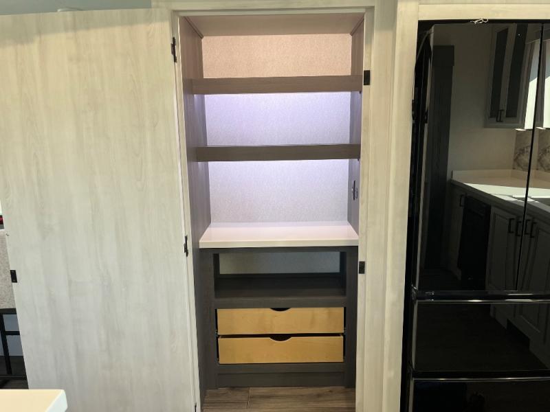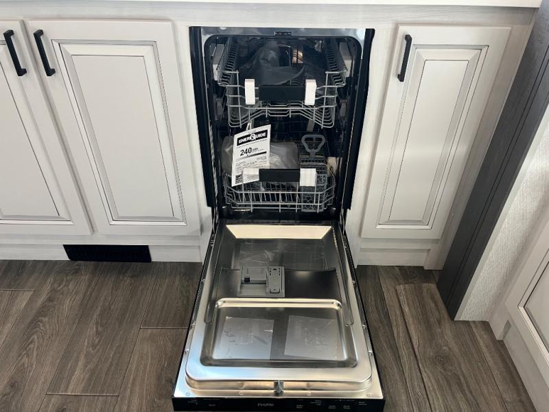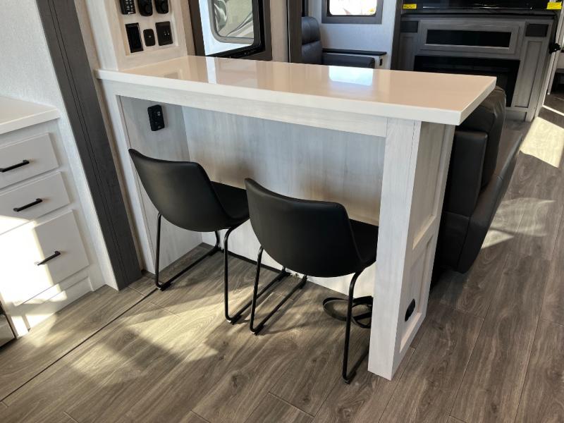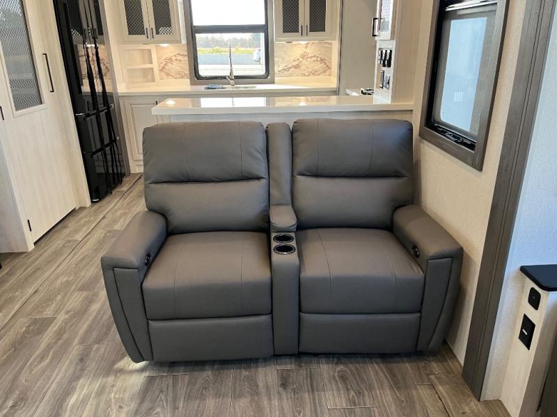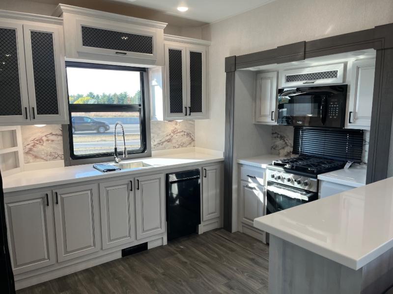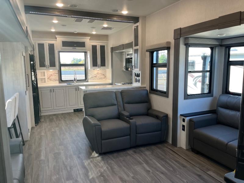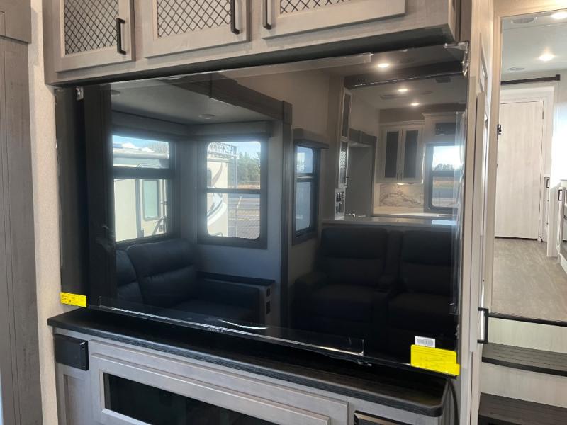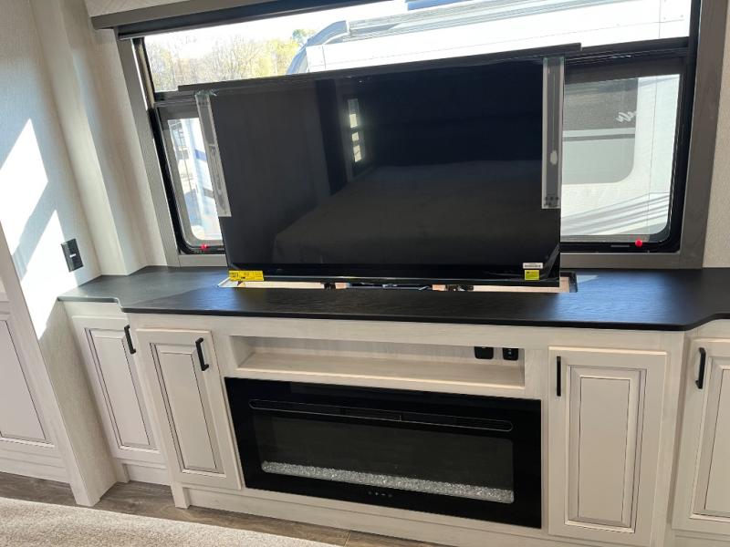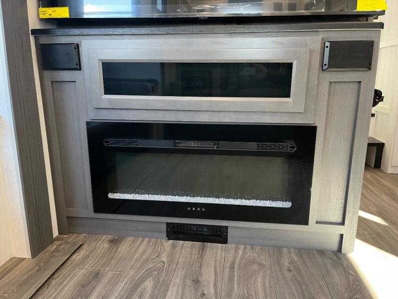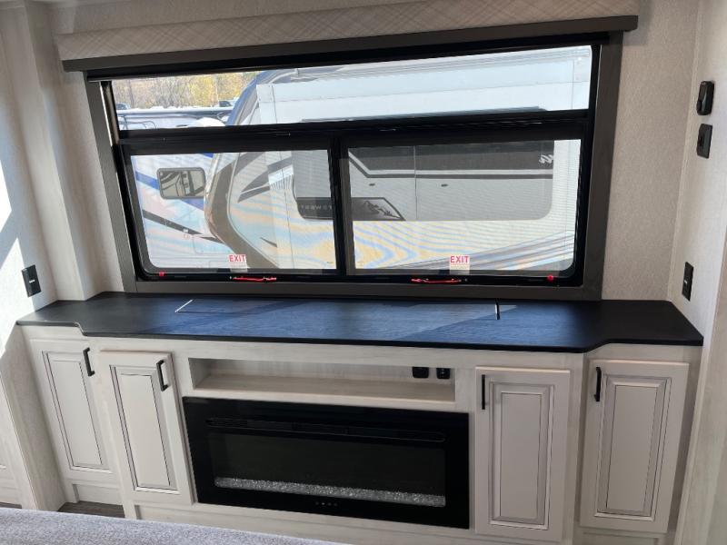 The spacious rear kitchen is equipped with a 30” microwave, 24” residential oven, overhead cabinets, breakfast bar with bar stools, walk-in pantry, and 16 cu. ft. refrigerator, perfect for cooking all your favorite dishes with the greatest convenience The living room is the heart of the home, featuring a desk with chairs, theater seating, two 60” trifold sofas, a TV with fireplace, and more. And when nature calls, you'll appreciate the convenient half bath with overhead cabinets and washer and dryer prep. The main bedroom is a serene retreat, featuring a king bed, drawers under the bed, a bedroom fireplace, and more. This is the perfect place to relax and recharge after a long day of adventure, and with a front full bathroom featuring a 30” x 40” shower, dual sink vanity, walk-in closet, dresser/drawers, you'll have everything you need to stay clean and comfortable on the go. Outside, you'll find not one, but two awnings to providing plenty of shade and protection from the elements.