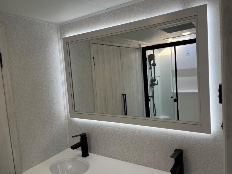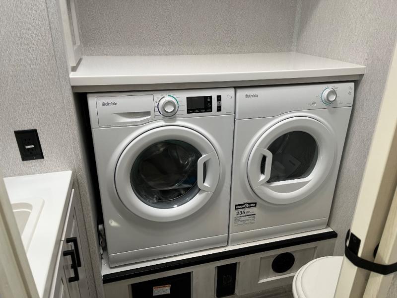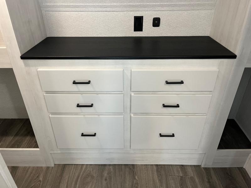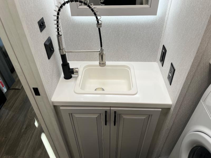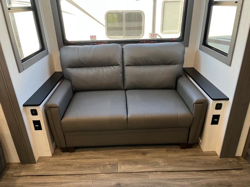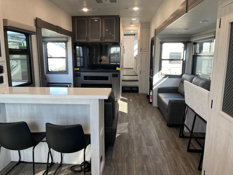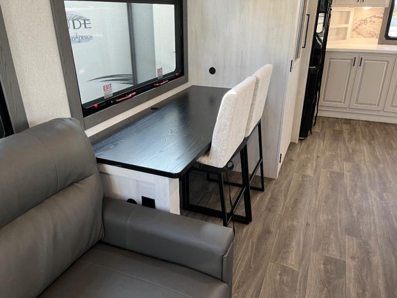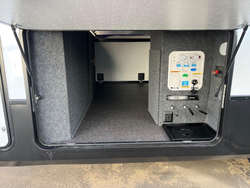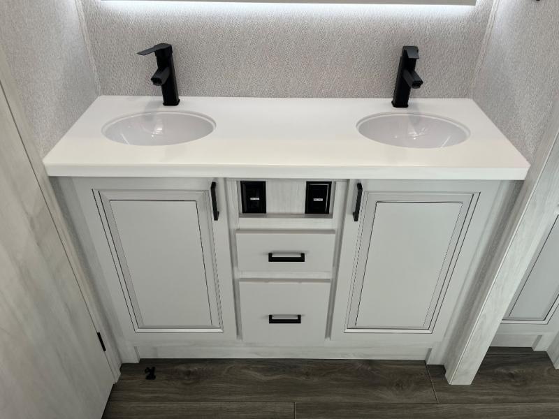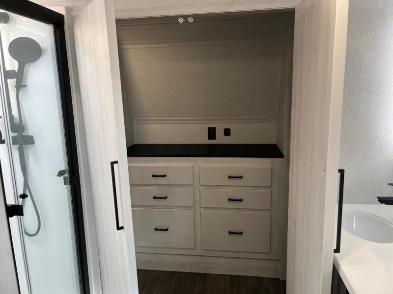 The spacious rear kitchen is equipped with a 30” microwave, 24” residential oven, overhead cabinets, breakfast bar with bar stools, walk-in pantry, and 16 cu. ft. refrigerator, perfect for cooking all your favorite dishes with the greatest convenience The living room is the heart of the home, featuring a desk with chairs, theater seating, two 60” trifold sofas, a TV with fireplace, and more. And when nature calls, you'll appreciate the convenient half bath with overhead cabinets and washer and dryer prep. The main bedroom is a serene retreat, featuring a king bed, drawers under the bed, a bedroom fireplace, and more. This is the perfect place to relax and recharge after a long day of adventure, and with a front full bathroom featuring a 30” x 40” shower, dual sink vanity, walk-in closet, dresser/drawers, you'll have everything you need to stay clean and comfortable on the go. Outside, you'll find not one, but two awnings to providing plenty of shade and protection from the elements.