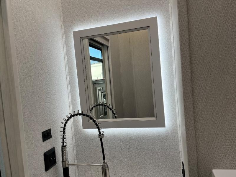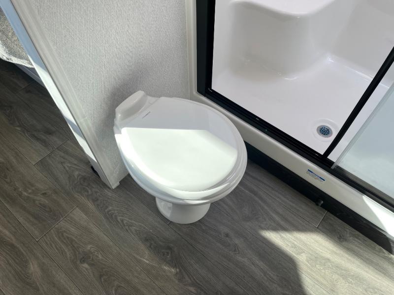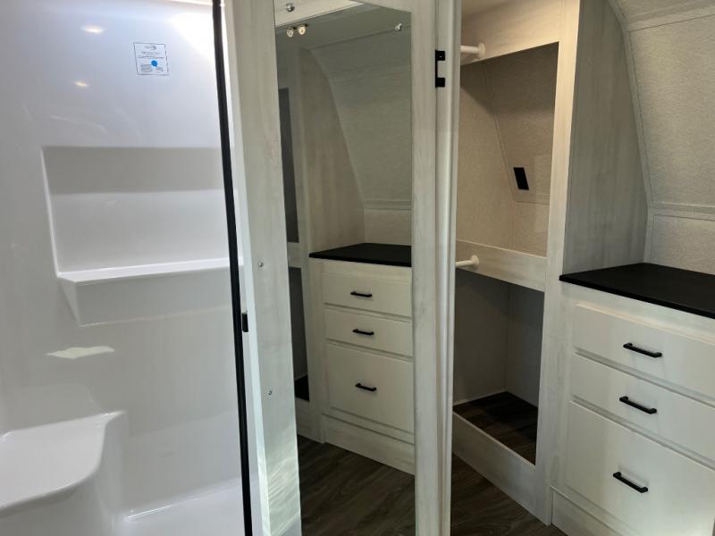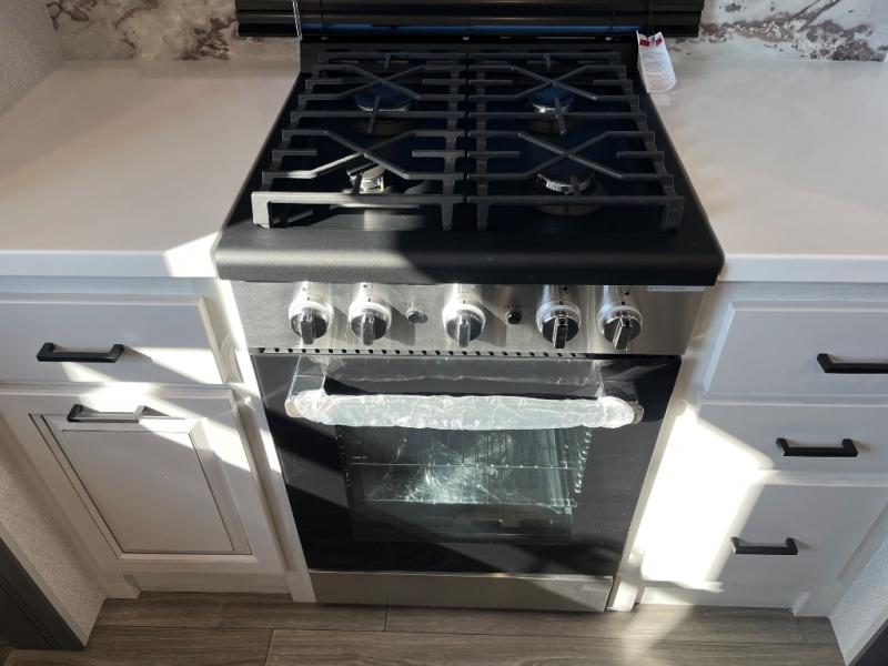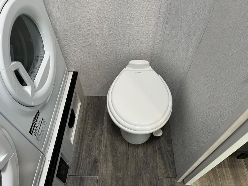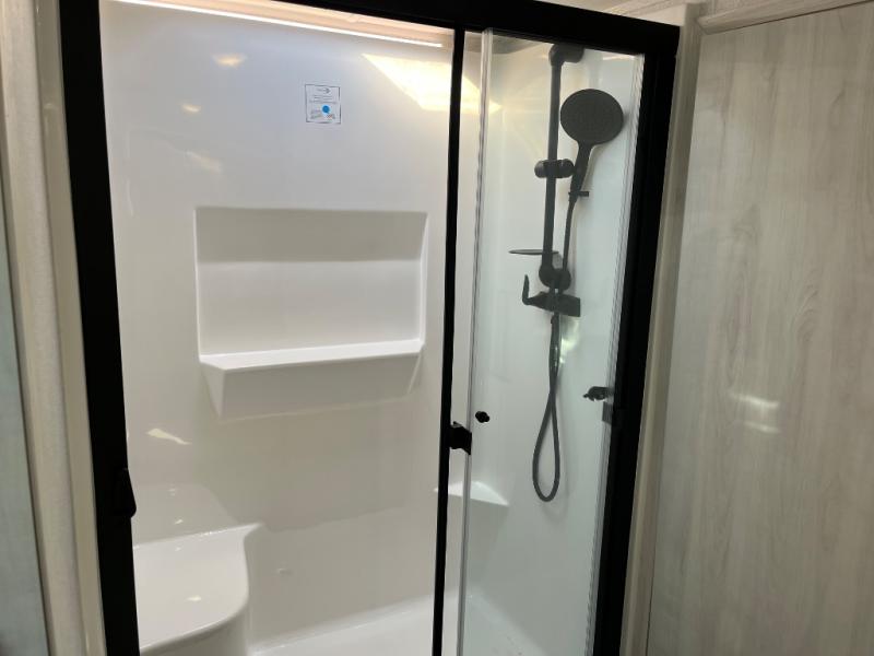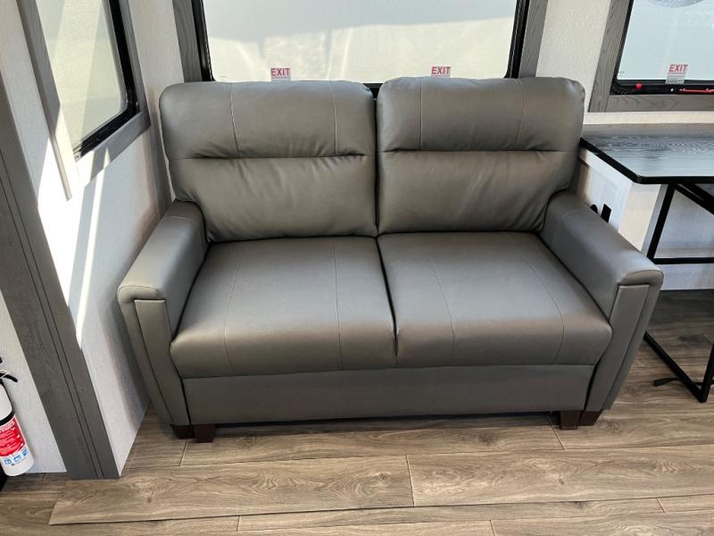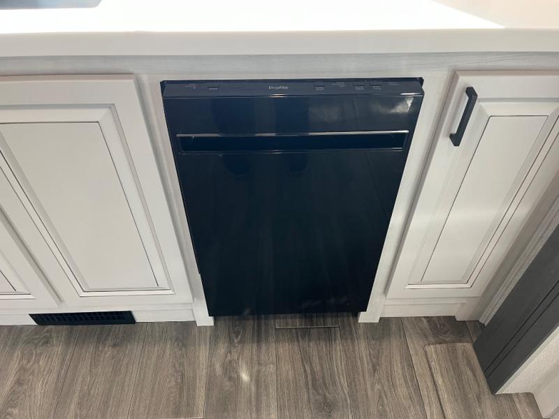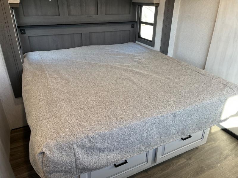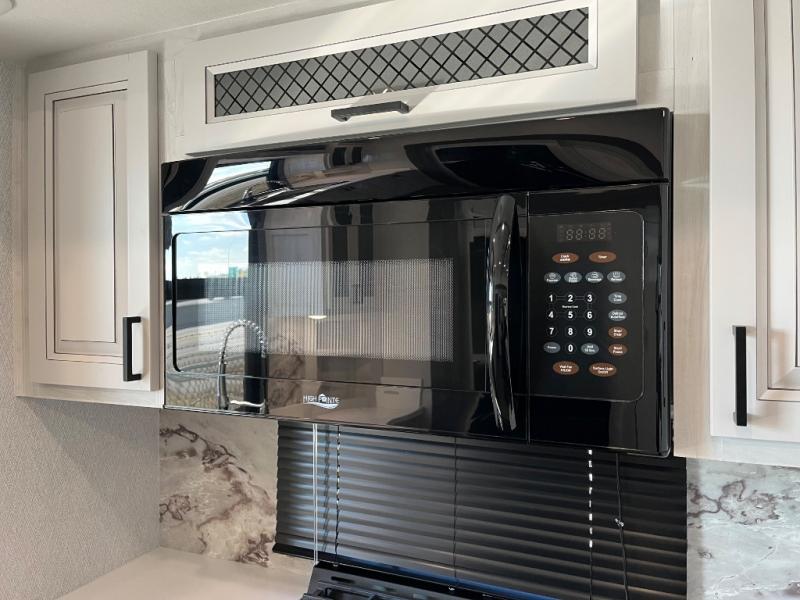The spacious rear kitchen is equipped with a 30” microwave, 24” residential oven, overhead cabinets, breakfast bar with bar stools, walk-in pantry, and 16 cu. ft. refrigerator, perfect for cooking all your favorite dishes with the greatest convenience The living room is the heart of the home, featuring a desk with chairs, theater seating, two 60” trifold sofas, a TV with fireplace, and more. And when nature calls, you'll appreciate the convenient half bath with overhead cabinets and washer and dryer prep. The main bedroom is a serene retreat, featuring a king bed, drawers under the bed, a bedroom fireplace, and more. This is the perfect place to relax and recharge after a long day of adventure, and with a front full bathroom featuring a 30” x 40” shower, dual sink vanity, walk-in closet, dresser/drawers, you'll have everything you need to stay clean and comfortable on the go. Outside, you'll find not one, but two awnings to providing plenty of shade and protection from the elements.