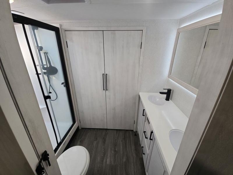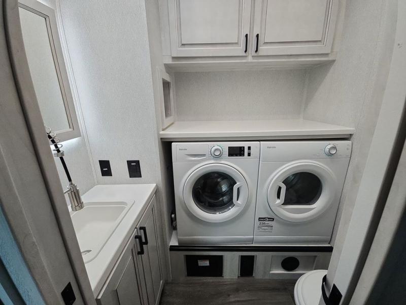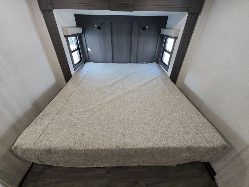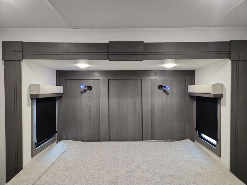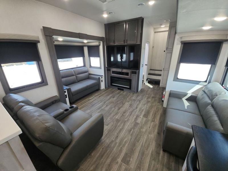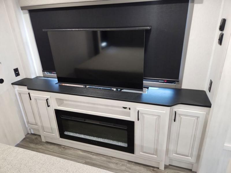 The spacious rear kitchen is equipped with a 30” microwave, 24” residential oven, overhead cabinets, breakfast bar with bar stools, walk-in pantry, and 16 cu. ft. refrigerator, perfect for cooking all your favorite dishes with the greatest convenience The living room is the heart of the home, featuring a desk with chairs, theater seating, two 60” trifold sofas, a TV with fireplace, and more. And when nature calls, you'll appreciate the convenient half bath with overhead cabinets and washer and dryer prep. The main bedroom is a serene retreat, featuring a king bed, drawers under the bed, a bedroom fireplace, and more. This is the perfect place to relax and recharge after a long day of adventure, and with a front full bathroom featuring a 30” x 40” shower, dual sink vanity, walk-in closet, dresser/drawers, you'll have everything you need to stay clean and comfortable on the go. Outside, you'll find not one, but two awnings to providing plenty of shade and protection from the elements.
