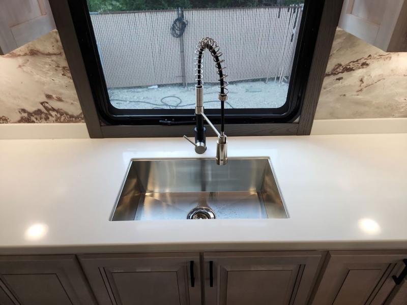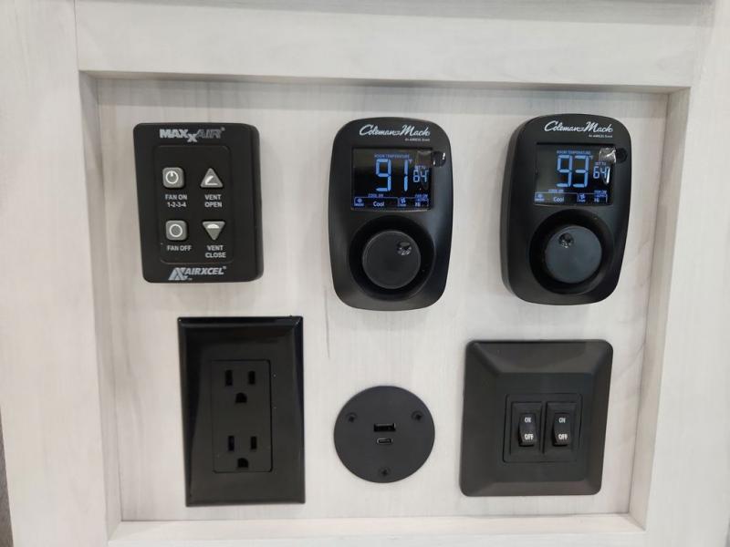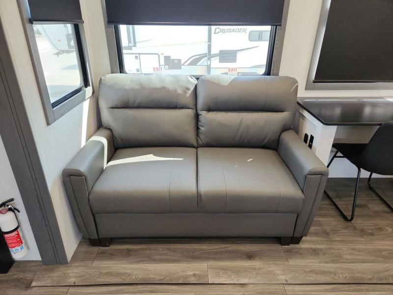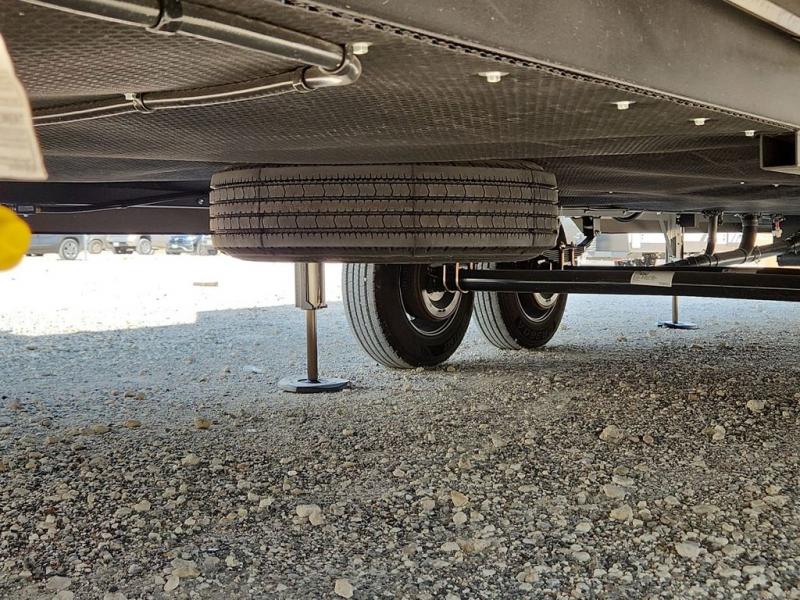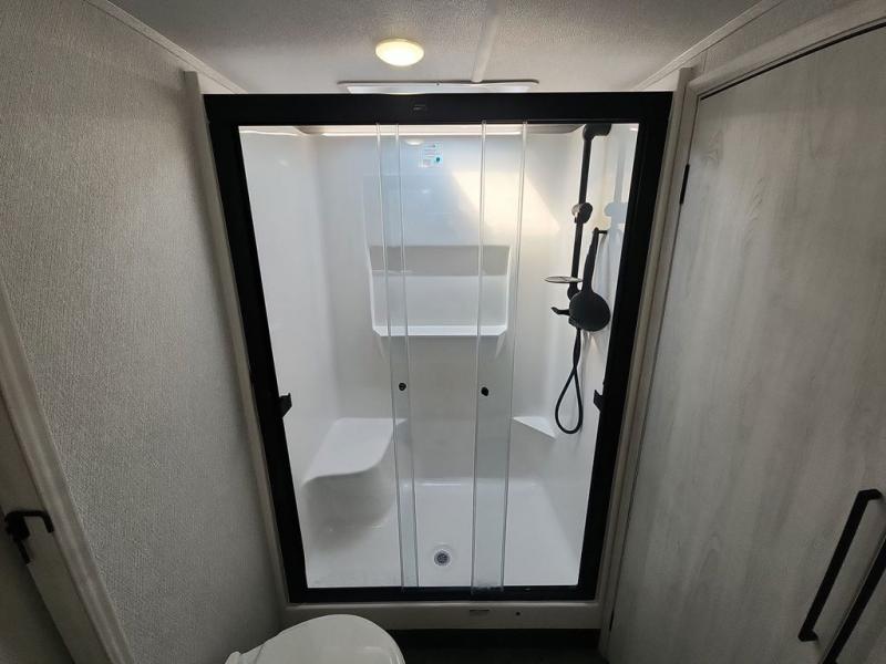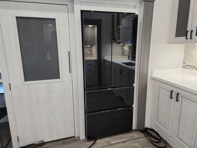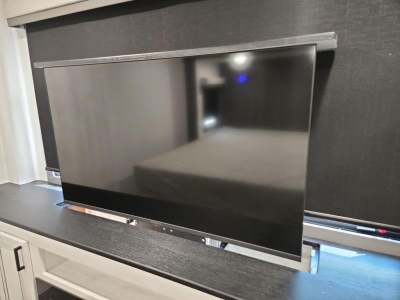 The spacious rear kitchen is equipped with a 30” microwave, 24” residential oven, overhead cabinets, breakfast bar with bar stools, walk-in pantry, and 16 cu. ft. refrigerator, perfect for cooking all your favorite dishes with the greatest convenience The living room is the heart of the home, featuring a desk with chairs, theater seating, two 60” trifold sofas, a TV with fireplace, and more. And when nature calls, you'll appreciate the convenient half bath with overhead cabinets and washer and dryer prep. The main bedroom is a serene retreat, featuring a king bed, drawers under the bed, a bedroom fireplace, and more. This is the perfect place to relax and recharge after a long day of adventure, and with a front full bathroom featuring a 30” x 40” shower, dual sink vanity, walk-in closet, dresser/drawers, you'll have everything you need to stay clean and comfortable on the go. Outside, you'll find not one, but two awnings to providing plenty of shade and protection from the elements.
