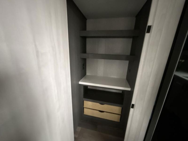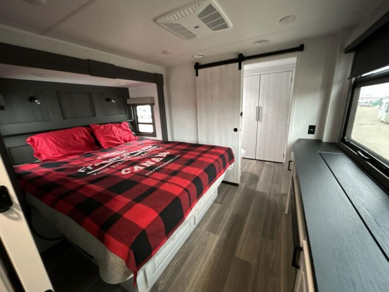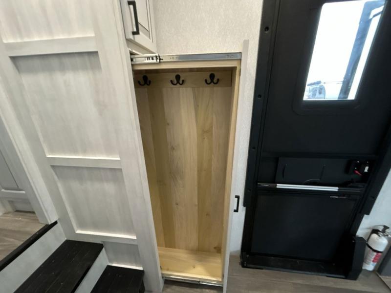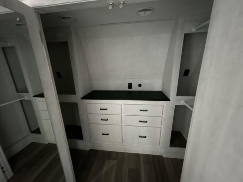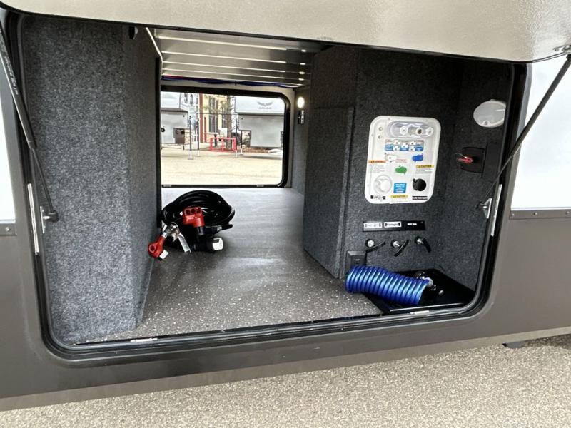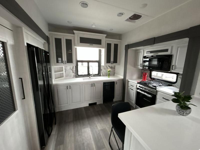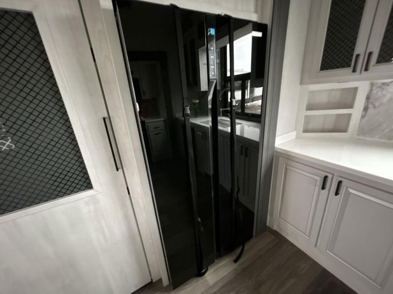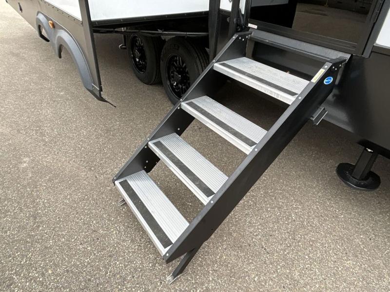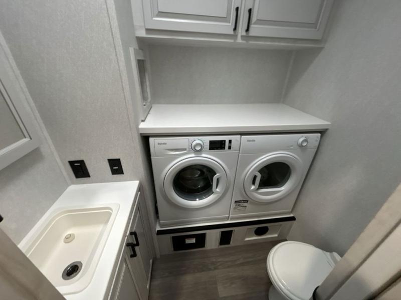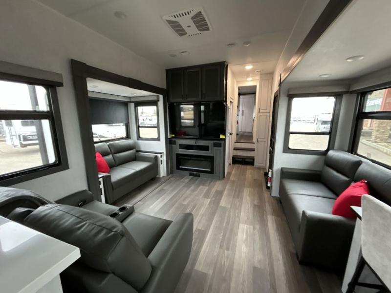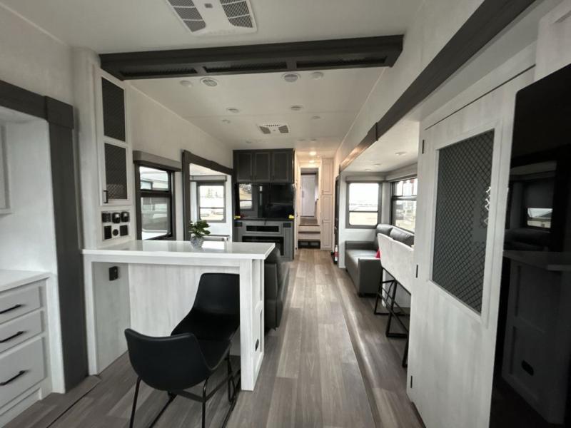 The spacious rear kitchen is equipped with a 30” microwave, 24” residential oven, overhead cabinets, breakfast bar with bar stools, walk-in pantry, and 16 cu. ft. refrigerator, perfect for cooking all your favorite dishes with the greatest convenience The living room is the heart of the home, featuring a desk with chairs, theater seating, two 60” trifold sofas, a TV with fireplace, and more. And when nature calls, you'll appreciate the convenient half bath with overhead cabinets and washer and dryer prep. The main bedroom is a serene retreat, featuring a king bed, drawers under the bed, a bedroom fireplace, and more. This is the perfect place to relax and recharge after a long day of adventure, and with a front full bathroom featuring a 30” x 40” shower, dual sink vanity, walk-in closet, dresser/drawers, you'll have everything you need to stay clean and comfortable on the go. Outside, you'll find not one, but two awnings to providing plenty of shade and protection from the elements.