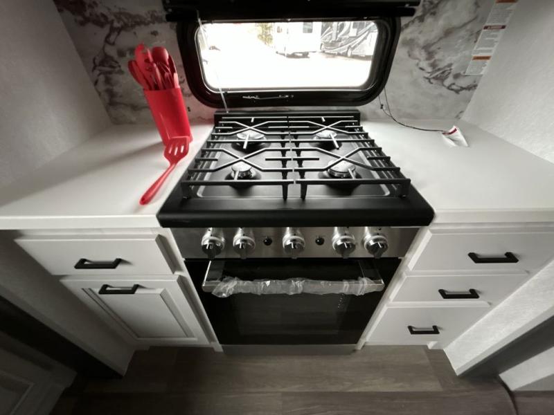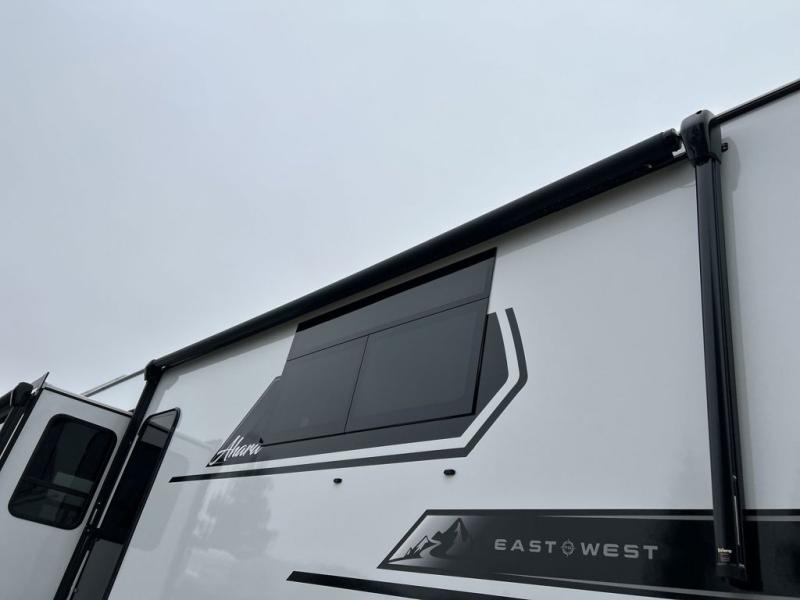 There is just too much luxury to name on the EAST TO WEST Ahara fifth wheel! These units are quite impressive, and once you see them, you'll know what we mean. The Ahara first grabs your attention with its fully painted aerodynamic fiberglass front cap, 102" wide-body chassis, and deep tint square frameless windows. For towing, you'll find a MORryde CRE 3000 suspension, LED marker lights, LED taillights with back-up lights, and rear view camera prep. Traveling in different climates is also made easy with the high-efficiency triple A/C system, 40,000 BTU high-capacity furnace, plus heated, insulated, and enclosed underbelly found within the Climate Package. Head inside to enjoy Slow Rise roller shades, a flush floor kitchen slide to help prevent trips, and solid surface countertops in the kitchen and bath to name a few luxuries!