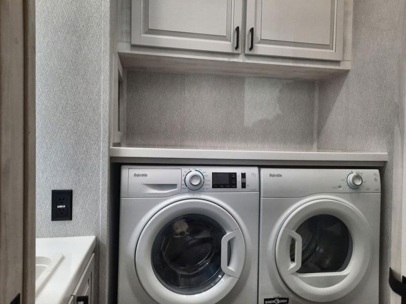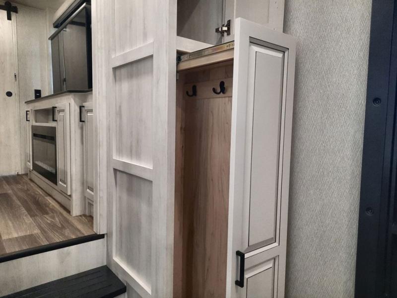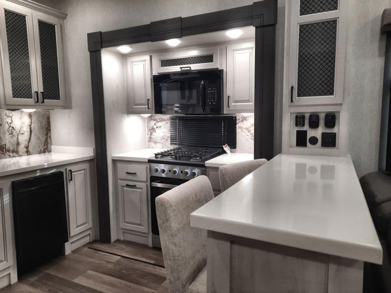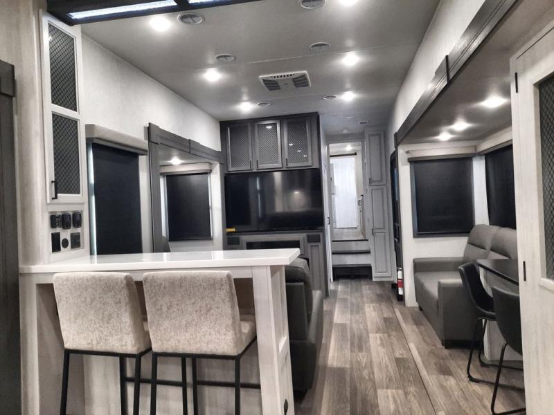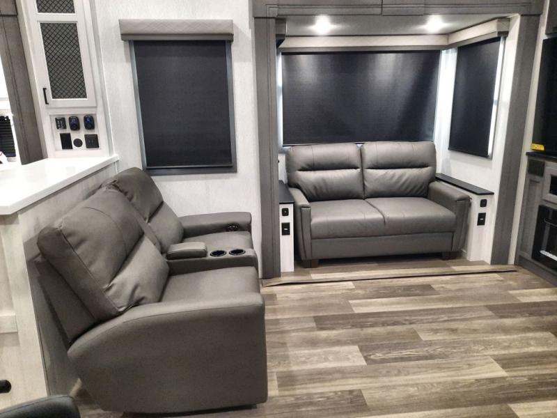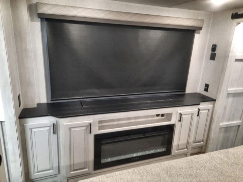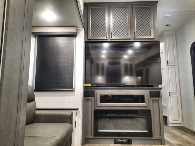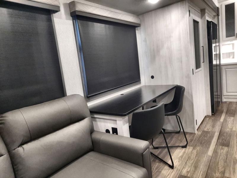 The spacious rear kitchen is equipped with a 30” microwave, 24” residential oven, overhead cabinets, breakfast bar with bar stools, walk-in pantry, and 16 cu. ft. refrigerator, perfect for cooking all your favorite dishes with the greatest convenience The living room is the heart of the home, featuring a desk with chairs, theater seating, two 60” trifold sofas, a TV with fireplace, and more. And when nature calls, you'll appreciate the convenient half bath with overhead cabinets and washer and dryer prep. The main bedroom is a serene retreat, featuring a king bed, drawers under the bed, a bedroom fireplace, and more. This is the perfect place to relax and recharge after a long day of adventure, and with a front full bathroom featuring a 30” x 40” shower, dual sink vanity, walk-in closet, dresser/drawers, you'll have everything you need to stay clean and comfortable on the go. Outside, you'll find not one, but two awnings to providing plenty of shade and protection from the elements.