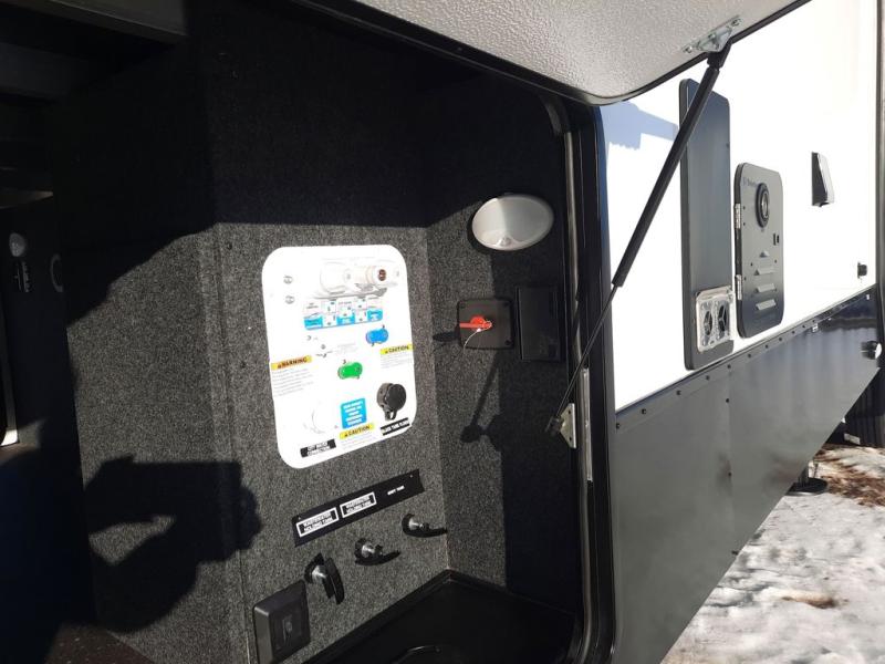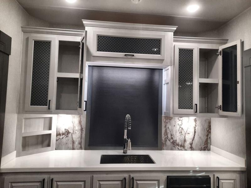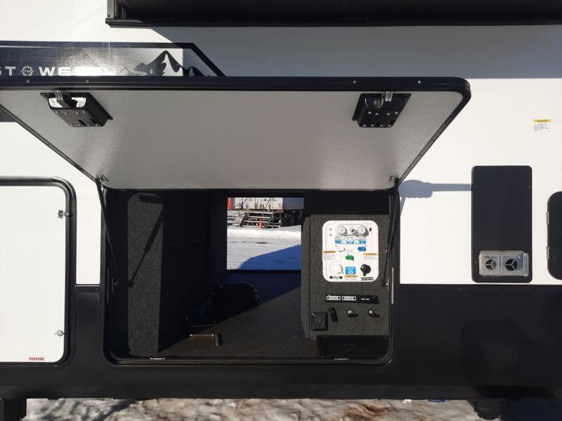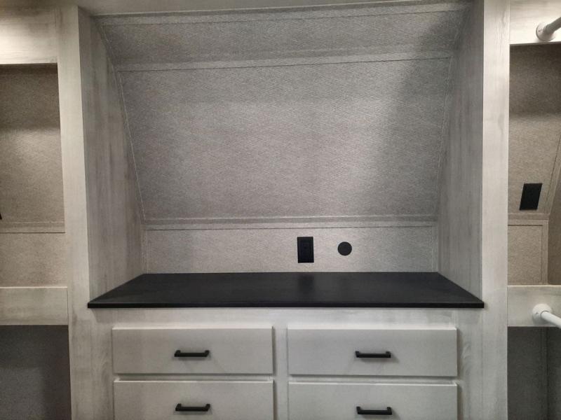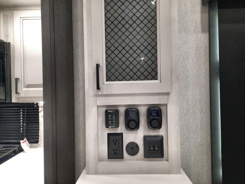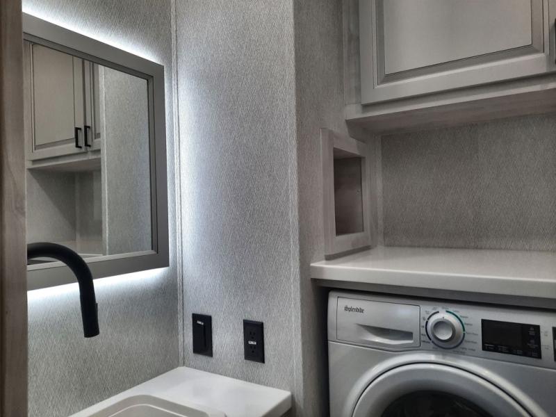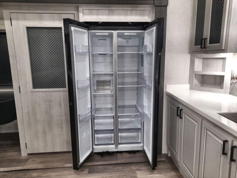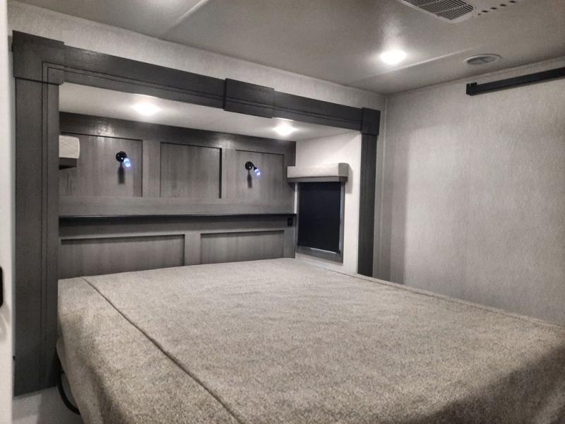 The spacious rear kitchen is equipped with a 30” microwave, 24” residential oven, overhead cabinets, breakfast bar with bar stools, walk-in pantry, and 16 cu. ft. refrigerator, perfect for cooking all your favorite dishes with the greatest convenience The living room is the heart of the home, featuring a desk with chairs, theater seating, two 60” trifold sofas, a TV with fireplace, and more. And when nature calls, you'll appreciate the convenient half bath with overhead cabinets and washer and dryer prep. The main bedroom is a serene retreat, featuring a king bed, drawers under the bed, a bedroom fireplace, and more. This is the perfect place to relax and recharge after a long day of adventure, and with a front full bathroom featuring a 30” x 40” shower, dual sink vanity, walk-in closet, dresser/drawers, you'll have everything you need to stay clean and comfortable on the go. Outside, you'll find not one, but two awnings to providing plenty of shade and protection from the elements.