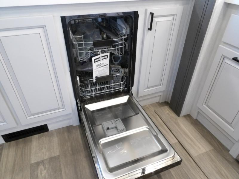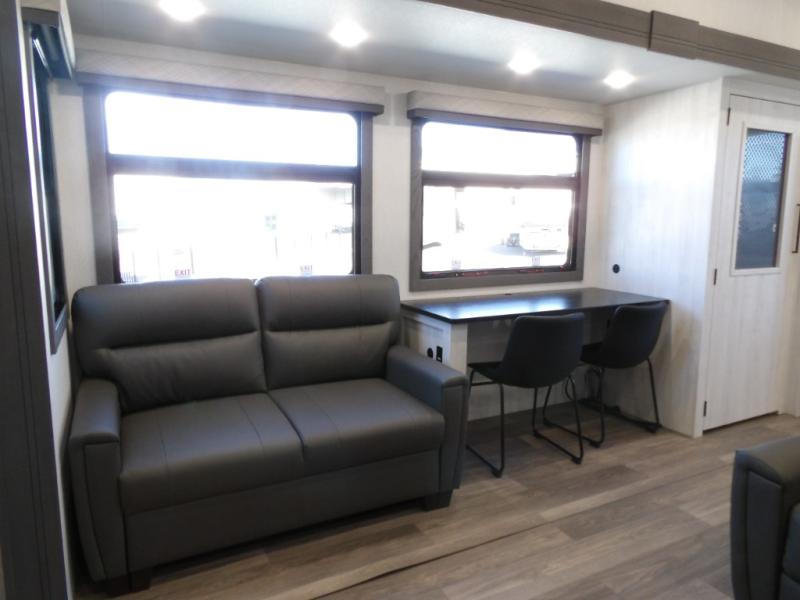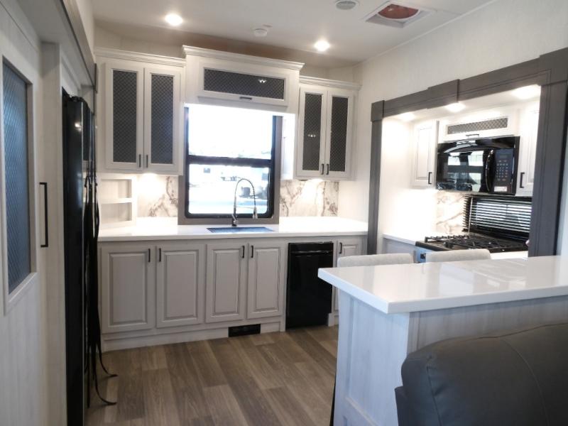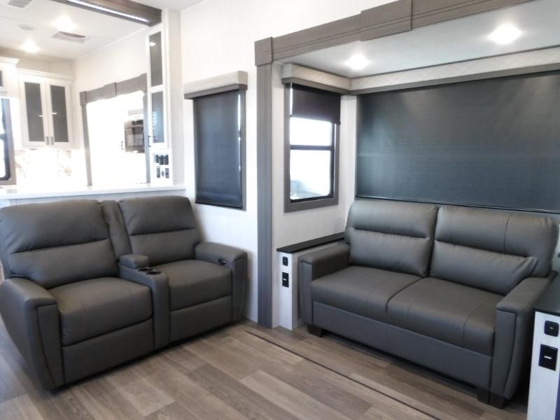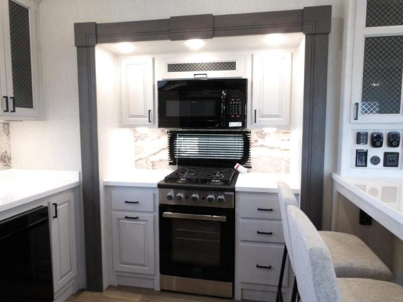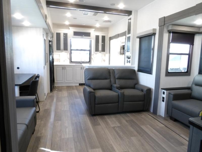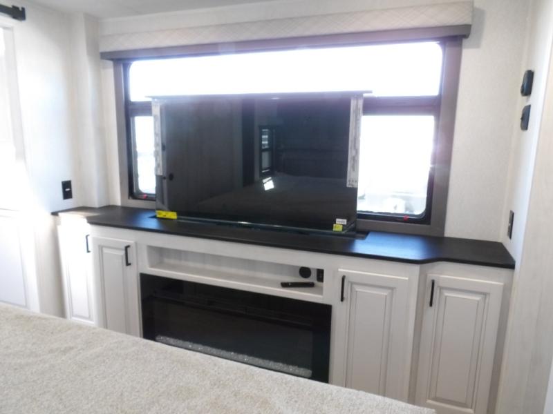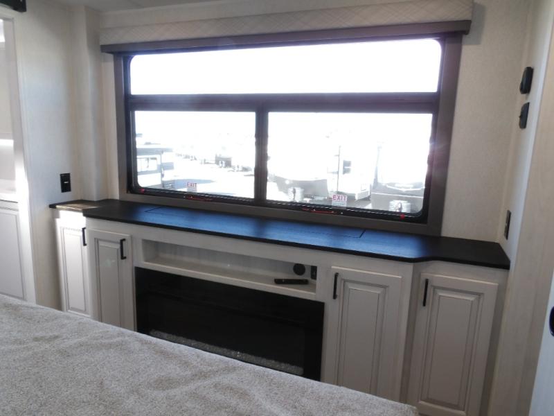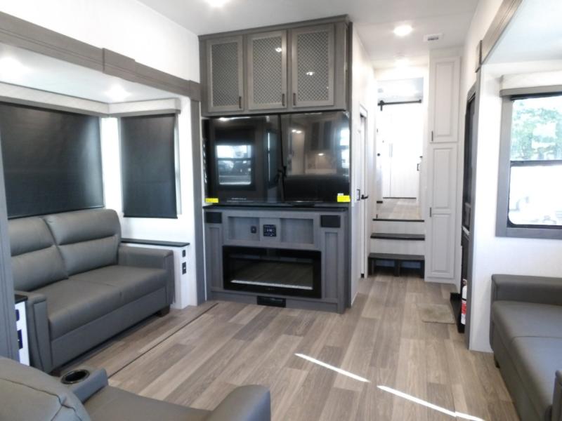 The spacious rear kitchen is equipped with a 30” microwave, 24” residential oven, overhead cabinets, breakfast bar with bar stools, walk-in pantry, and 16 cu. ft. refrigerator, perfect for cooking all your favorite dishes with the greatest convenience The living room is the heart of the home, featuring a desk with chairs, theater seating, two 60” trifold sofas, a TV with fireplace, and more. And when nature calls, you'll appreciate the convenient half bath with overhead cabinets and washer and dryer prep. The main bedroom is a serene retreat, featuring a king bed, drawers under the bed, a bedroom fireplace, and more. This is the perfect place to relax and recharge after a long day of adventure, and with a front full bathroom featuring a 30” x 40” shower, dual sink vanity, walk-in closet, dresser/drawers, you'll have everything you need to stay clean and comfortable on the go. Outside, you'll find not one, but two awnings to providing plenty of shade and protection from the elements.