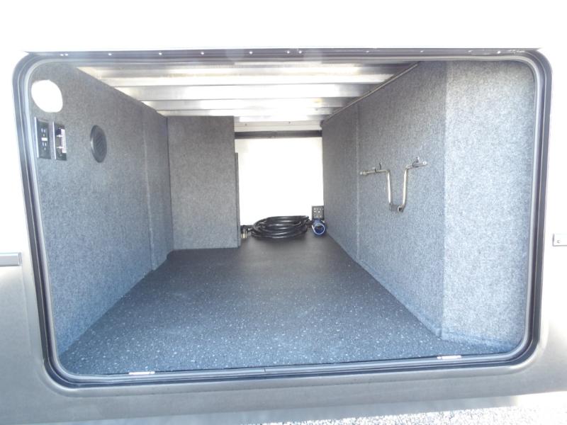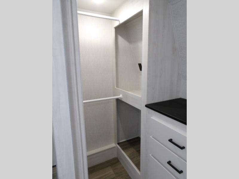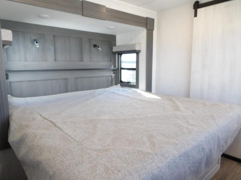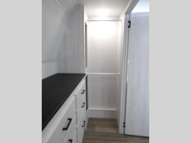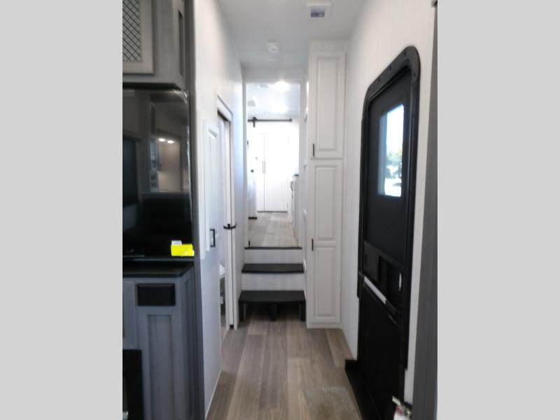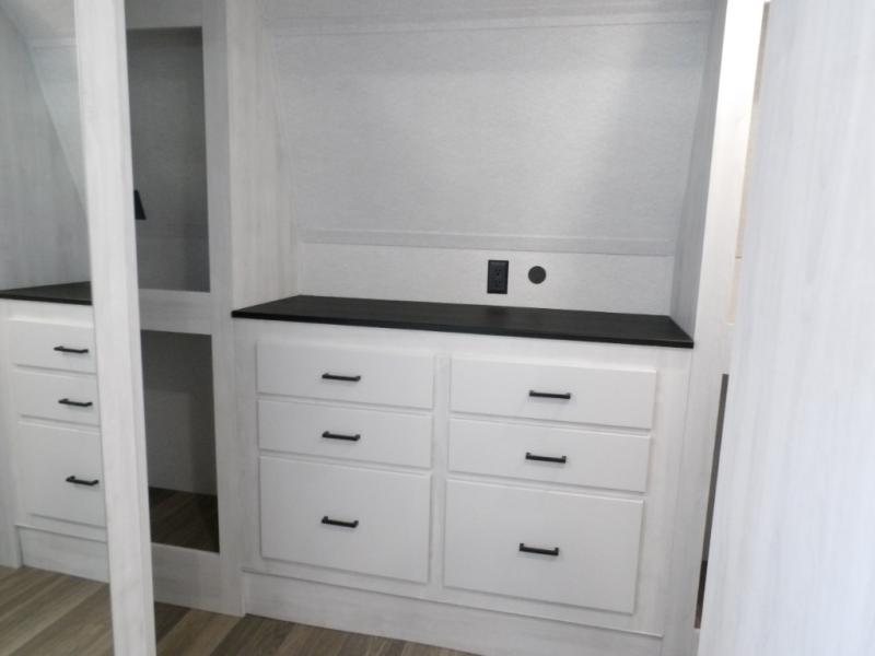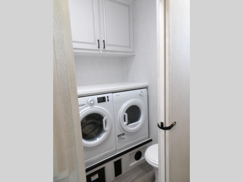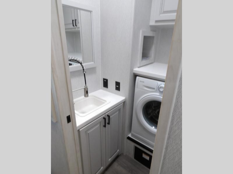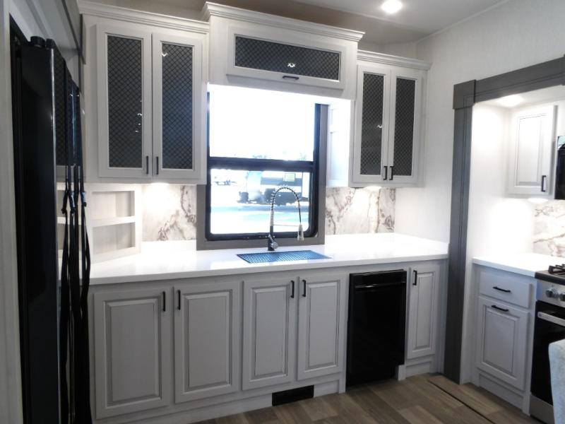 The spacious rear kitchen is equipped with a 30” microwave, 24” residential oven, overhead cabinets, breakfast bar with bar stools, walk-in pantry, and 16 cu. ft. refrigerator, perfect for cooking all your favorite dishes with the greatest convenience The living room is the heart of the home, featuring a desk with chairs, theater seating, two 60” trifold sofas, a TV with fireplace, and more. And when nature calls, you'll appreciate the convenient half bath with overhead cabinets and washer and dryer prep. The main bedroom is a serene retreat, featuring a king bed, drawers under the bed, a bedroom fireplace, and more. This is the perfect place to relax and recharge after a long day of adventure, and with a front full bathroom featuring a 30” x 40” shower, dual sink vanity, walk-in closet, dresser/drawers, you'll have everything you need to stay clean and comfortable on the go. Outside, you'll find not one, but two awnings to providing plenty of shade and protection from the elements.