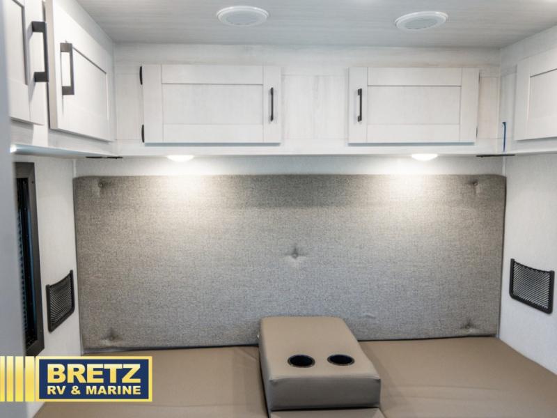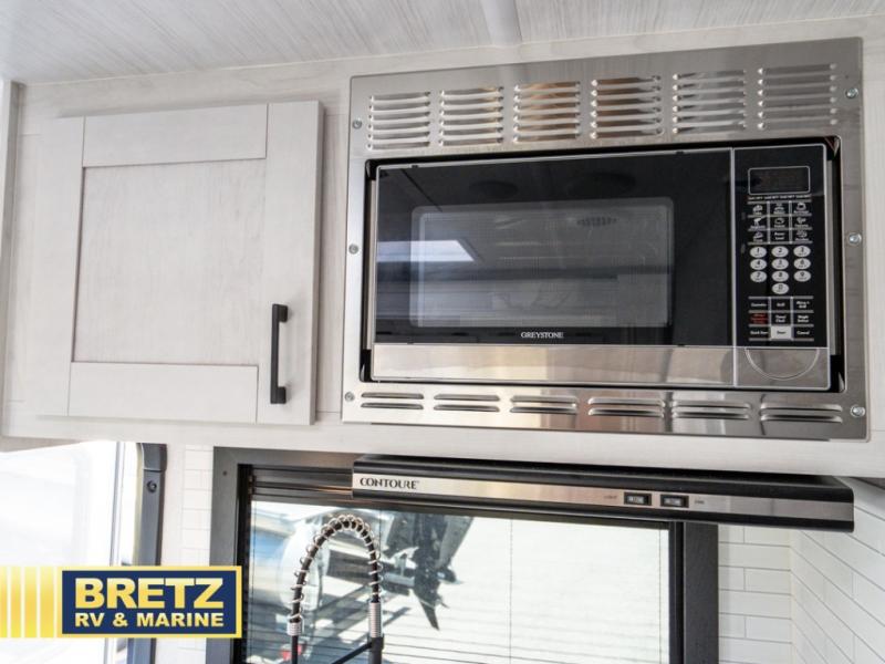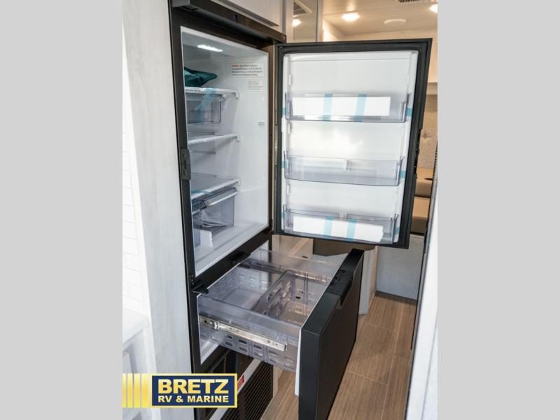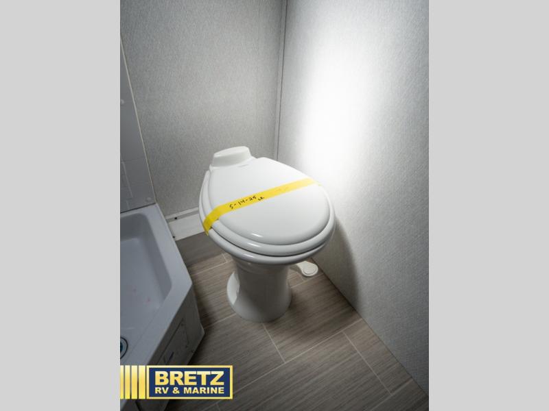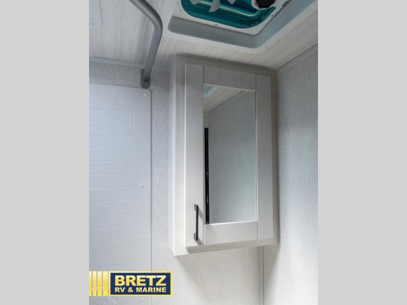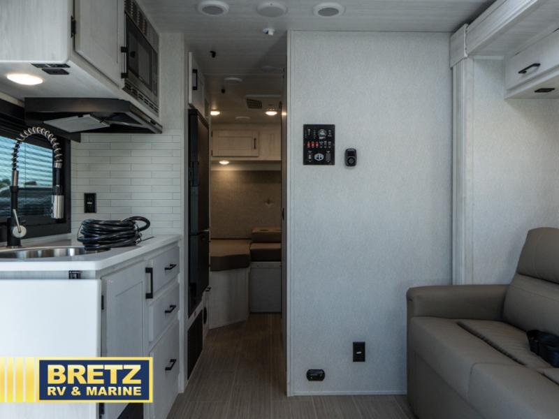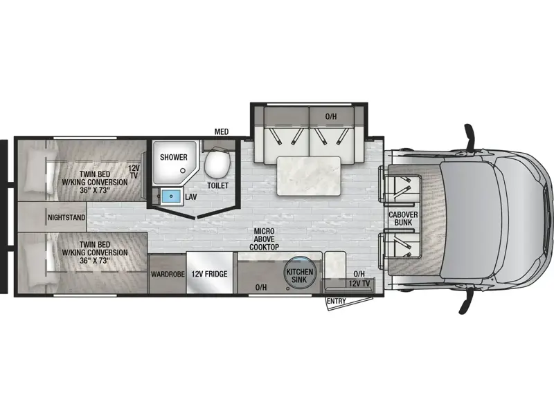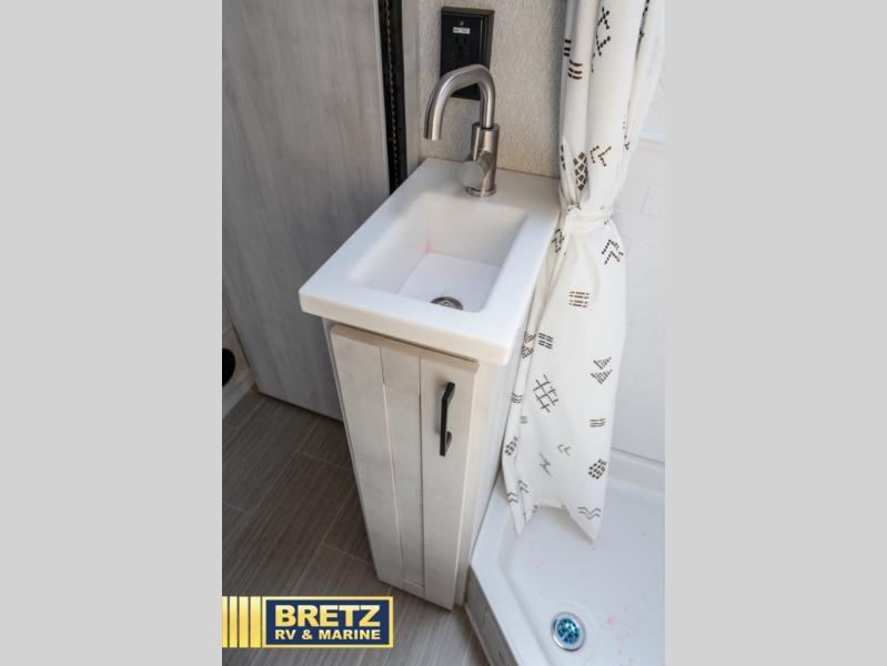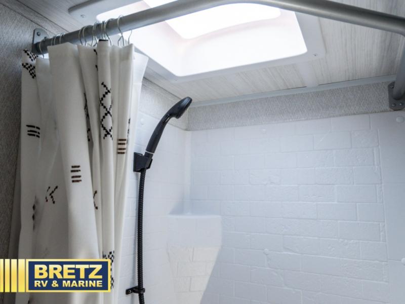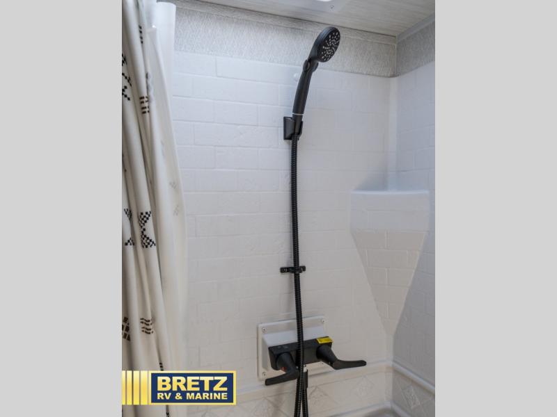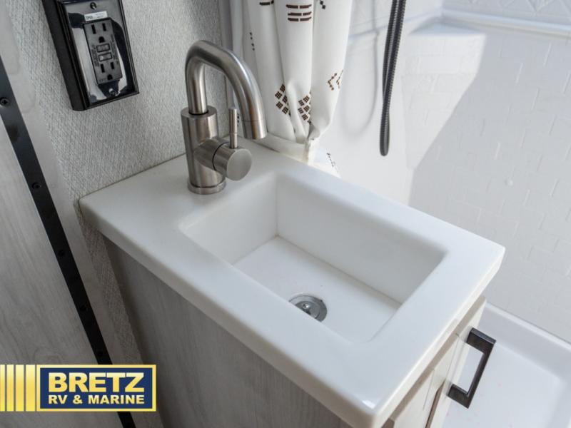 Whether you are traveling to your favorite campground or across the country, you are going to love this motorhome. You will have versatility in this coach to travel with a friend or your sweetheart with two twin beds that can easily convert to a king bed if you like. Each bed is 36" x 73" with a nightstand between and overhead storage along both sides and across the rear of the unit providing plenty of space for your things. There is also a wardrobe off the foot of the twin that is on the curbside. For relaxing and dining a slide out sofa with removeable table, and more overhead storage here. The kitchen is opposite the slide on the door side and features a round hidden sink with solid surface cover for added prep space, a 12-volt 6 cu. ft. refrigerator for your perishables, and a microwave oven and induction cooktop for easy meals as you travel. When you want to get cleaned up, a bath with an angled shower, toilet, and sink, plus medicine cabinet for your toothbrush and razor. The doors both open out so you can actually create a more open space when in the bathroom making it the width of the unit.