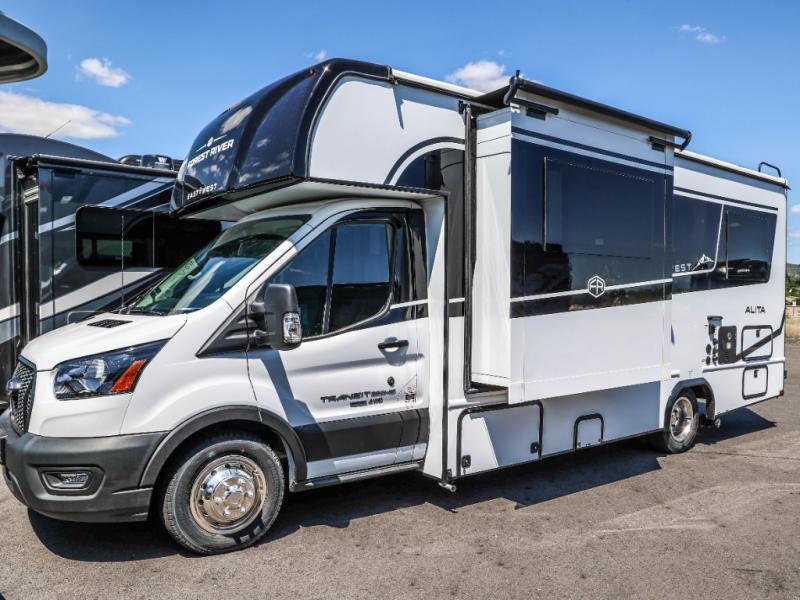 The Alita Class C gas motorhome is fueled by a 3.5L EcoBoost V6 engine which sits on the all-new Ford AWD 350 Transit chassis with 10-speed automatic Selectshift transmission. The Alita features Azdel composite sidewall and slidebox construction along with a one-piece automotive painted fiberglass front cap, Dicor Diflex II TPO roof membrane, and side port solar panel hook-up, plus more. On the inside, a cabover bunk for added sleeping or storage, a portable induction cooktop, a premium subway tile backsplash, and the Alita value package also features a luxury legless Girard awning with LED light strip, panoramic windows with integrated night shades for great views during the day and privacy when you want it at night. You will also appreciate the solar charge package option and so much more!