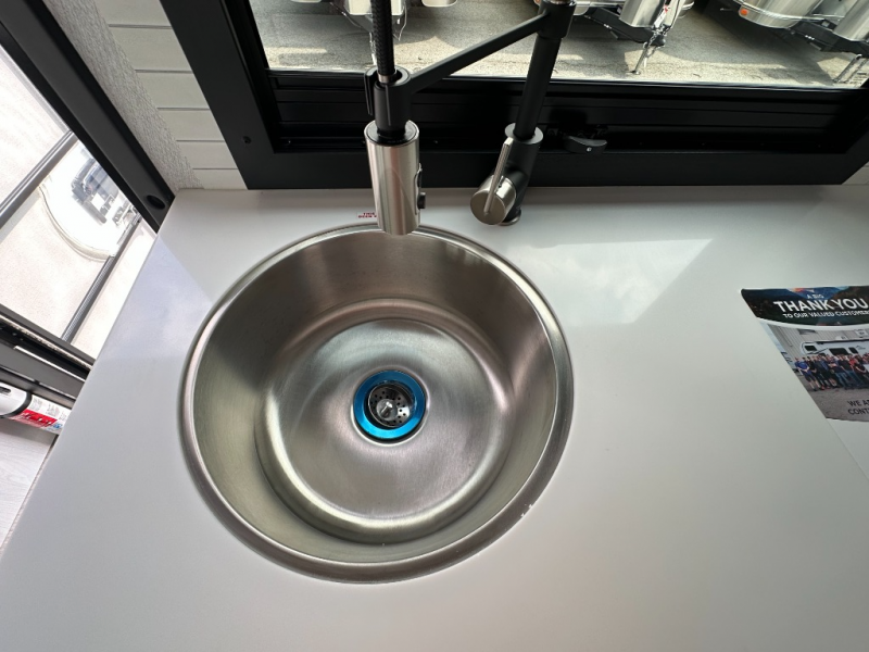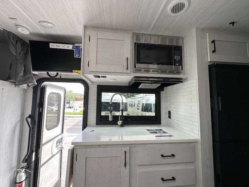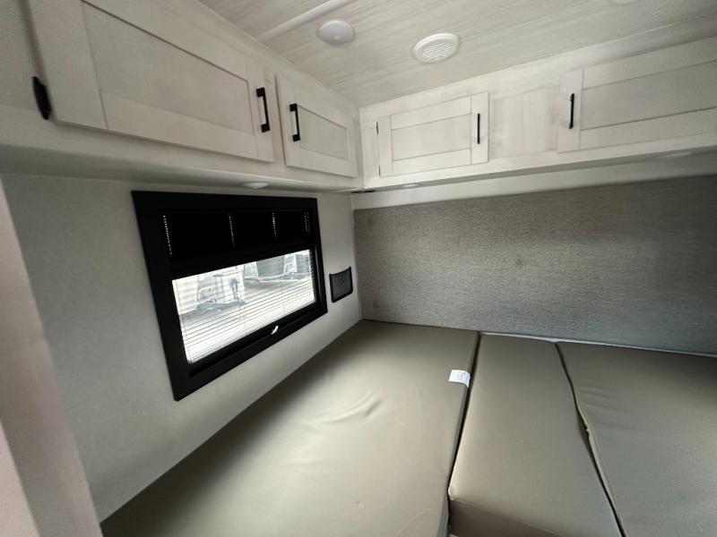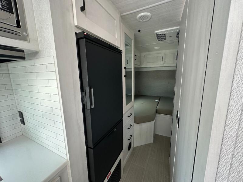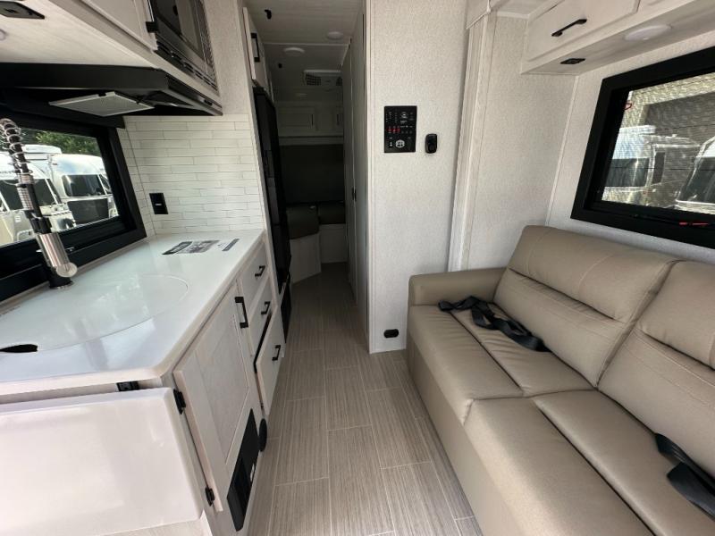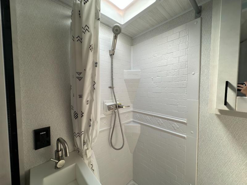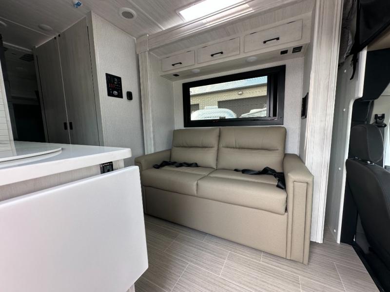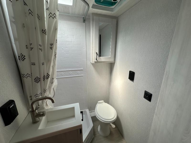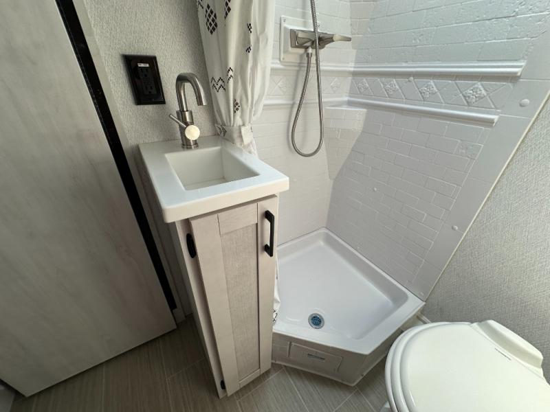 Whether you are traveling to your favorite campground or across the country, you are going to love this motorhome. You will have versatility in this coach to travel with a friend or your sweetheart with two twin beds that can easily convert to a king bed if you like. Each bed is 36" x 73" with a nightstand between and overhead storage along both sides and across the rear of the unit providing plenty of space for your things. There is also a wardrobe off the foot of the twin that is on the curbside. For relaxing and dining a slide out sofa with removeable table, and more overhead storage here. The kitchen is opposite the slide on the door side and features a round hidden sink with solid surface cover for added prep space, a 12-volt 6 cu. ft. refrigerator for your perishables, and a microwave oven and induction cooktop for easy meals as you travel. When you want to get cleaned up, a bath with an angled shower, toilet, and sink, plus medicine cabinet for your toothbrush and razor. The doors both open out so you can actually create a more open space when in the bathroom making it the width of the unit.