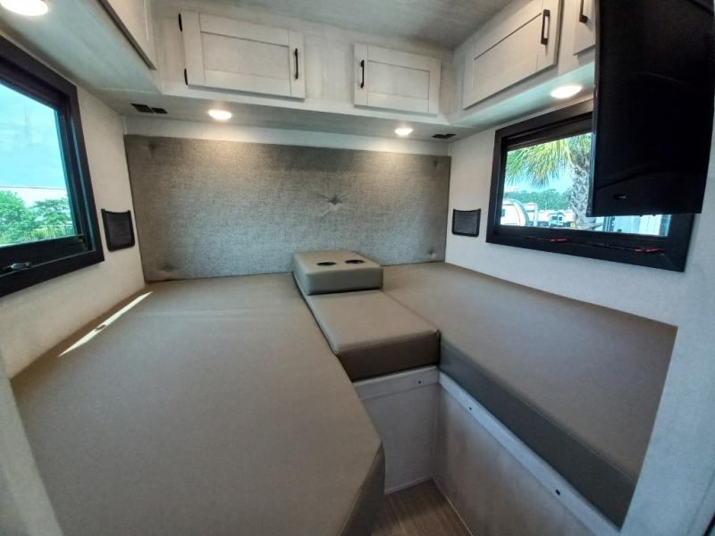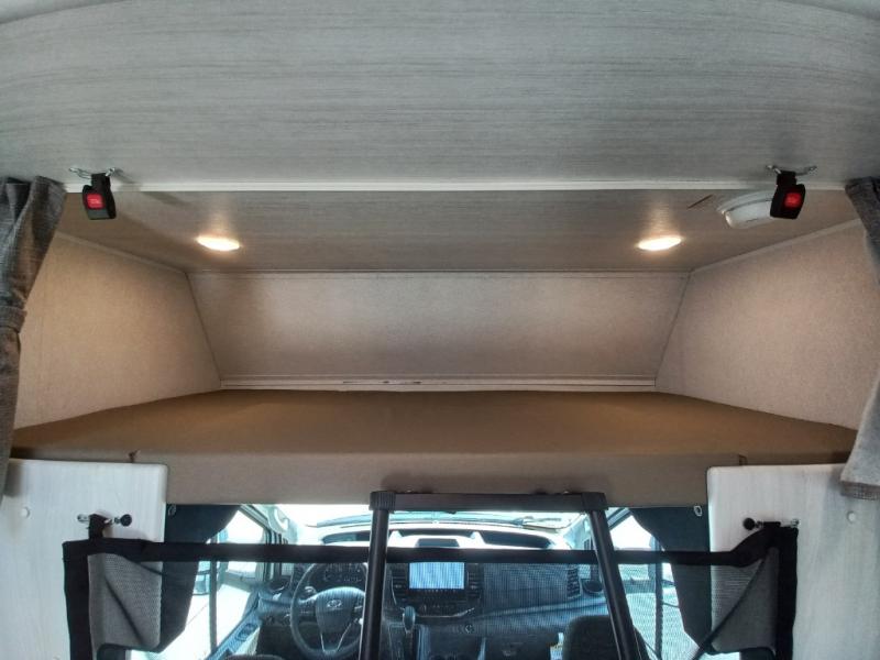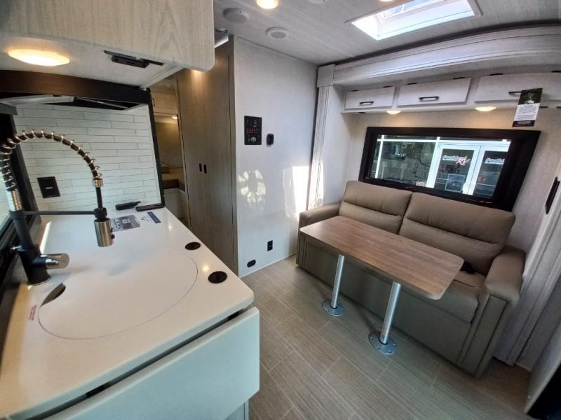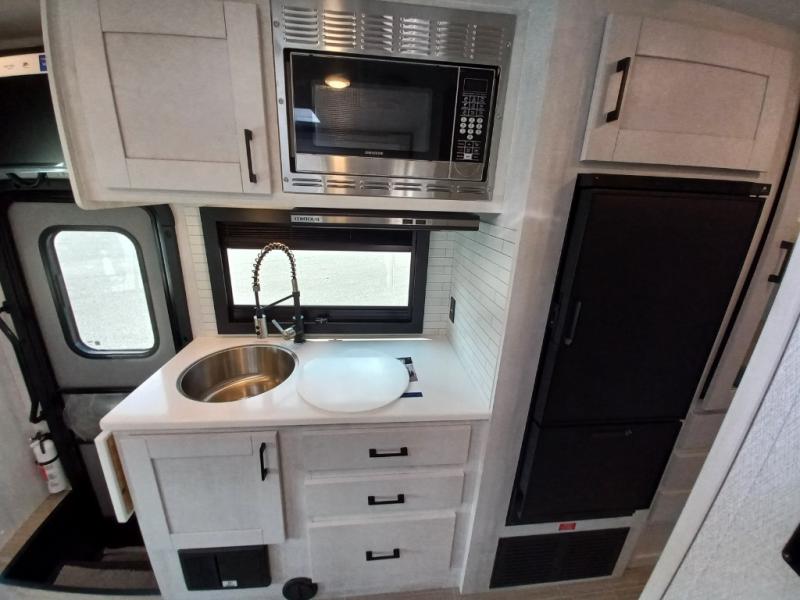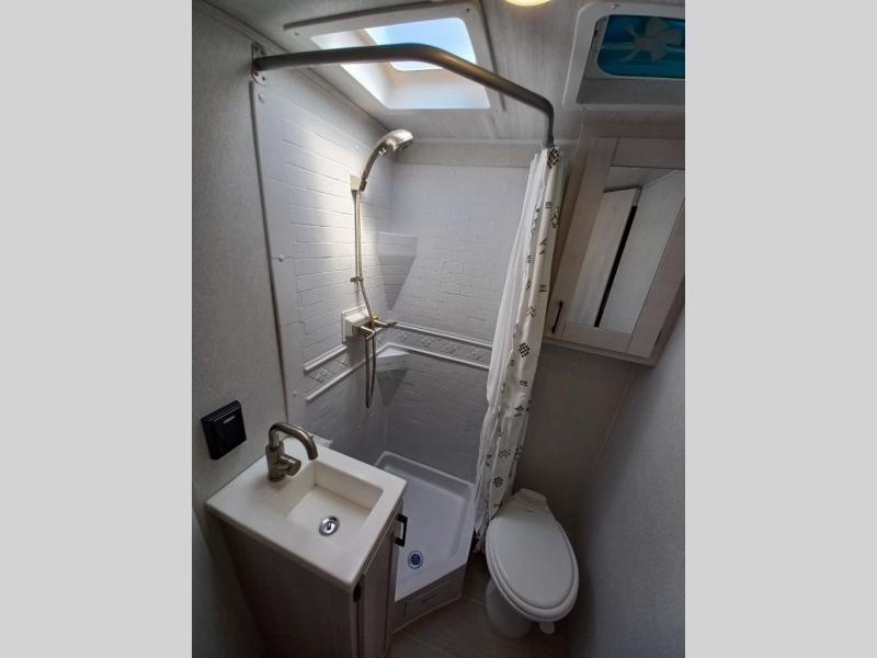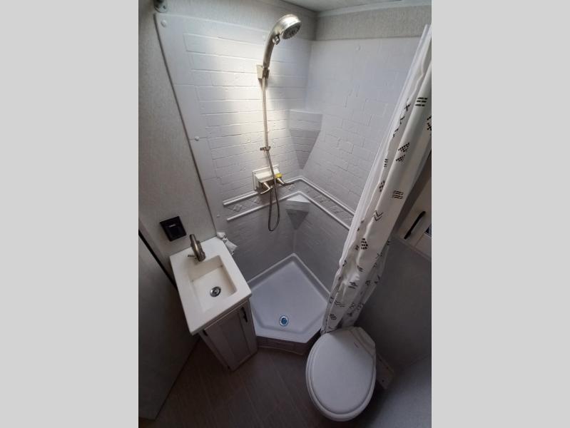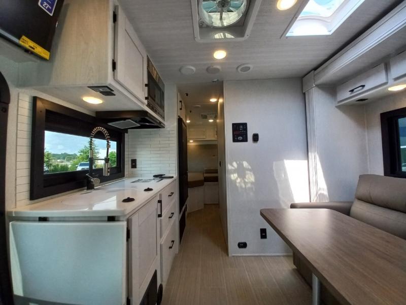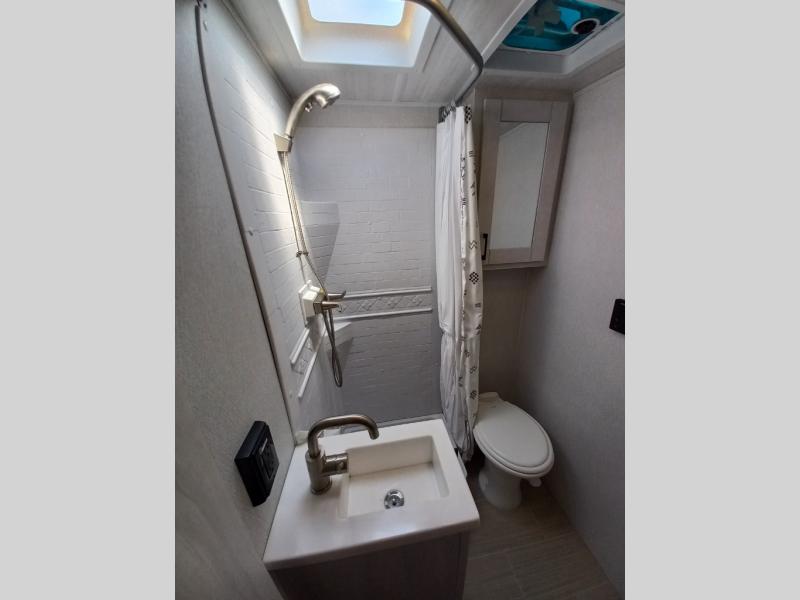Whether you are traveling to your favorite campground or across the country, you are going to love this motorhome. You will have versatility in this coach to travel with a friend or your sweetheart with two twin beds that can easily convert to a king bed if you like. Each bed is 36" x 73" with a nightstand between and overhead storage along both sides and across the rear of the unit providing plenty of space for your things. There is also a wardrobe off the foot of the twin that is on the curbside. For relaxing and dining a slide out sofa with removeable table, and more overhead storage here. The kitchen is opposite the slide on the door side and features a round hidden sink with solid surface cover for added prep space, a 12-volt 6 cu. ft. refrigerator for your perishables, and a microwave oven and induction cooktop for easy meals as you travel. When you want to get cleaned up, a bath with an angled shower, toilet, and sink, plus medicine cabinet for your toothbrush and razor. The doors both open out so you can actually create a more open space when in the bathroom making it the width of the unit.