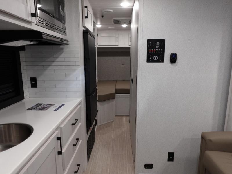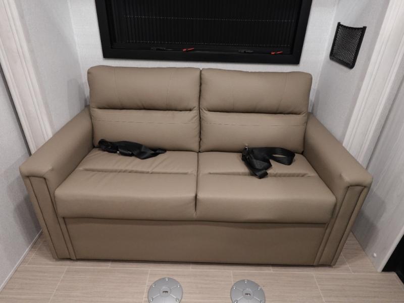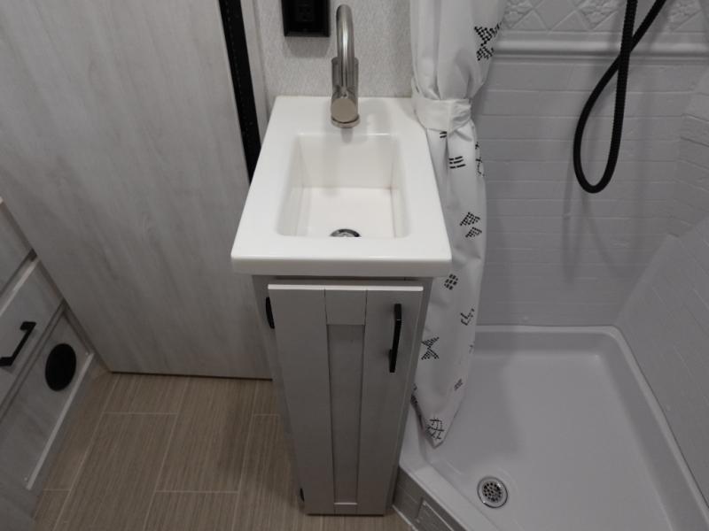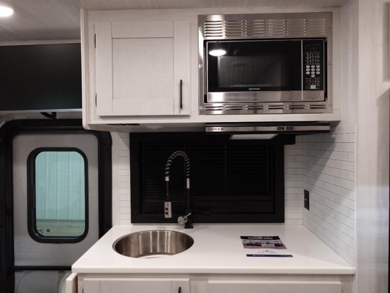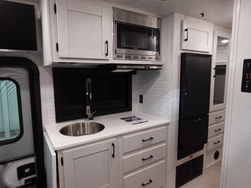 Whether you are traveling to your favorite campground or across the country, you are going to love this motorhome. You will have versatility in this coach to travel with a friend or your sweetheart with two twin beds that can easily convert to a king bed if you like. Each bed is 36" x 73" with a nightstand between and overhead storage along both sides and across the rear of the unit providing plenty of space for your things. There is also a wardrobe off the foot of the twin that is on the curbside. A sofa slide out with a table will provide a place to relax and dine together. The kitchen is opposite the slide on the door side and features a round hidden sink with solid surface cover for added prep space, a 12-volt 6 cu. ft. refrigerator for your perishables, and a microwave oven and induction cooktop for easy meals as you travel. When you want to get cleaned up, there is a bath with an angled shower, toilet, and sink, plus medicine cabinet for your toothbrush and razor.
