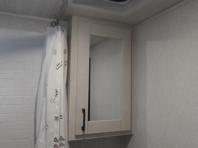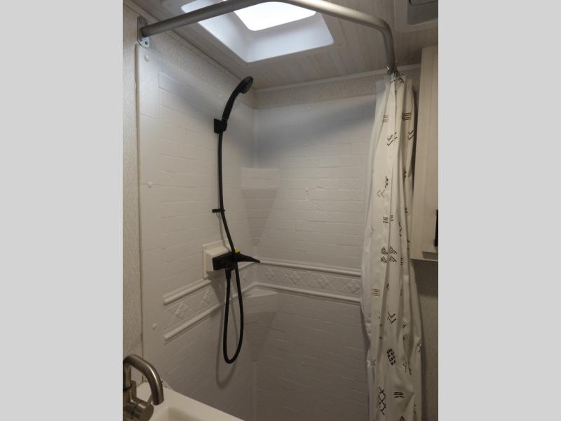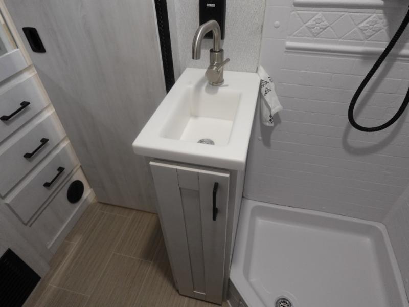 Whether you are traveling to your favorite campground or across the country, you are going to love this motorhome. You will have versatility in this coach to travel with a friend or your sweetheart with two twin beds that can easily convert to a king bed if you like. Each bed is 36" x 73" with a nightstand between and overhead storage along both sides and across the rear of the unit providing plenty of space for your things. There is also a wardrobe off the foot of the twin that is on the curbside. A sofa slide out with a table will provide a place to relax and dine together. The kitchen is opposite the slide on the door side and features a round hidden sink with solid surface cover for added prep space, a 12-volt 6 cu. ft. refrigerator for your perishables, and a microwave oven and induction cooktop for easy meals as you travel. When you want to get cleaned up, there is a bath with an angled shower, toilet, and sink, plus medicine cabinet for your toothbrush and razor.