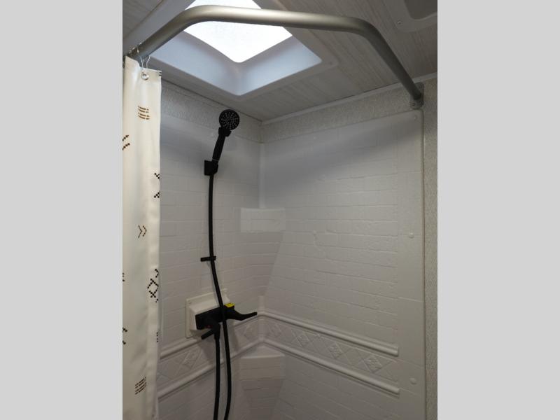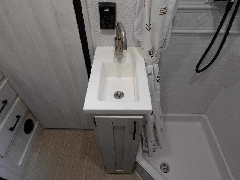 Whether you are traveling to your favorite campground or across the country, you are going to love this motorhome. You will have versatility in this coach to travel with a friend or your sweetheart with two twin beds that can easily convert to a king bed if you like. Each bed is 36" x 73" with a nightstand between and overhead storage along both sides and across the rear of the unit providing plenty of space for your things. There is also a wardrobe off the foot of the twin that is on the curbside. A sofa slide out with a table will provide a place to relax and dine together. The kitchen is opposite the slide on the door side and features a round hidden sink with solid surface cover for added prep space, a 12-volt 6 cu. ft. refrigerator for your perishables, and a microwave oven and induction cooktop for easy meals as you travel. When you want to get cleaned up, there is a bath with an angled shower, toilet, and sink, plus medicine cabinet for your toothbrush and razor.