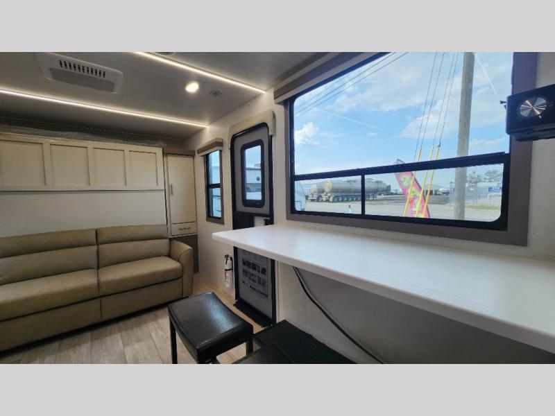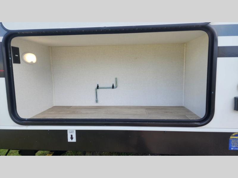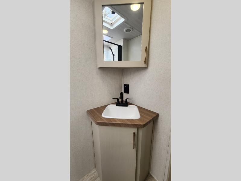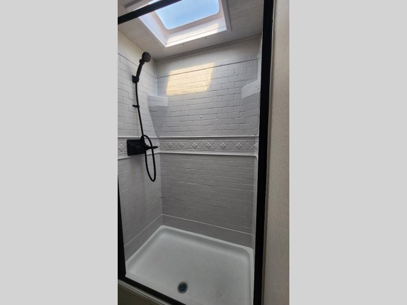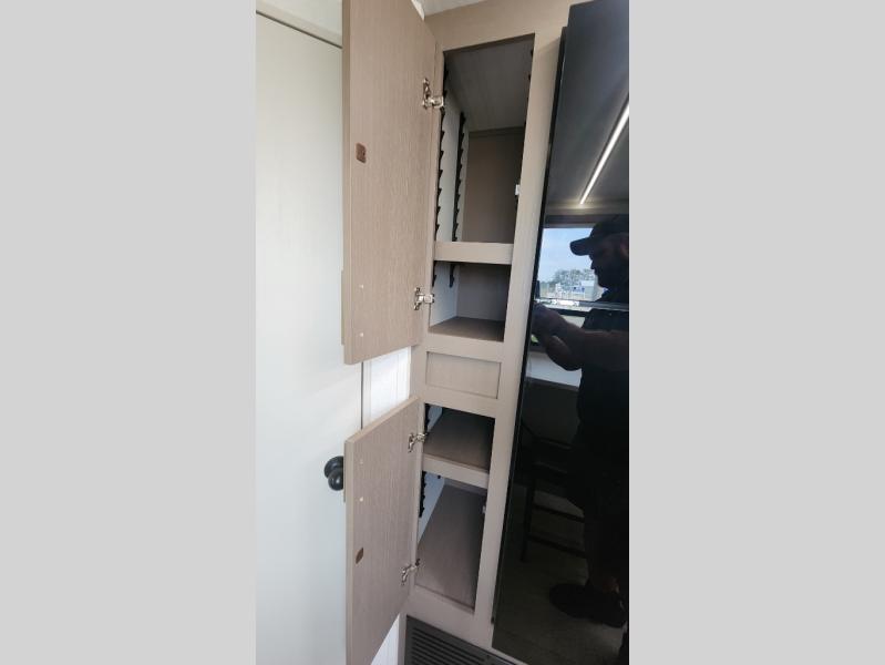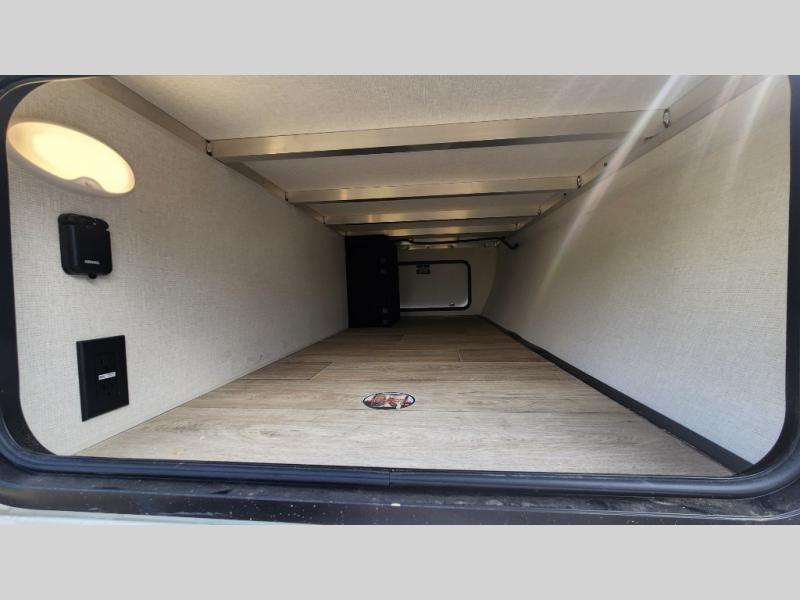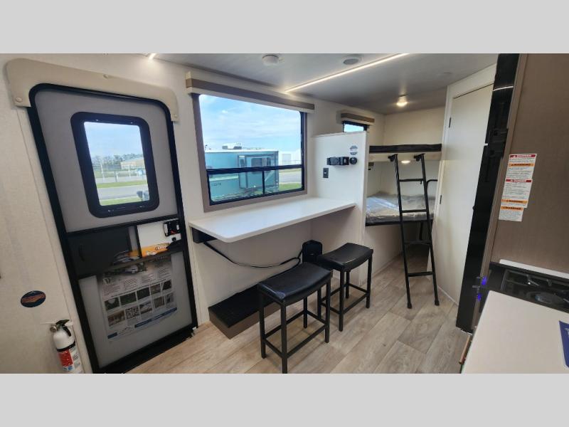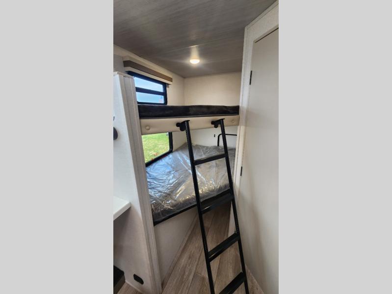 The trailer features double-size bunk beds, providing a cozy sleeping spot for kids. The queen Murphy bed offers a comfortable sleeping solution for adults, and can be folded up against the wall when not in use. Under it, you will find a sofa that offers a comfortable seating area for relaxation, plus, overhead shelves provide additional storage for linens, clothes, and other essentials. The kitchen is equipped with a pantry for storing food and snacks, a refrigerator for keeping drinks and meals fresh, a microwave for quick reheating, and overhead cabinets that offer additional storage for cookware and dishes. Additionally, the full bathroom is equipped with everything you need for a comfortable stay, providing a convenient spot to freshen up after a long day of exploring.