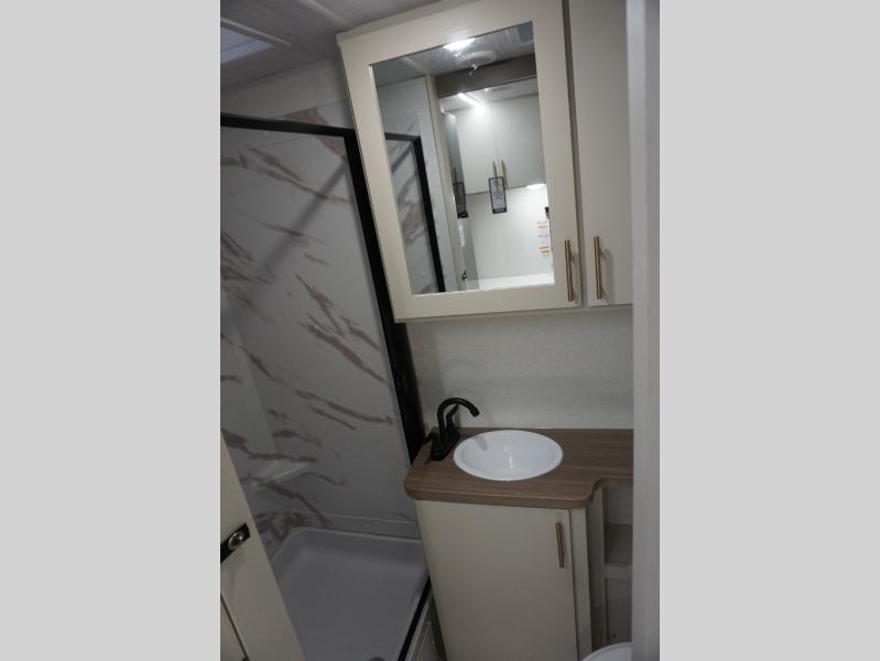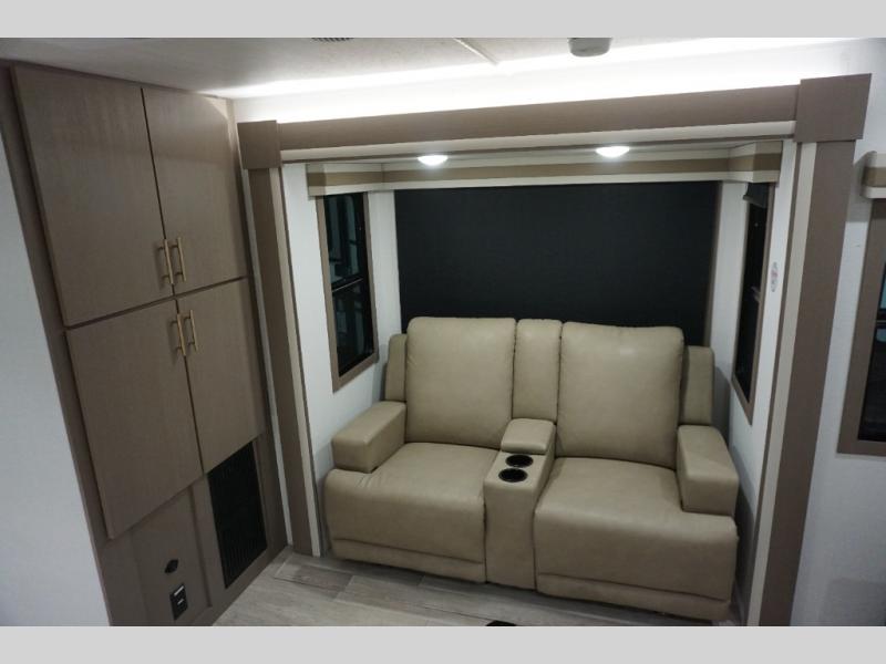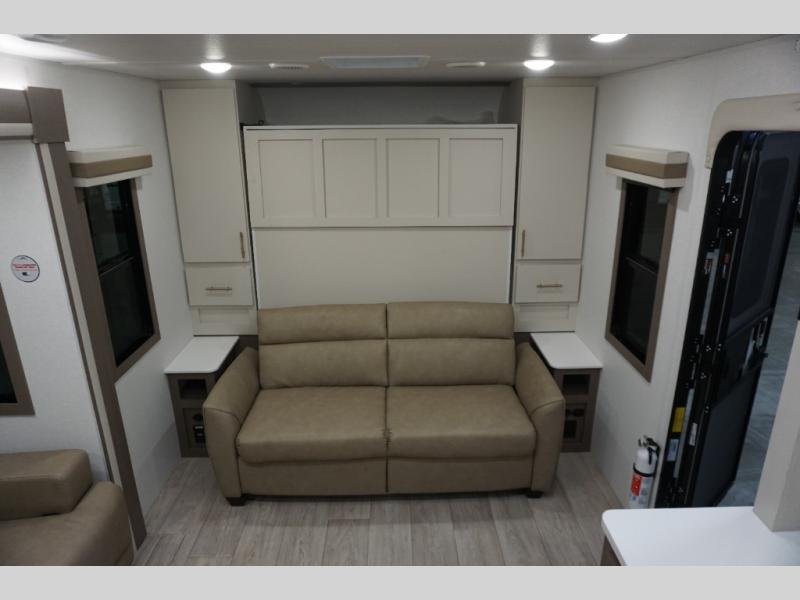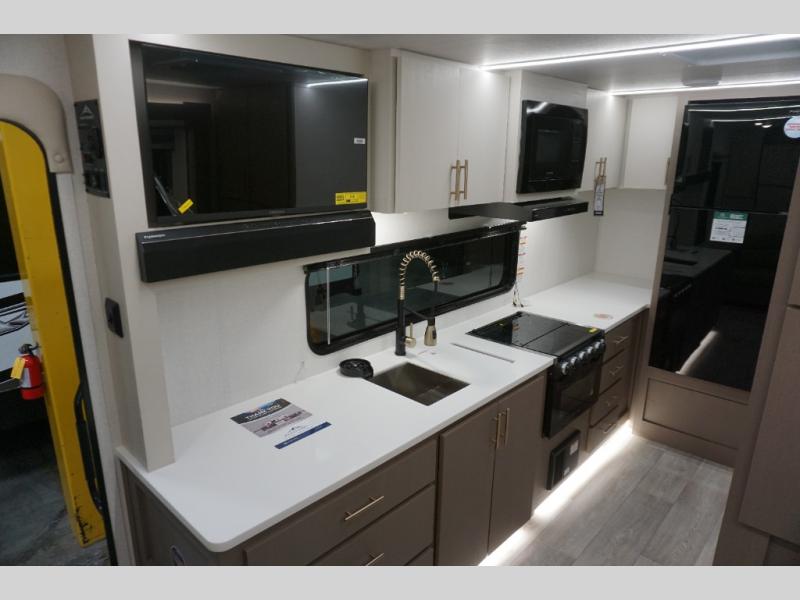 If you're looking for the perfect travel trailer for weekend getaways you've found it in this Alta model. The queen Murphy bed up front can be folded up in the morning so you can relax on the sofa, or you may just want to enjoy your coffee on the tri-fold sofa that can be optioned out for theater seats. Your meals can be prepared on the three burner cooktop or in the microwave oven, and you can dine outdoors under the 16' power awning. This model also includes a universal docking station for an all-in one location for you hookups and utilities. How convenient!