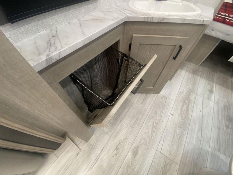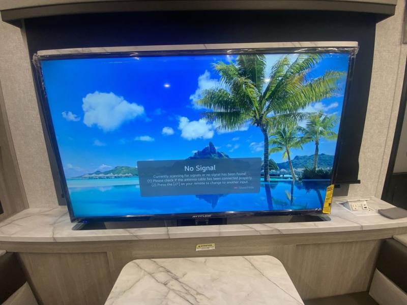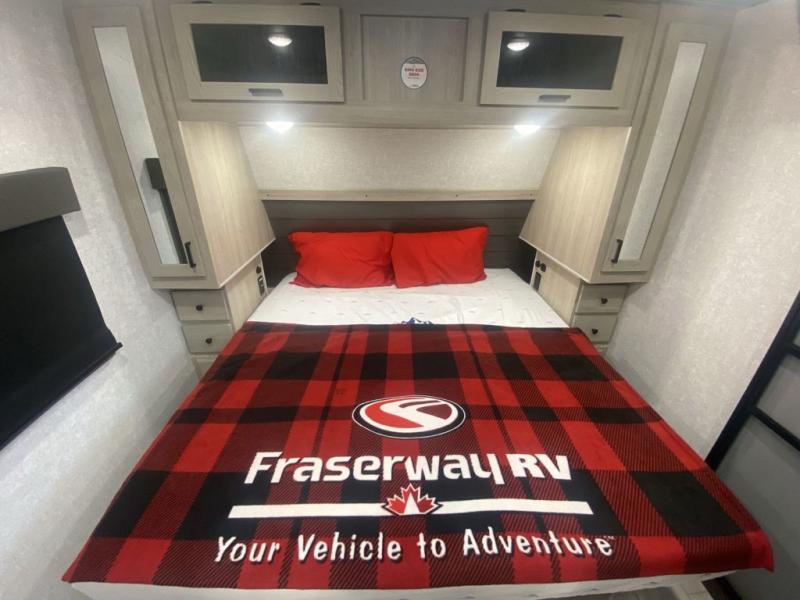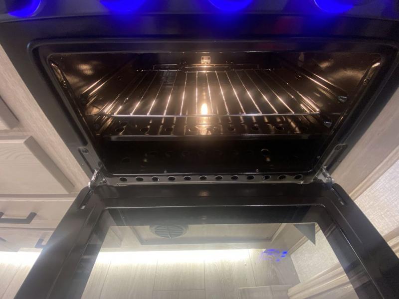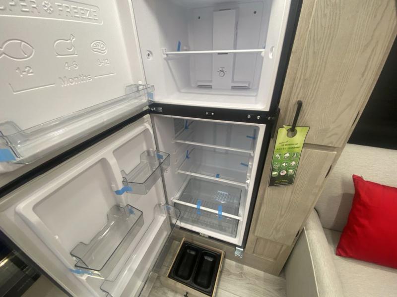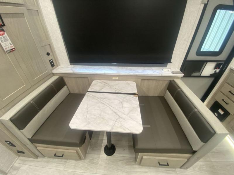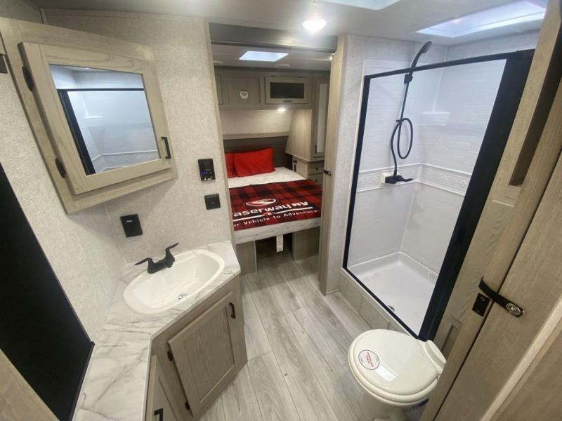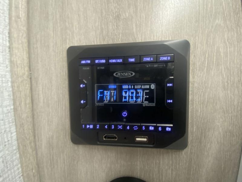 You can comfortably sleep four in this travel trailer thanks to the Tri- Fold Sofa and a king bed. There is also additional space as in the overhead cabinets, dual wardrobes and night stands. The combined living area and kitchen includes a Tri-fold Sofa with optional theater seats, a booth dinette with storage under it, plus a 50" TV. Great accessibility thanks to the two entry doors. In the exterior, there is also a 19' awning and a pass-trough storage. Finally after a long day take a comfortable and relaxing shower in our walk trough bathroom.