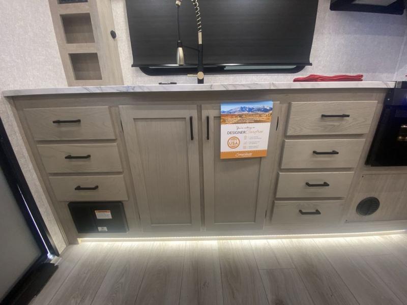 Each Alta travel trailer or toy hauler by EAST TO WEST is constructed with a 5" vacuum bonded roof, an enclosed and heated underbelly, and diamond plate front rock guard for added protection. Outside, you'll find marine-grade exterior speakers, a universal docking station, and back-up camera prep that can be added to make maneuvering in and out of campgrounds easier than ever. Inside, there are 4k interior LED lights, solid pressed membrane countertops, black roller shades, and many more interior comforts you are sure to love.