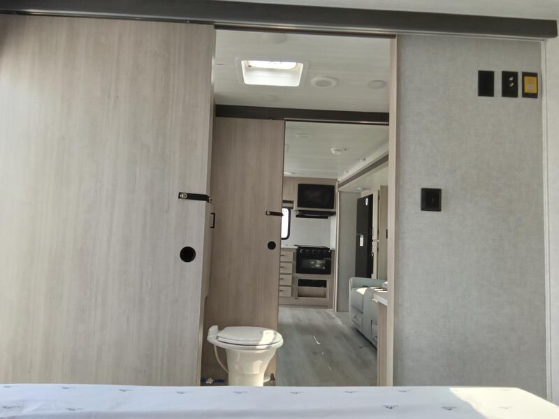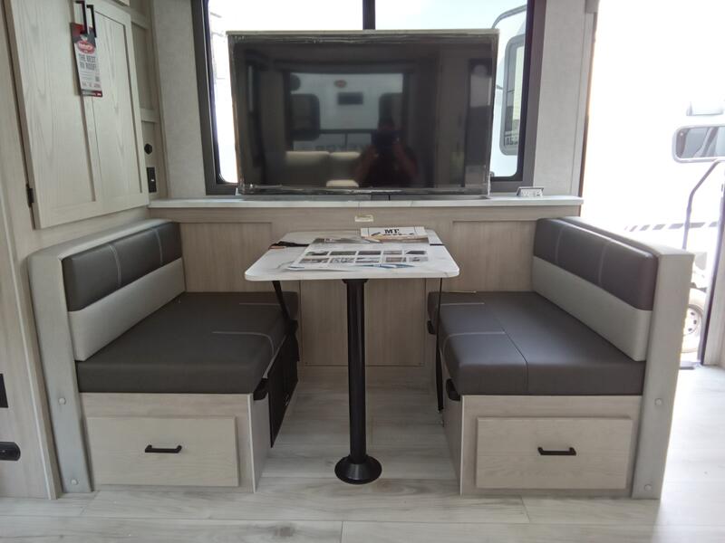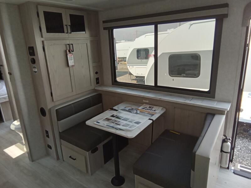 You can comfortably sleep four in this travel trailer thanks to the Tri- Fold Sofa and a king bed. There is also additional space as in the overhead cabinets, dual wardrobes and night stands. The combined living area and kitchen includes a Tri-fold Sofa with optional theater seats, a booth dinette with storage under it, plus a 50" TV. Great accessibility thanks to the two entry doors. In the exterior, there is also a 19' awning and a pass-trough storage. Finally after a long day take a comfortable and relaxing shower in our walk trough bathroom.