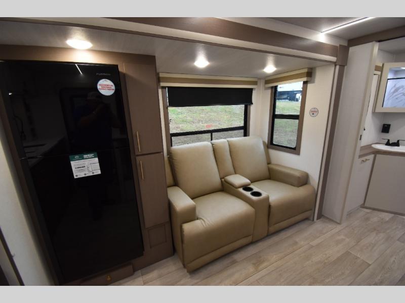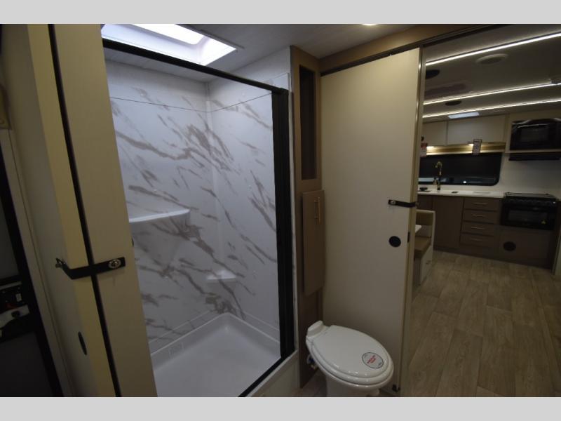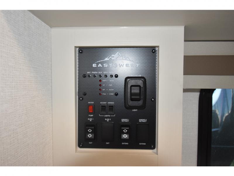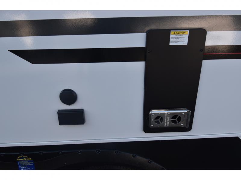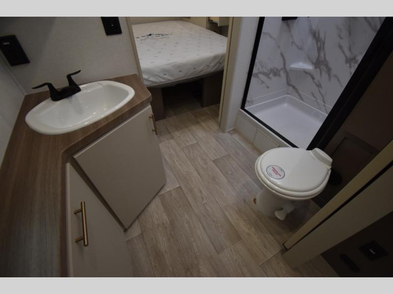 You can comfortably sleep four in this travel trailer thanks to the Tri- Fold Sofa and a king bed. There is also additional space as in the overhead cabinets, dual wardrobes and night stands. The combined living area and kitchen includes a Tri-fold Sofa with optional theater seats, a booth dinette with storage under it, plus a 50" TV. Great accessibility thanks to the two entry doors. In the exterior, there is also a 19' awning and a pass-trough storage. Finally after a long day take a comfortable and relaxing shower in our walk trough bathroom.