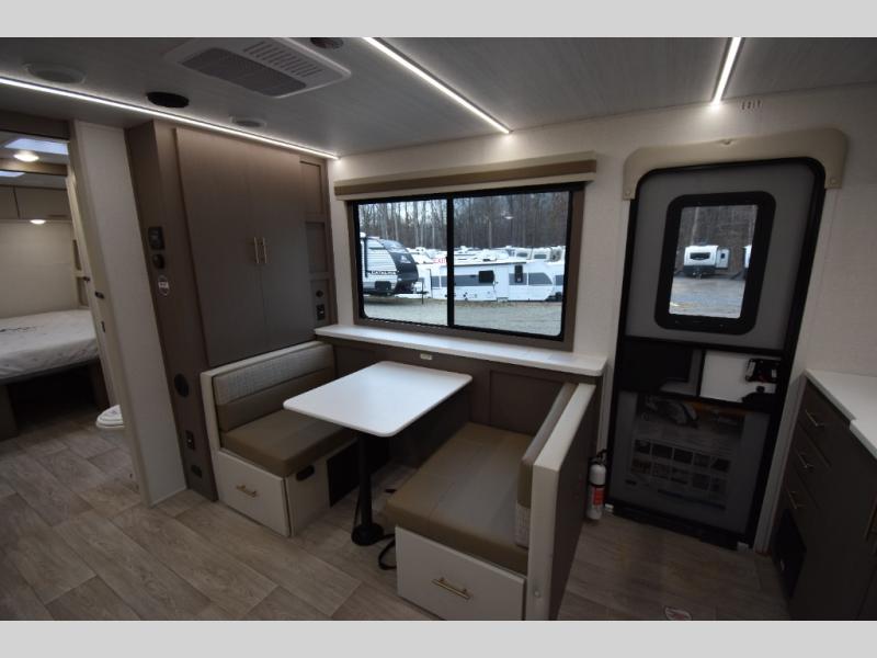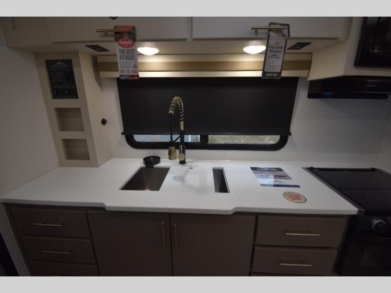 Each Alta travel trailer or toy hauler by EAST TO WEST is constructed with a 5" vacuum bonded roof, an enclosed and heated underbelly, and diamond plate front rock guard for added protection. Outside, you'll find marine-grade exterior speakers, a universal docking station, and back-up camera prep that can be added to make maneuvering in and out of campgrounds easier than ever. Inside, there are 4k interior LED lights, solid pressed membrane countertops, black roller shades, and many more interior comforts you are sure to love.