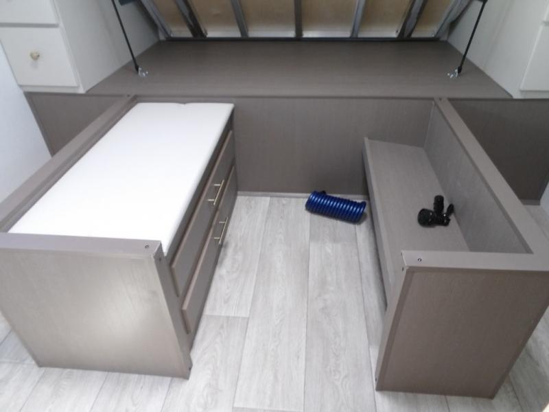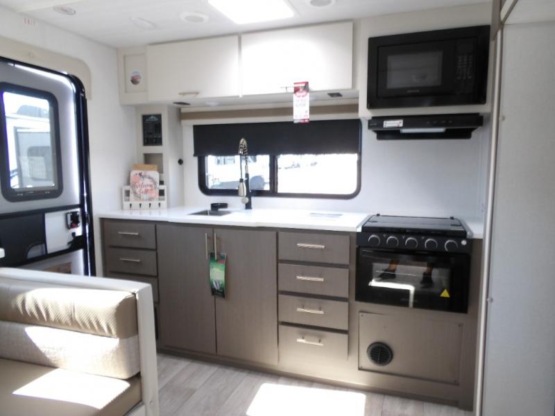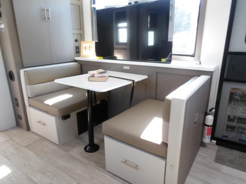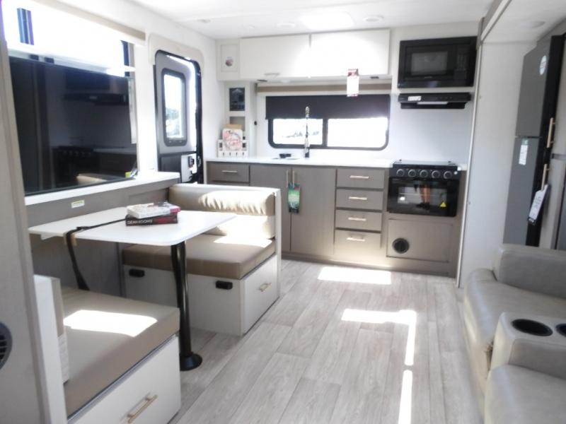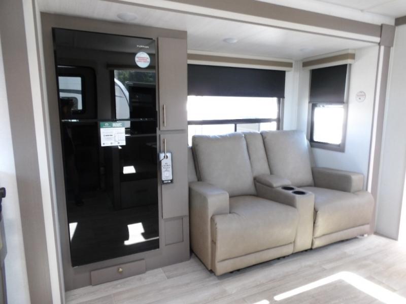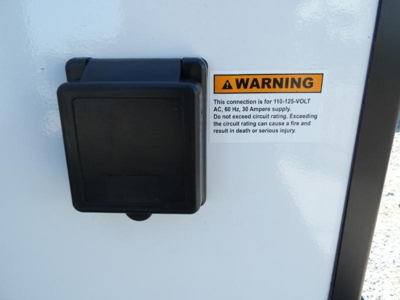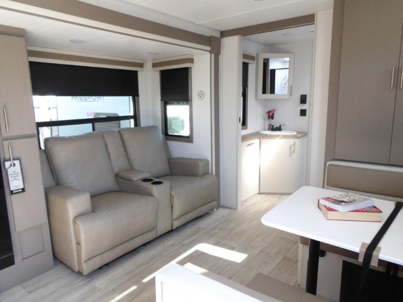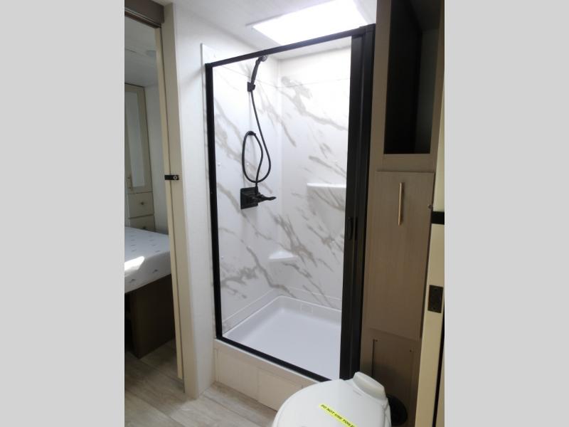 You can comfortably sleep four in this travel trailer thanks to the Tri- Fold Sofa and a king bed. There is also additional space as in the overhead cabinets, dual wardrobes and night stands. The combined living area and kitchen includes a Tri-fold Sofa with optional theater seats, a booth dinette with storage under it, plus a 50" TV. Great accessibility thanks to the two entry doors. In the exterior, there is also a 19' awning and a pass-trough storage. Finally after a long day take a comfortable and relaxing shower in our walk trough bathroom.