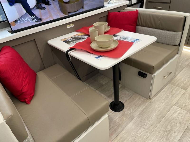 You can comfortably sleep four in this travel trailer thanks to the Tri- Fold Sofa and a king bed. There is also additional space as in the overhead cabinets, dual wardrobes and night stands. The combined living area and kitchen includes a Tri-fold Sofa with optional theater seats, a booth dinette with storage under it, plus a 50" TV. Great accessibility thanks to the two entry doors. In the exterior, there is also a 19' awning and a pass-trough storage. Finally after a long day take a comfortable and relaxing shower in our walk trough bathroom.