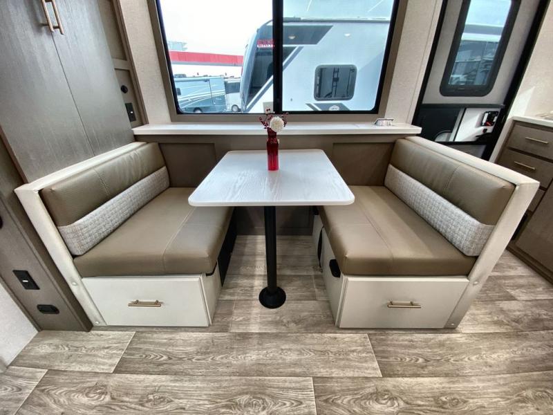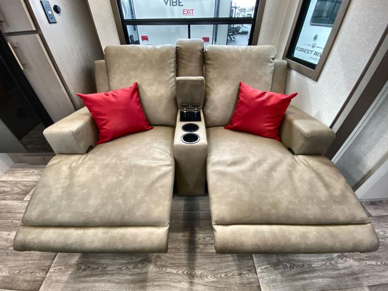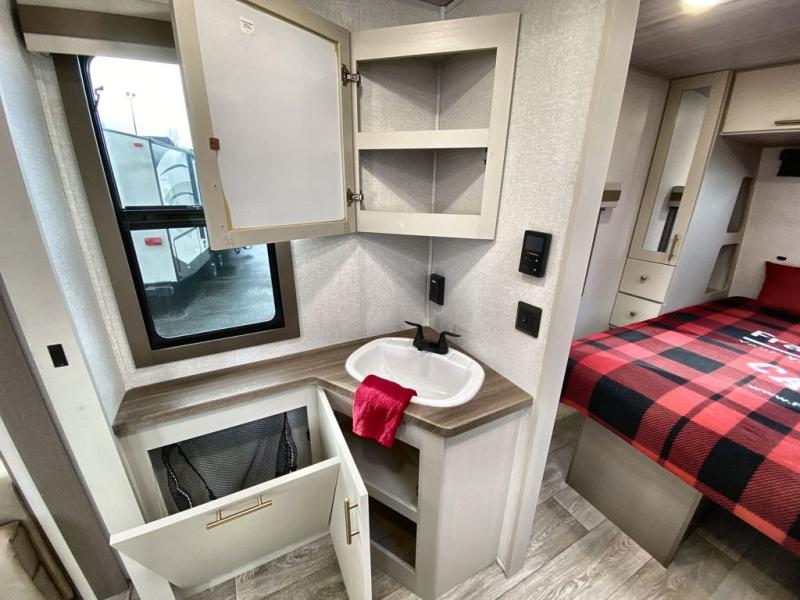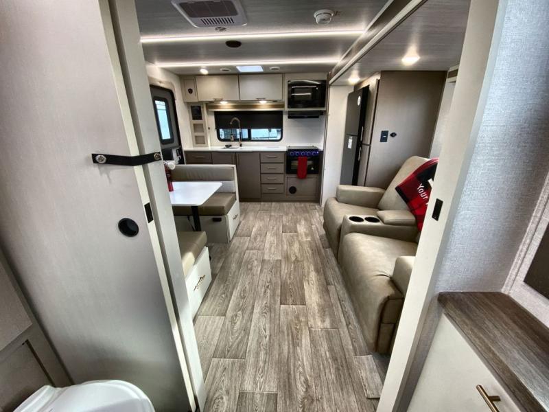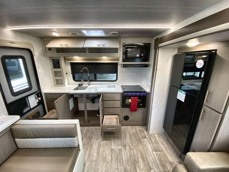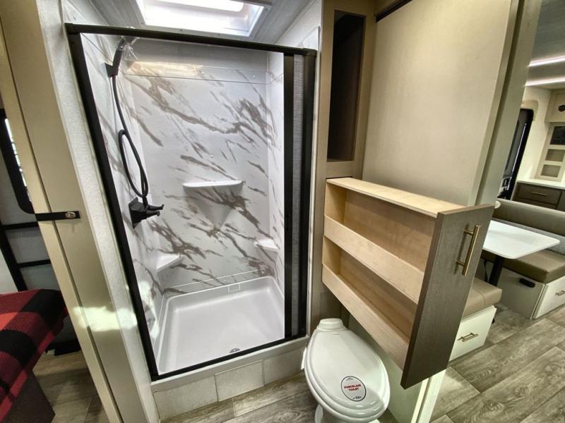 You can comfortably sleep four in this travel trailer thanks to the Tri- Fold Sofa and a king bed. There is also additional space as in the overhead cabinets, dual wardrobes and night stands. The combined living area and kitchen includes a Tri-fold Sofa with optional theater seats, a booth dinette with storage under it, plus a 50" TV. Great accessibility thanks to the two entry doors. In the exterior, there is also a 19' awning and a pass-trough storage. Finally after a long day take a comfortable and relaxing shower in our walk trough bathroom.