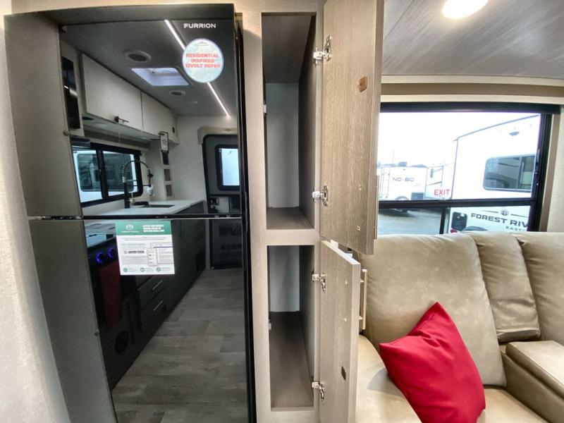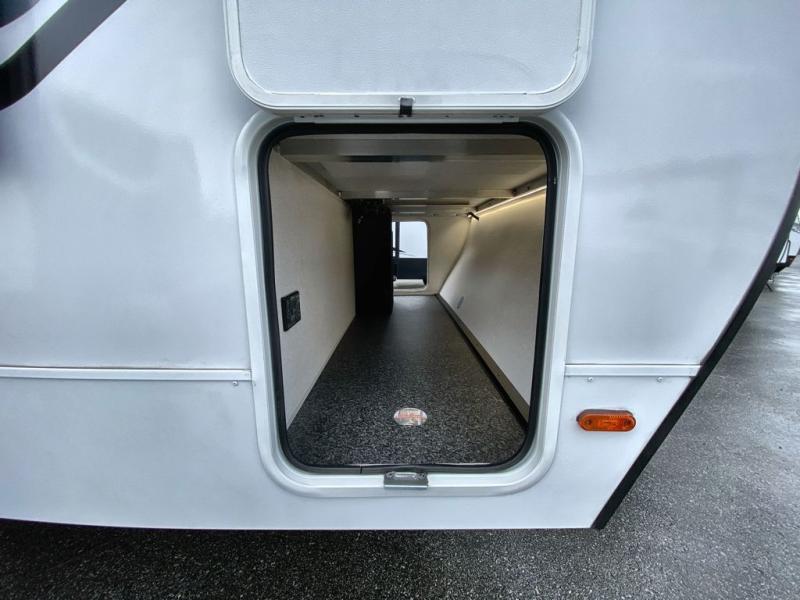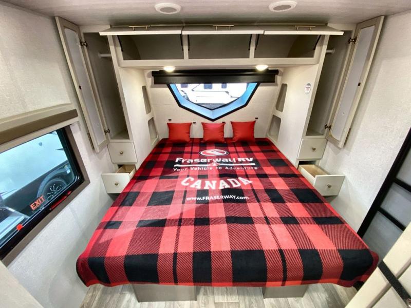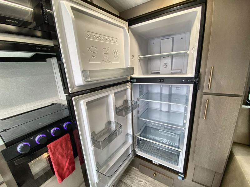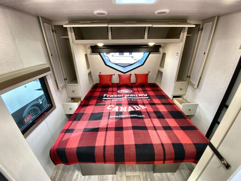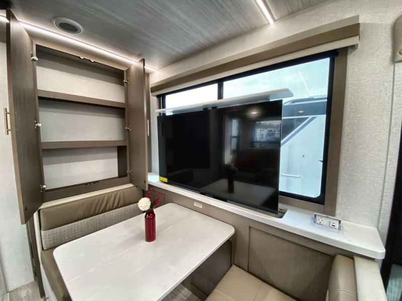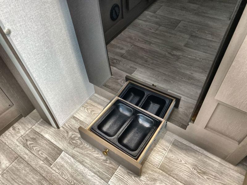 You can comfortably sleep four in this travel trailer thanks to the Tri- Fold Sofa and a king bed. There is also additional space as in the overhead cabinets, dual wardrobes and night stands. The combined living area and kitchen includes a Tri-fold Sofa with optional theater seats, a booth dinette with storage under it, plus a 50" TV. Great accessibility thanks to the two entry doors. In the exterior, there is also a 19' awning and a pass-trough storage. Finally after a long day take a comfortable and relaxing shower in our walk trough bathroom.