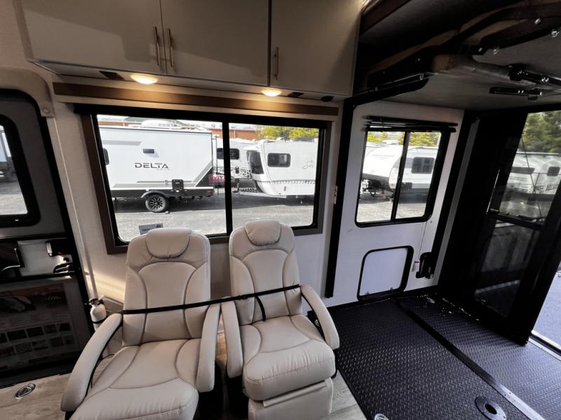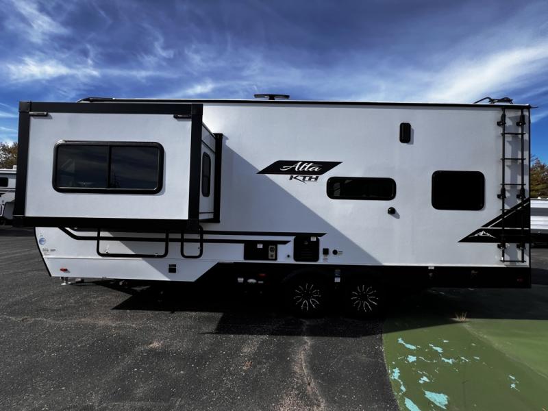 You will love camping in this Alta toy hauler! The 2400KTH offers a 13' 6" garage so there is plenty of room for all your toys. A Happi-jack with bunk and a rear ramp door with patio kit mean you will get lots of flexible use out of the space. The kitchen comes with a stainless steel refrigerator and three-burner range, and you can relax by the fireplace after dinner. At night retire to the front bedroom with its king bed, wardrobe, dresser, and dual entry bath with shower and skylight. This model also comes with the mandatory West Coach Power Package with a 400 watt solar panel, a 30 Amp controller and a second battery to keep you going!