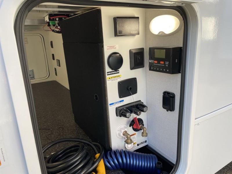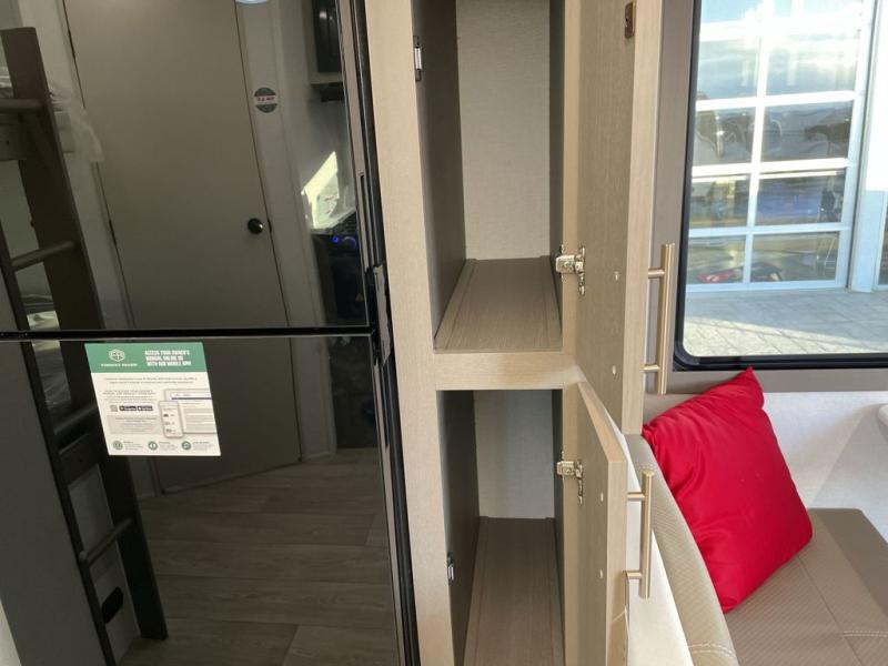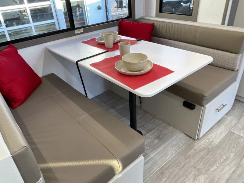 You can comfortably sleep four to six in this travel trailer thanks to the rear double bunk beds and a king bed. There is also additional storage where you will find plenty of space as well as in the overhead cabinets and dual wardrobes and night stands. The combined living area and kitchen includes a large slide for more space, and a booth dinette with an optional free-standing dinette. Great accessibility thanks to the two entry doors. In the exterior, there is also a 21´ awning and a Kayak door, especially for the adventurous ones! finally after a long day take a comfortable and relaxing shower in our full rear bathroom.