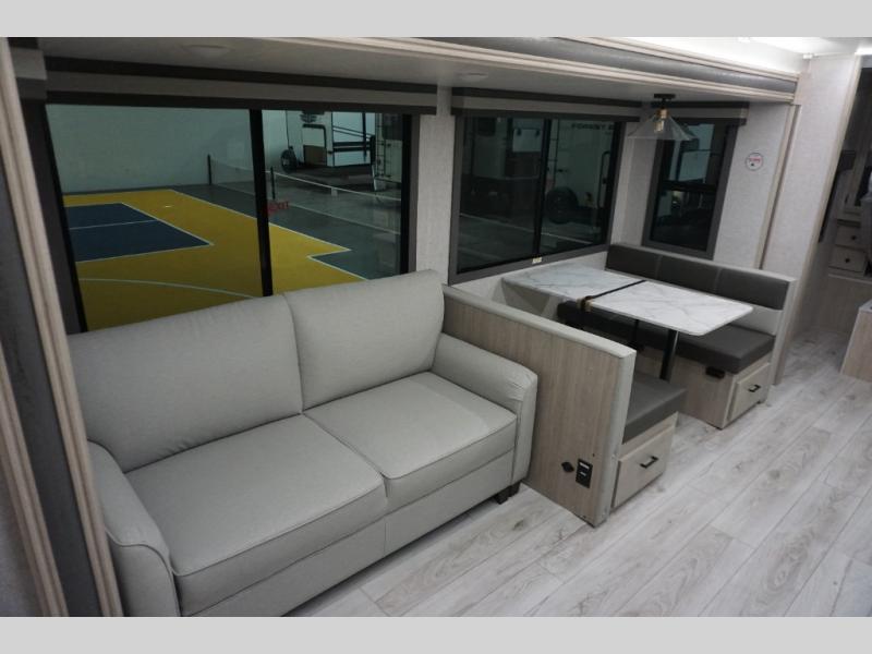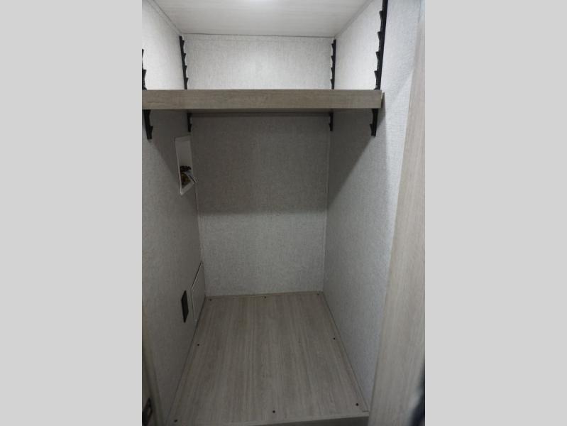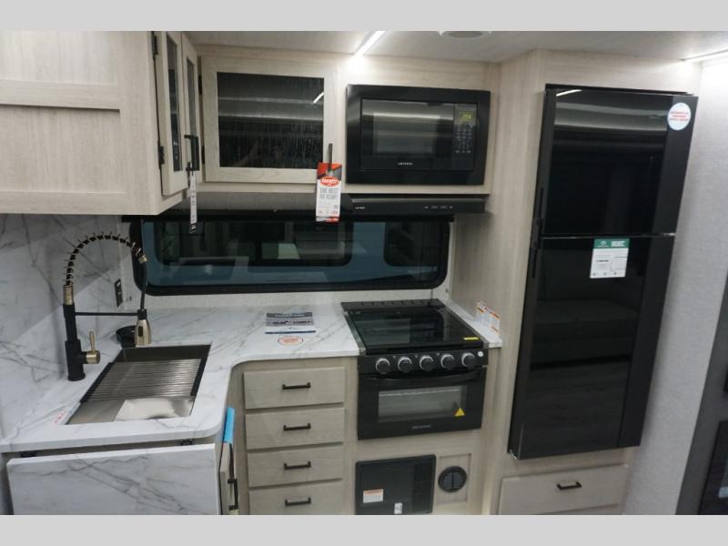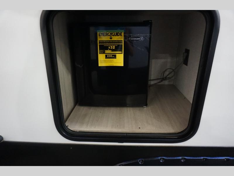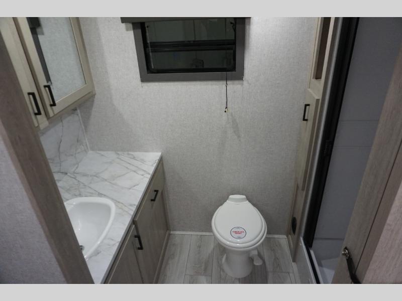 Wow! Check out the spacious full rear bath in this travel trailer for five! You'll appreciate a linen closet here and a shower skylight to let natural light in. Your crew can get comfortable on the tri-fold sofa that sits directly across from the fireplace for a more cozy feel. There is also a booth dinette here with storage space underneath for board games. Head to the kitchen to prepare dinner on the three burner cooktop, and use the countertop extension to cut fresh fruits and vegetables. A front private bedroom with a king bed and dual wardrobes will have you feeling right at home. Start camping today!